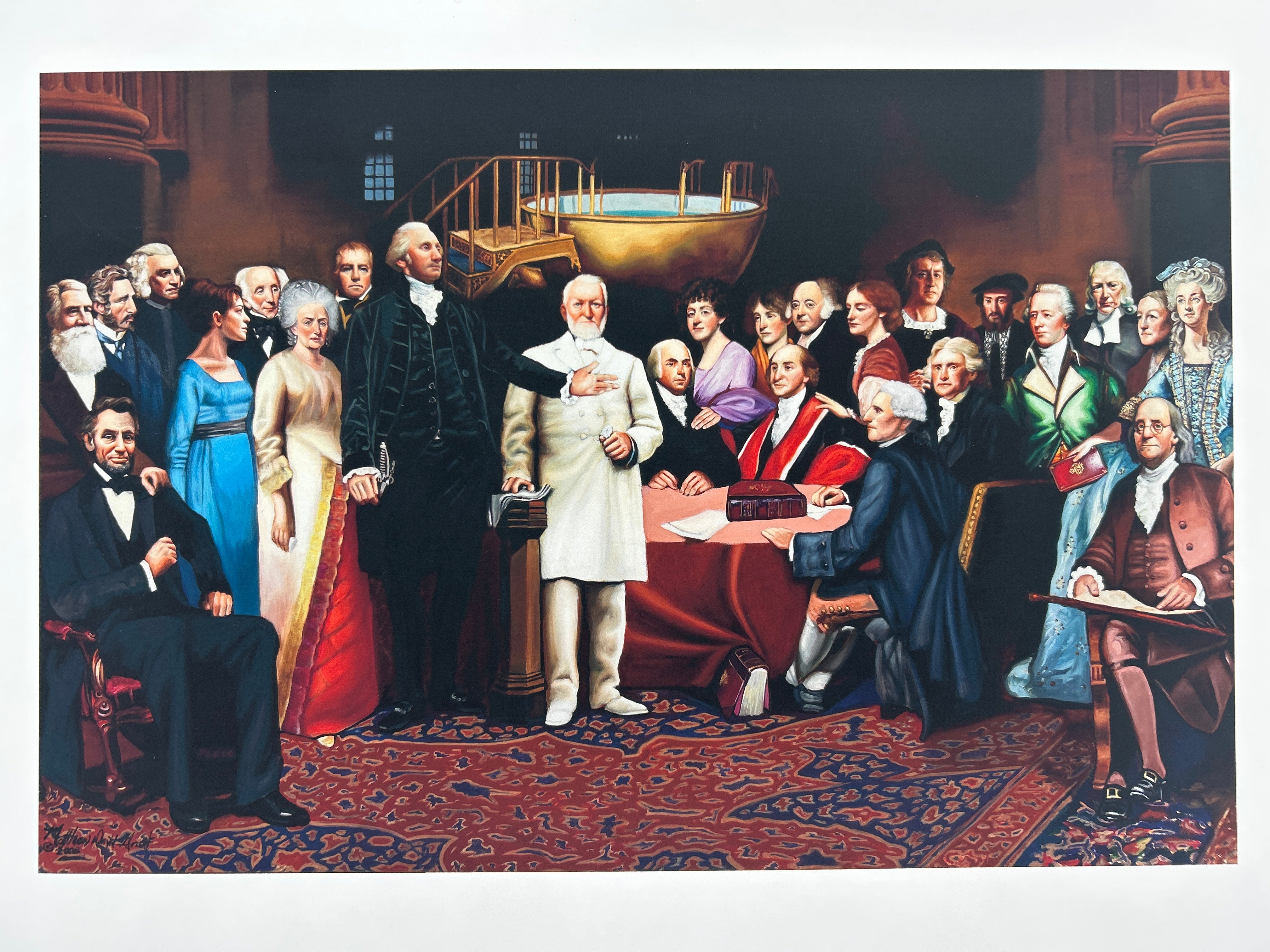 Between the St. George Temple and the Endowment House 180 eminent men and women's temple work were done. Out of those men and women Reid Moon has chosen his favorites to be painted into this picture.