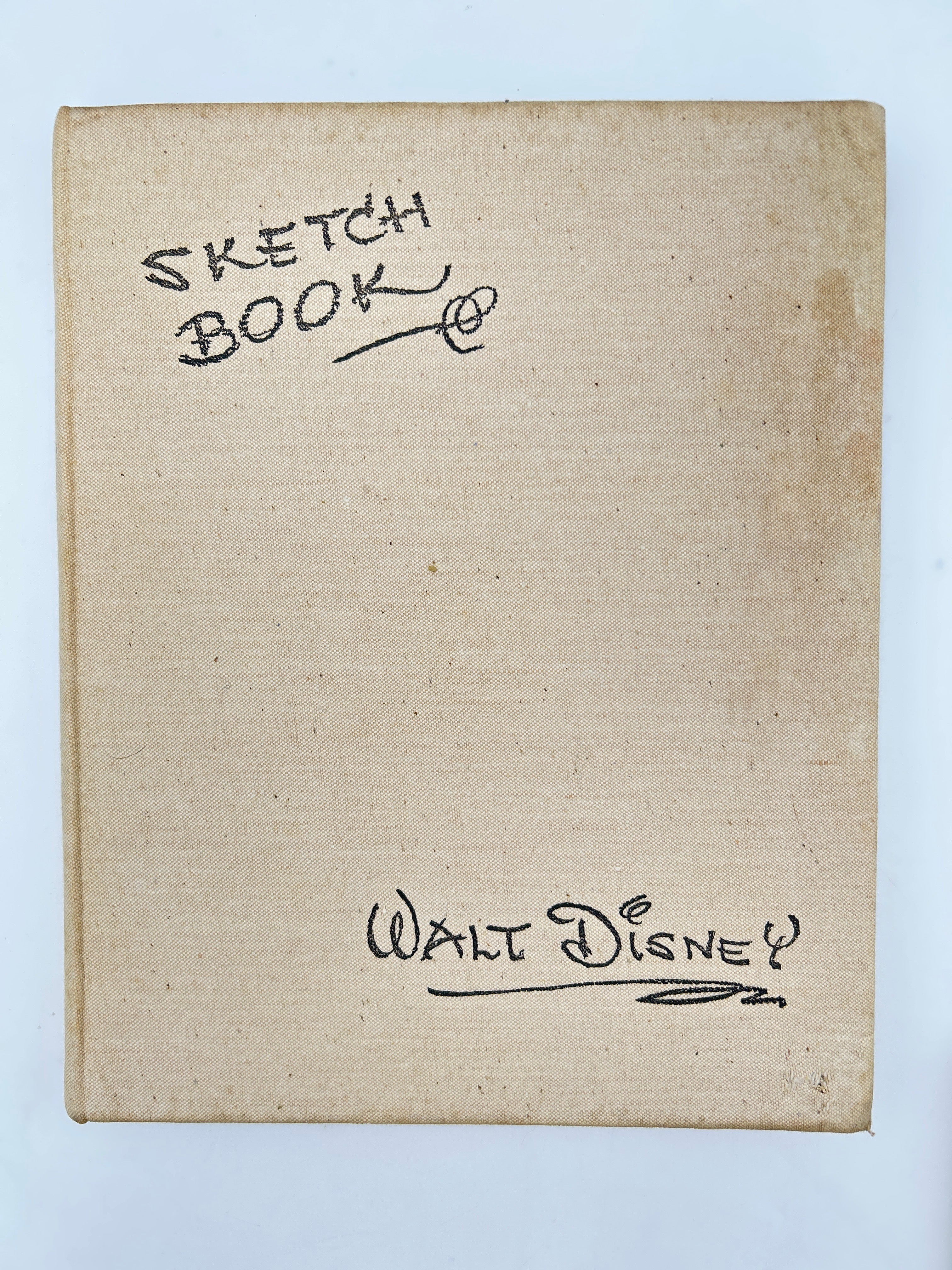 Fabric hardback with letters written on front "Sketch Book, Walt Disney" with rare dust jacket, some tearing to the upper right corner, in addition to slight wear on upper and lower spine, otherwise good condition.