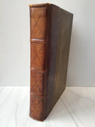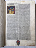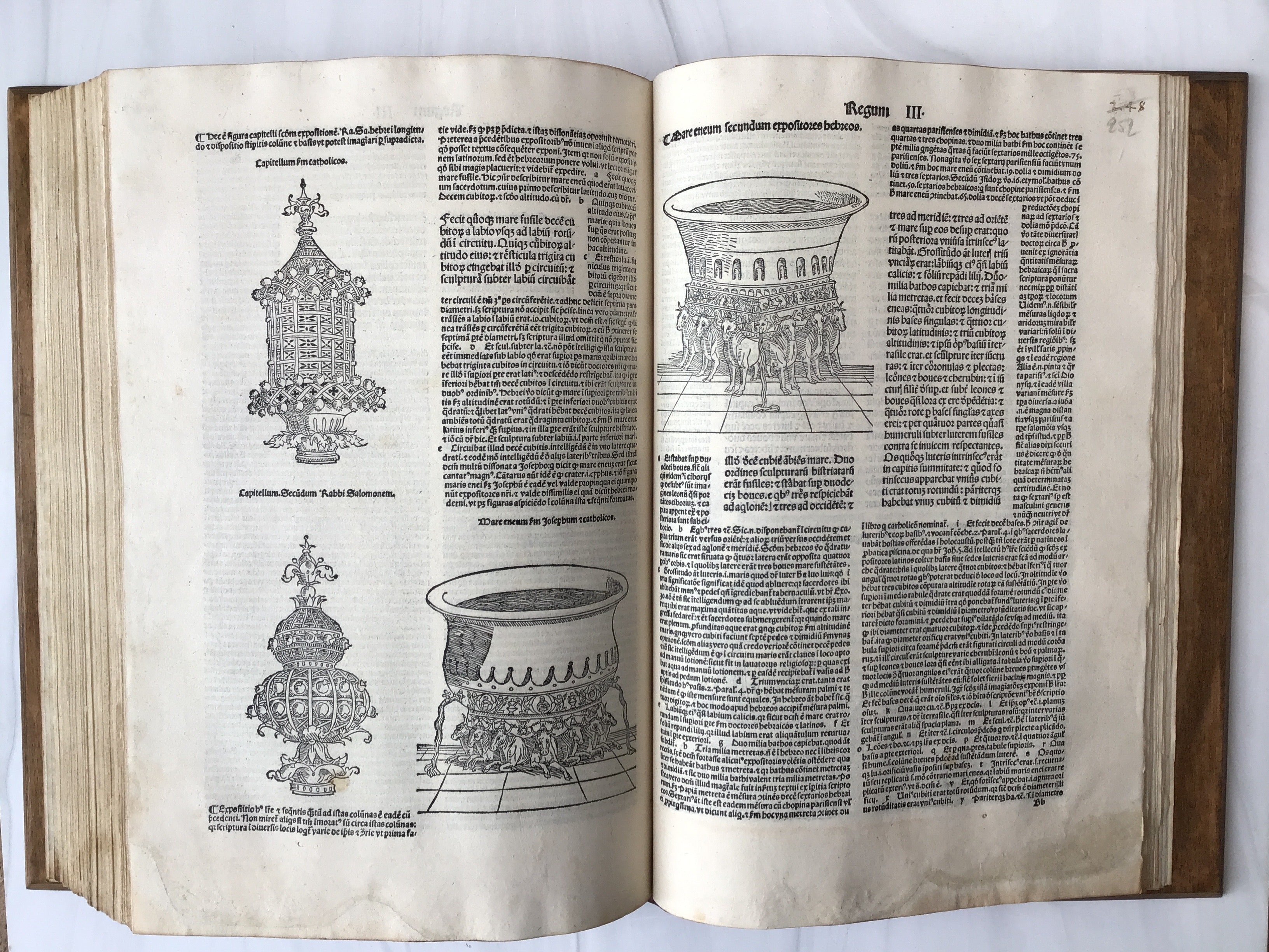 Printed in Venice, Ottaviano Scoto, 8 August 1489. Folio Size (14 x 9.25). Rebound in twentieth century. Half leather with wooden plank plates, three-ribbed spine with dry fillets crossed in the compartments. Gothic font, two columns per page. 74 lines of commentary surrounding the text. Woodcut illustrations throughout, one of which is a full page. Includes woodcut illustration of oxen baptismal font in the book of Kings. Some irrelevant woodworm holes on the first and last leaves. Two stains on the last page.