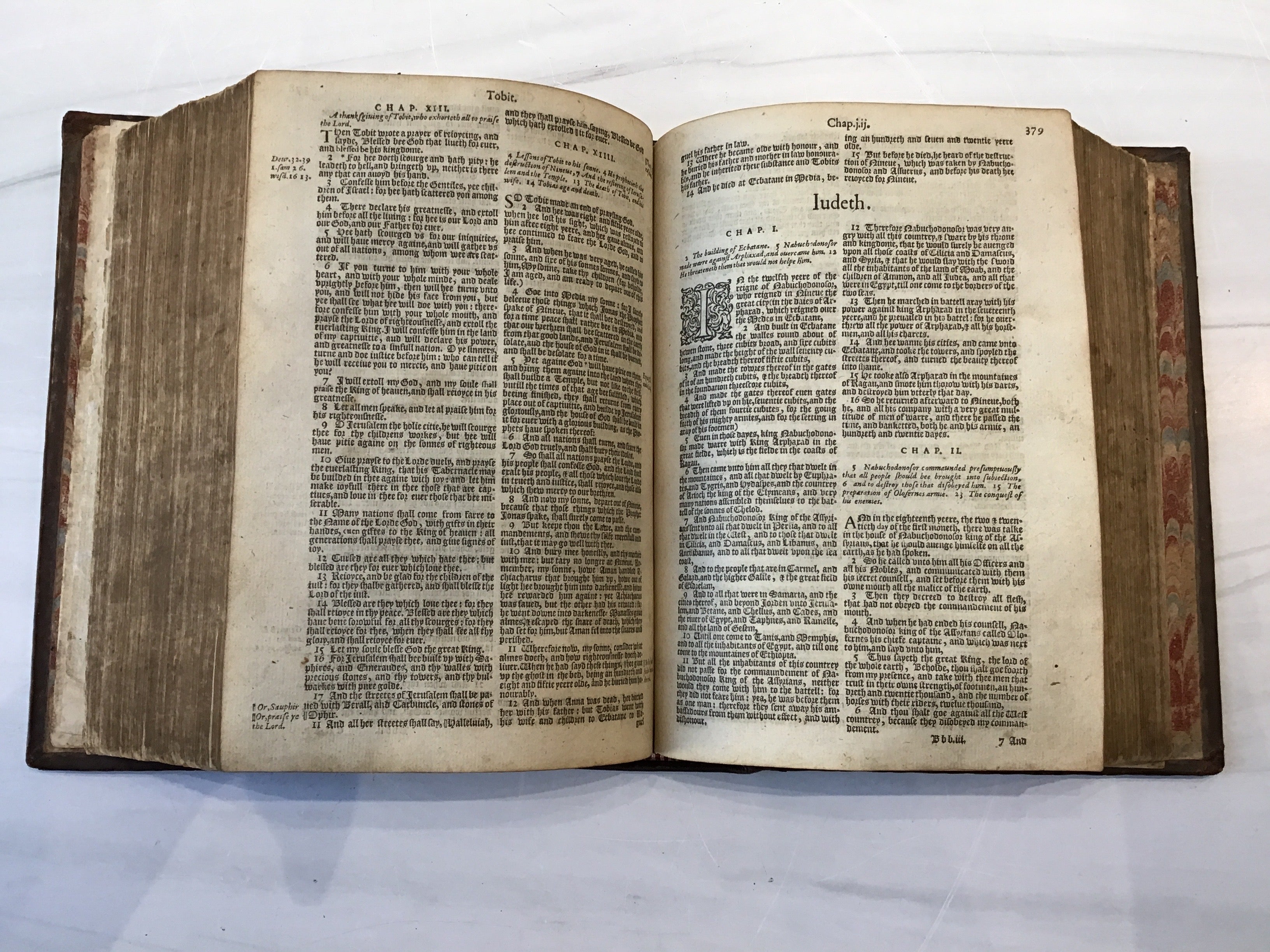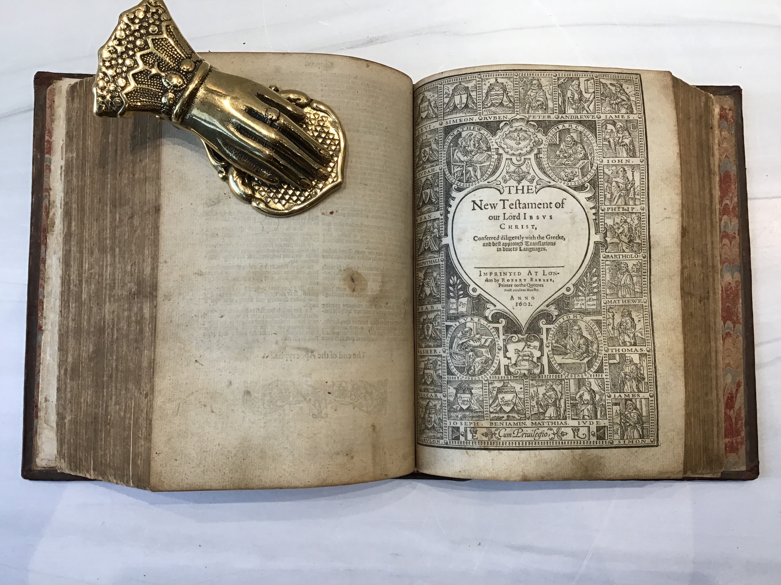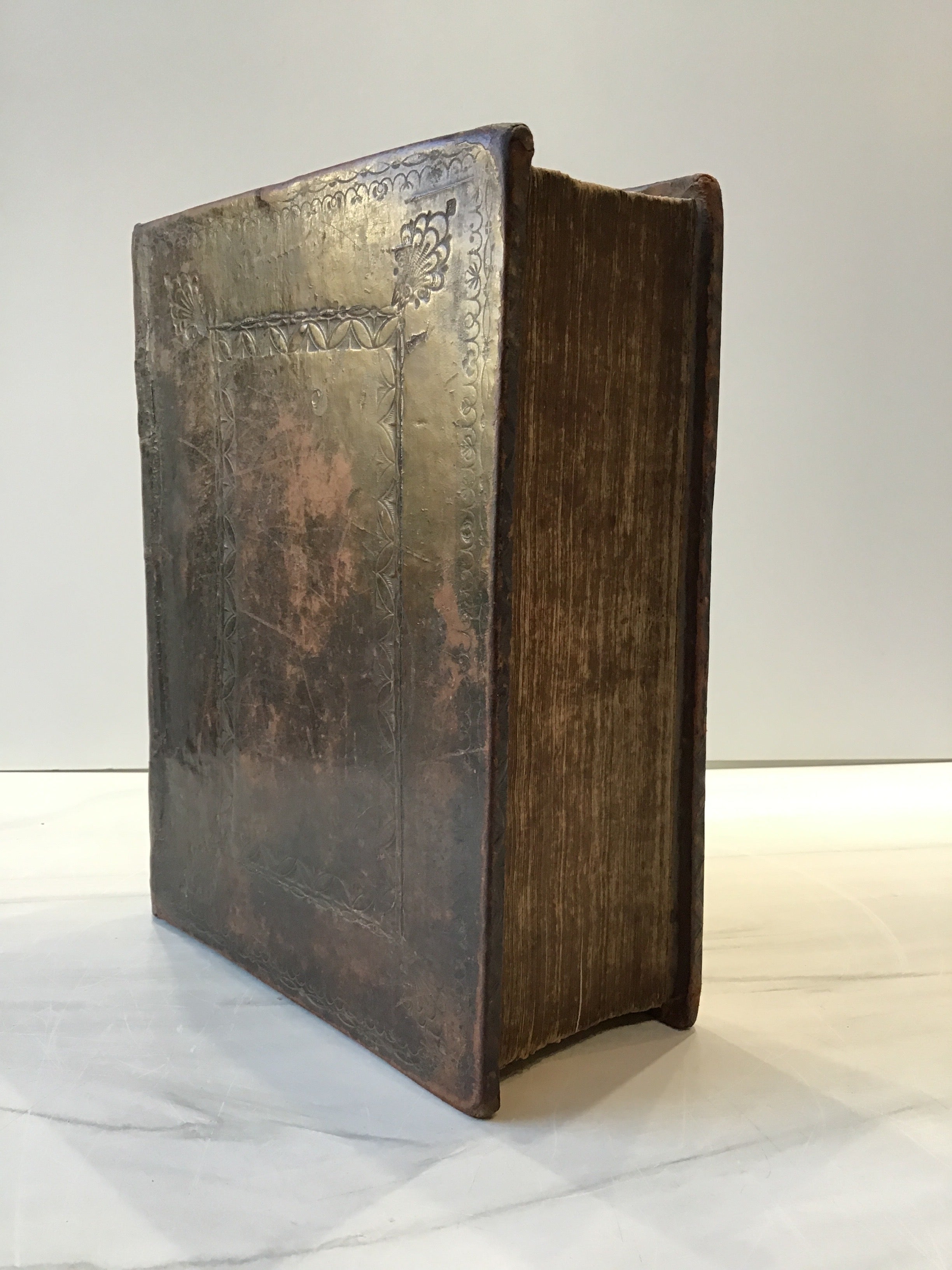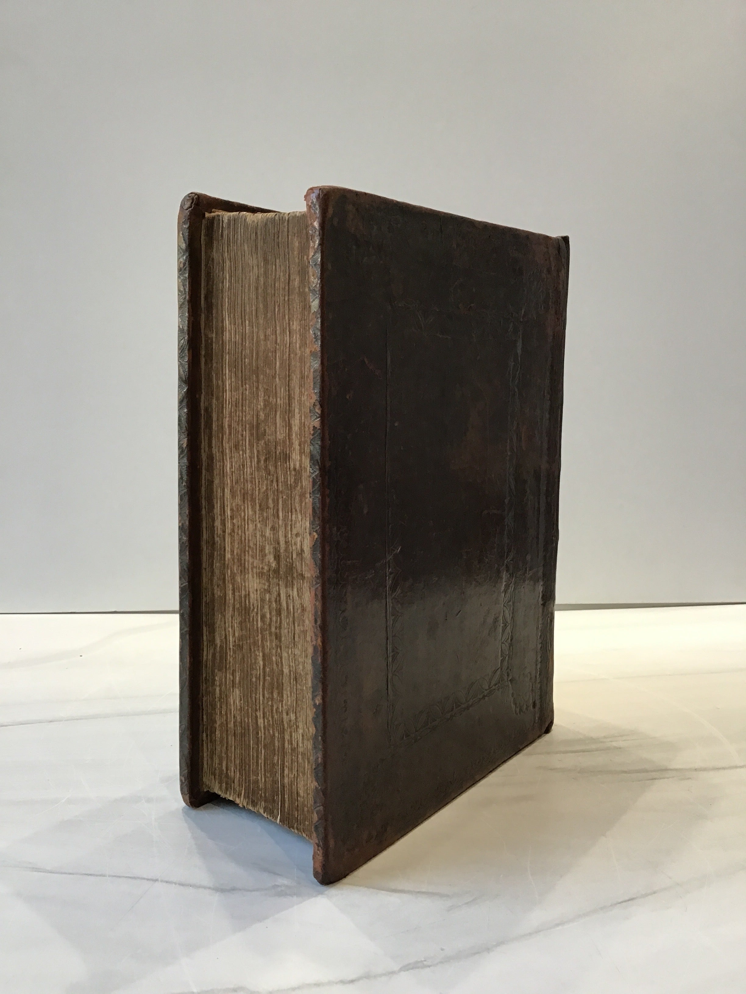A remarkable example of the 1602 Geneva Bible, featuring its original leather binding that includes embossed borders on front and back covers. Marbled endpapers. Rebacked to preserve structural integrity. The smooth brown leather rebacking is expertly done, seamlessly blending with the original boards; apart from the leather's textural difference. Text is printed in clear, legible black-letter type. All pages are present with light toning and some typical foxing. Minor wear to the corners, consistent with age, but overall, the volume is in very good condition for a Bible of this era.