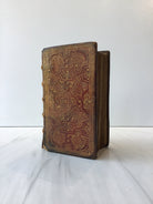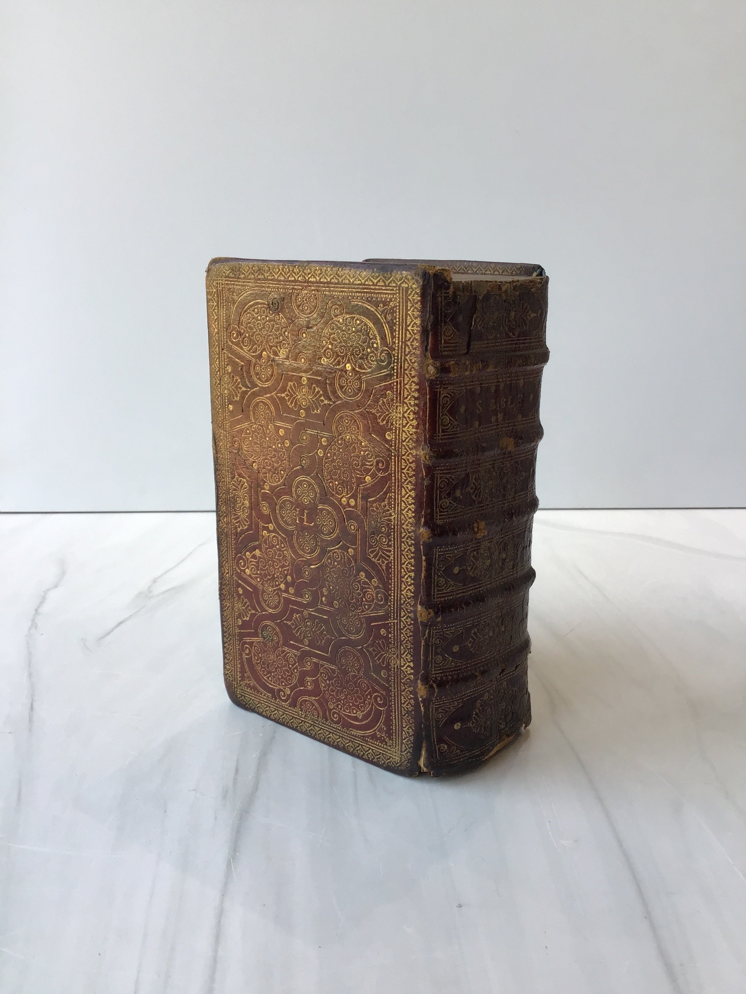 Burgundy with gold embossing, pocket edition, five raised bands, rubbing on upper, lower and front cover, three edge gold, intact, good conditiion.