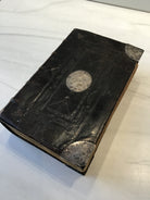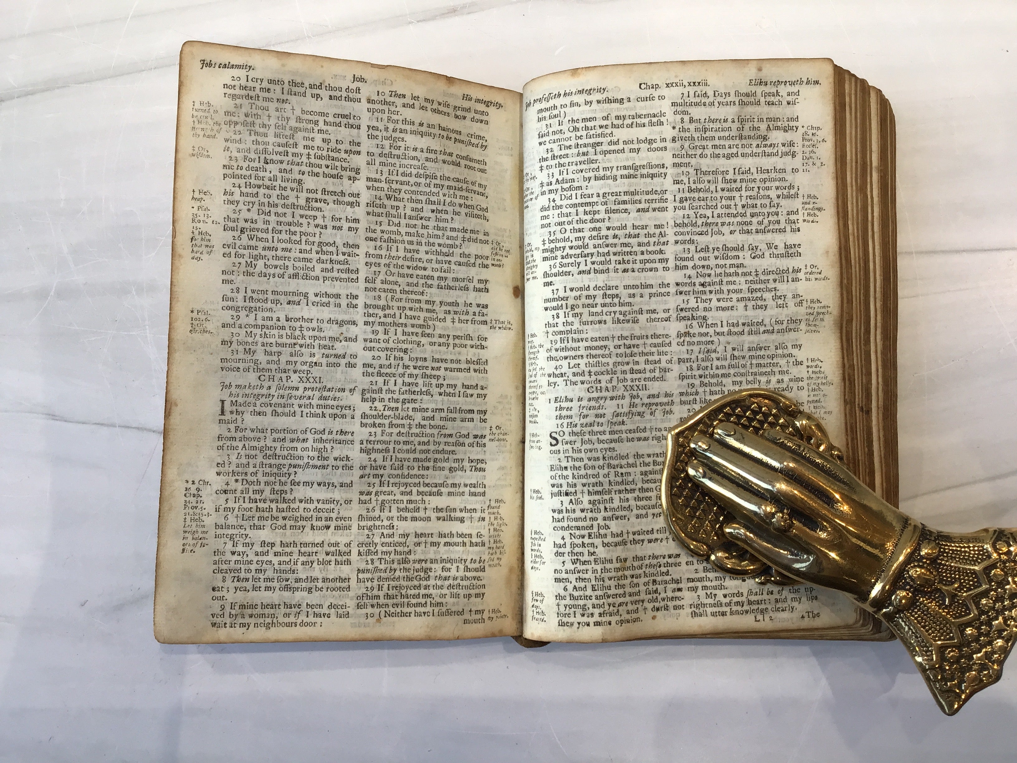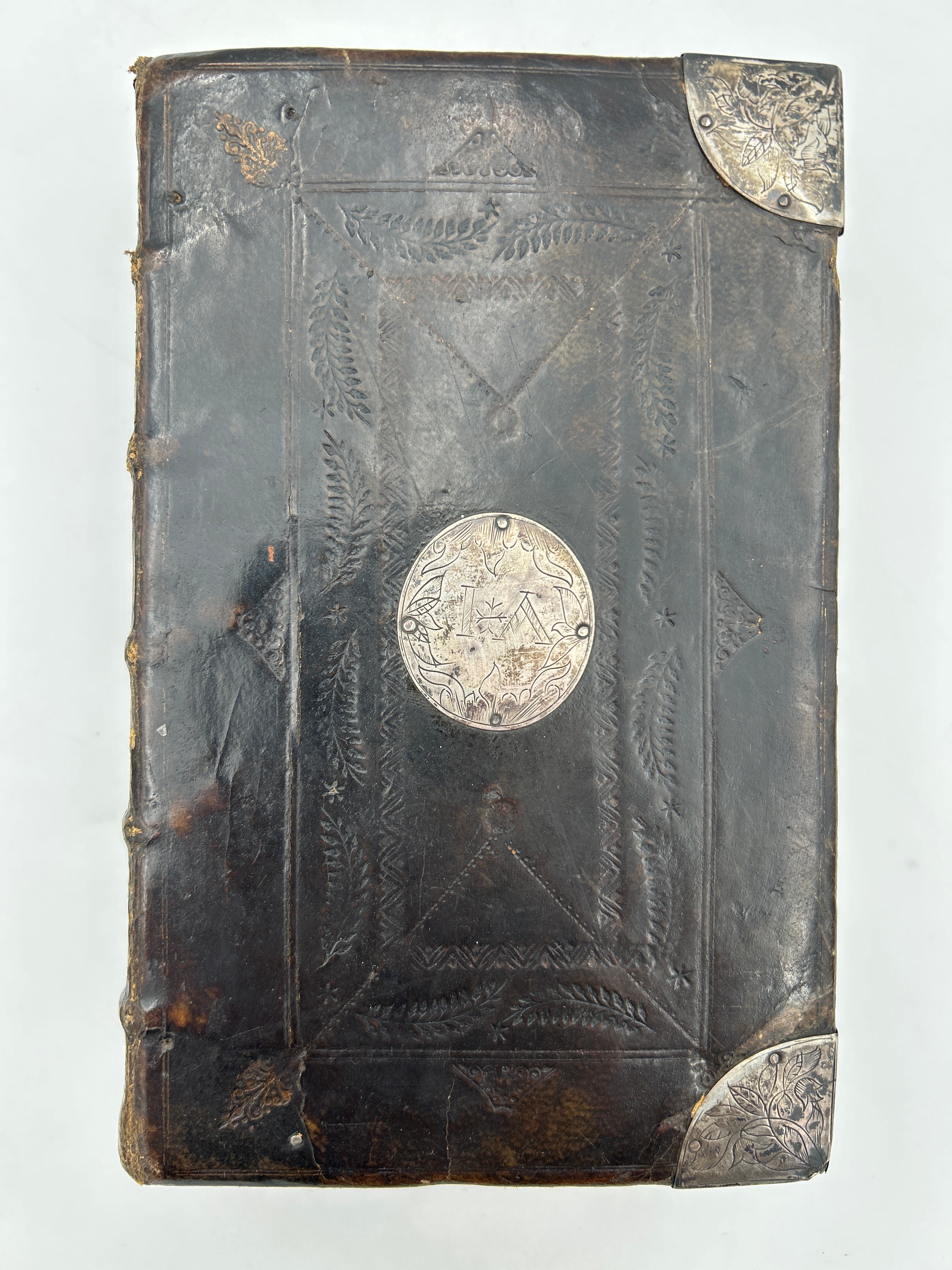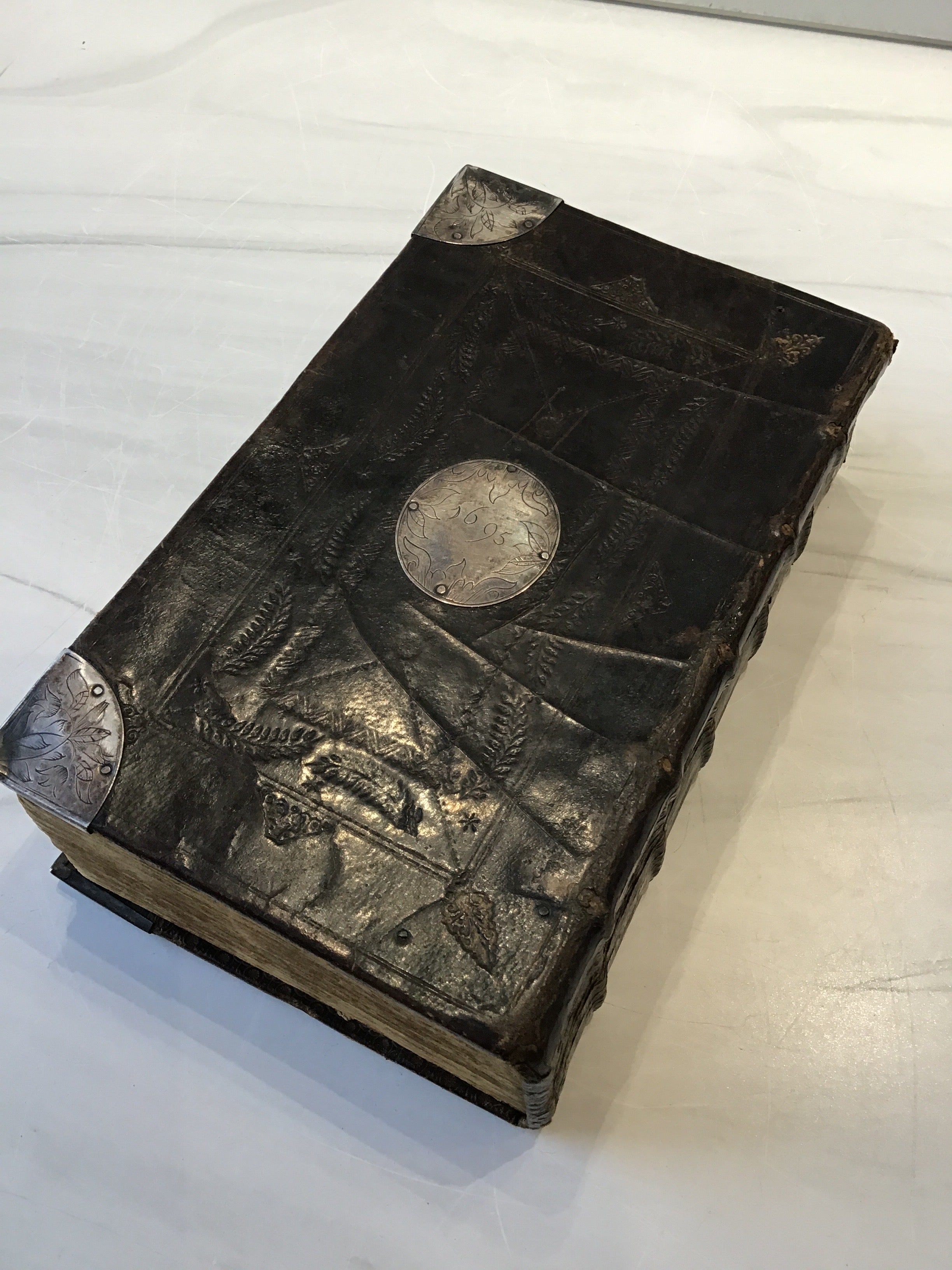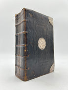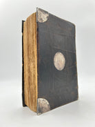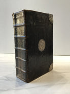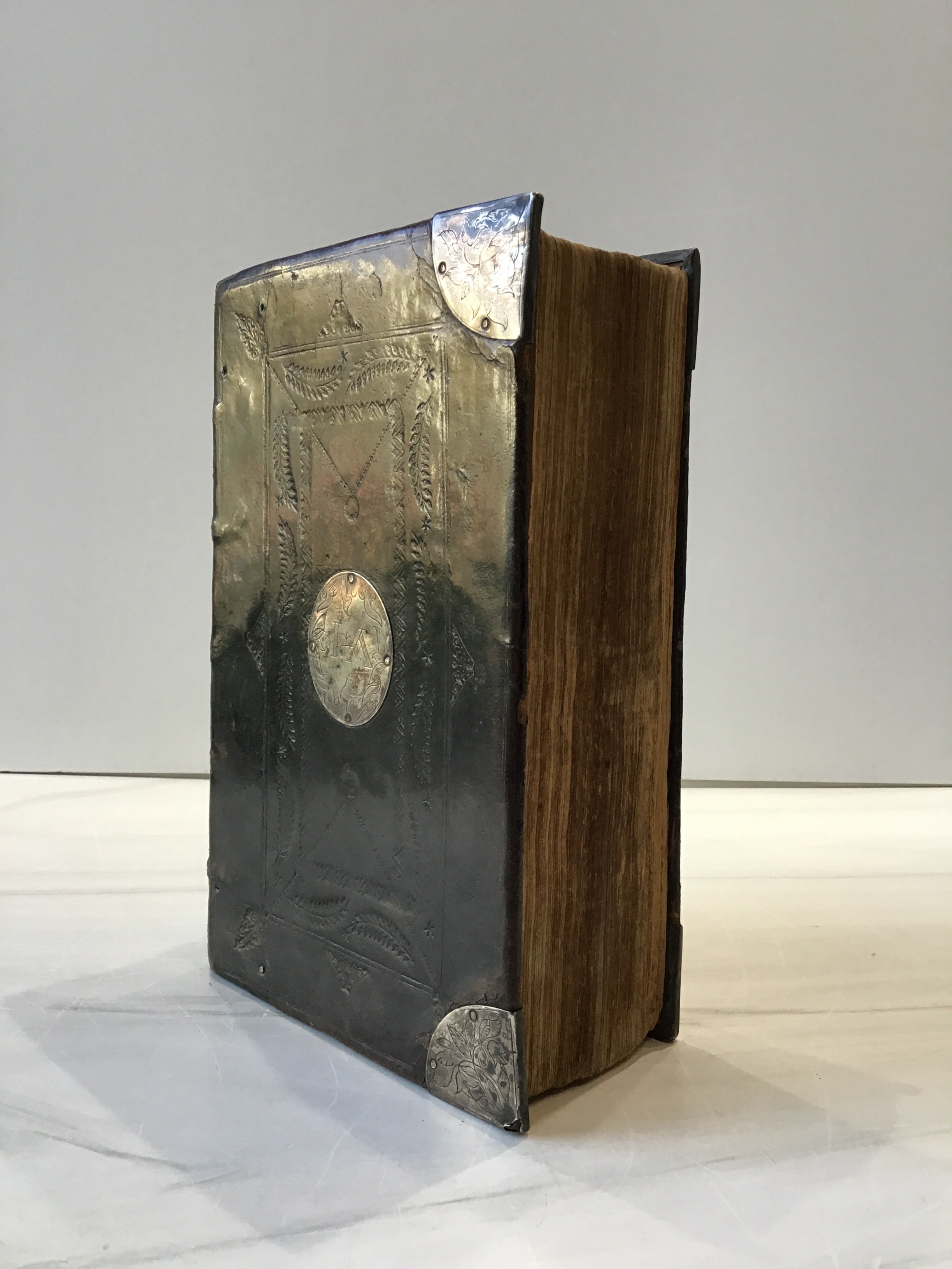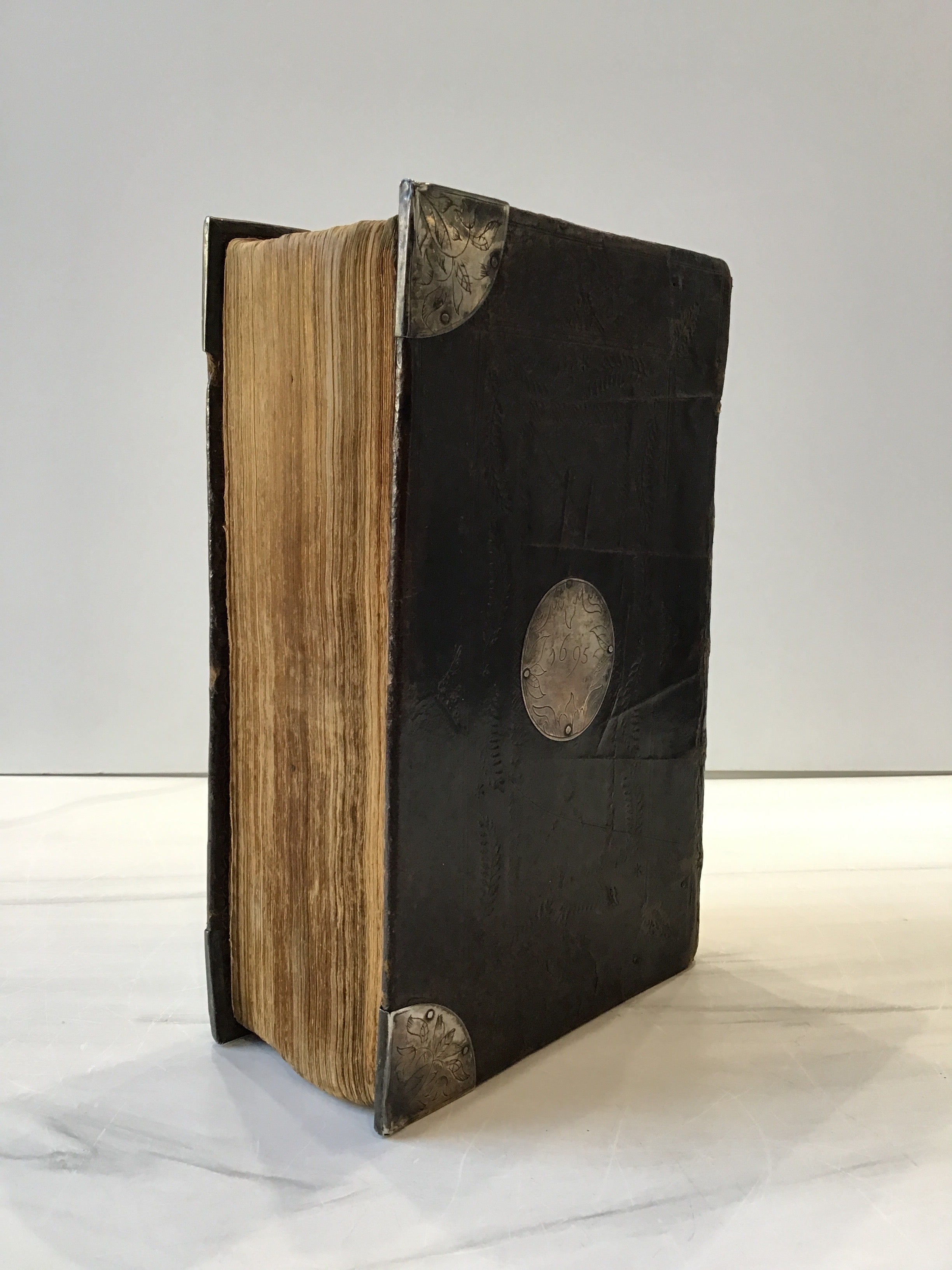 8vo. 7.48 x 4.72 inches. Engraved general title page dated 1682. Title page to New Testament dated 1694. Bound with the "Psalms of David in Meeter", dated 1693. Lacks first page of Genesis. Wear and small tearing to edges of first five pages, including marbled endpaper in front. Attractively bound in full paneled calf with embossed decorative border on front and back covers, faded gilt embossing on four border accents (two on each cover), five raised bands on spine, engraved silver corner pieces to outer corners and round silver center pieces, the one on the front cover engraved with the initials IA and the one on the back with the date 1695.
