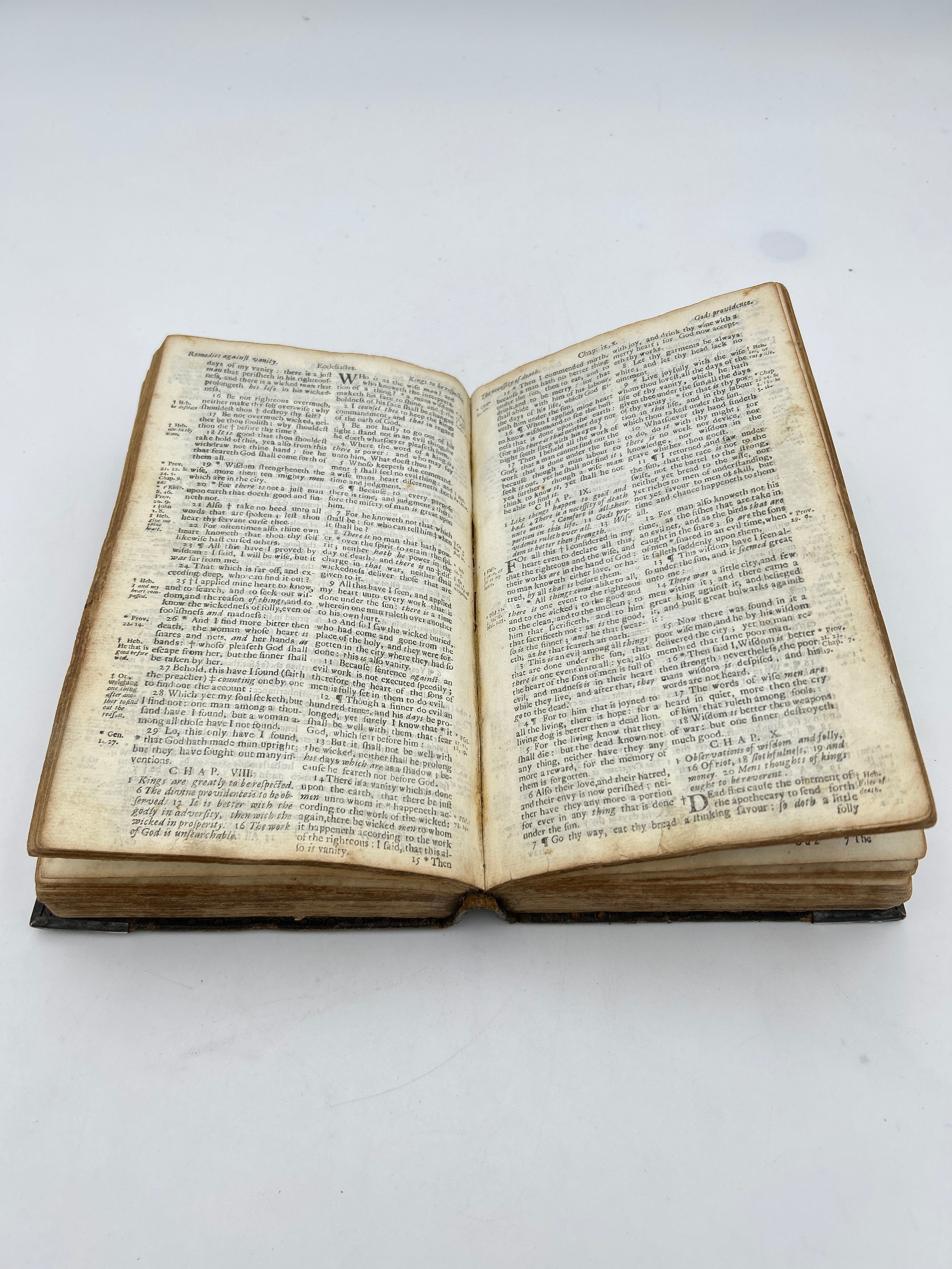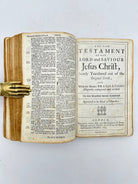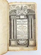Bibles printed in the late 1600s reflect a period of consolidation rather than major new translations, as earlier 17th-century versions had become firmly established. In England and its colonies, the King James Version overwhelmingly dominated, with printers focusing on correcting earlier errors, regularizing spelling and punctuation, and improving readability rather than altering the text itself. These late-17th-century editions appeared in a range of formats—from large folios for church use to smaller quartos and octavos for private reading such as this one—showing the growing demand for personal ownership. Decorative elements such as engraved title pages, maps, and genealogical tables became more common, while marginal notes were reduced compared to earlier study Bibles like the Geneva. The late 1600s was a time when the Bible’s printed form was becoming standardized, stable, and central to everyday religious life.