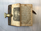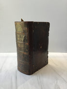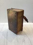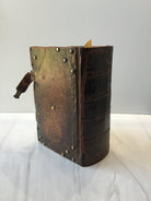 Rich brown leather, brass studs on front and back, four raised bands on spine, enclosure straps (one missing), marble end papers, intact, good condition.