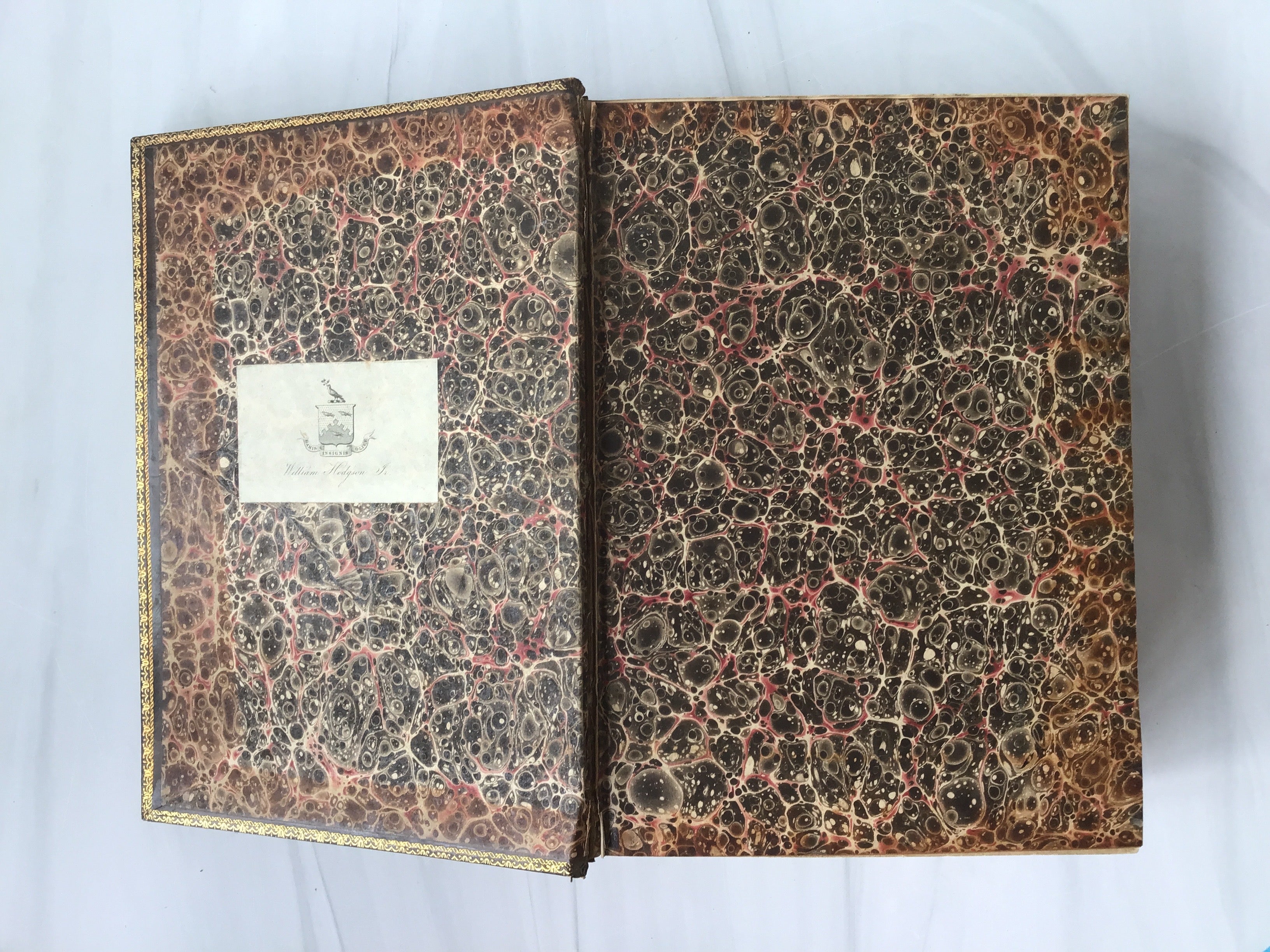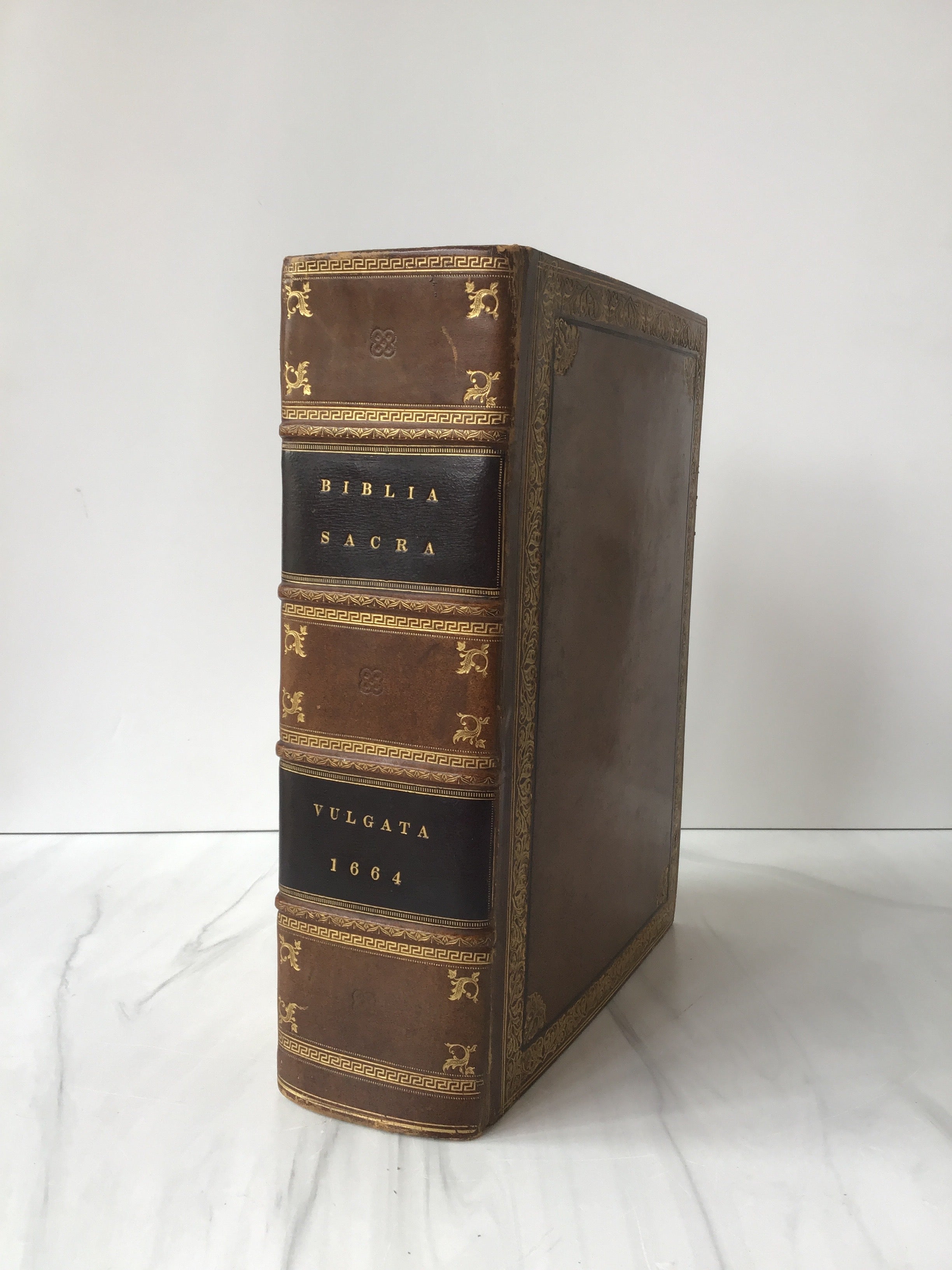 Brown leather with gold embossing front, back and spine, four raised bands with black labels on spine reading, "Biblia Sacra" and "Vulgate 1664", very good condition.