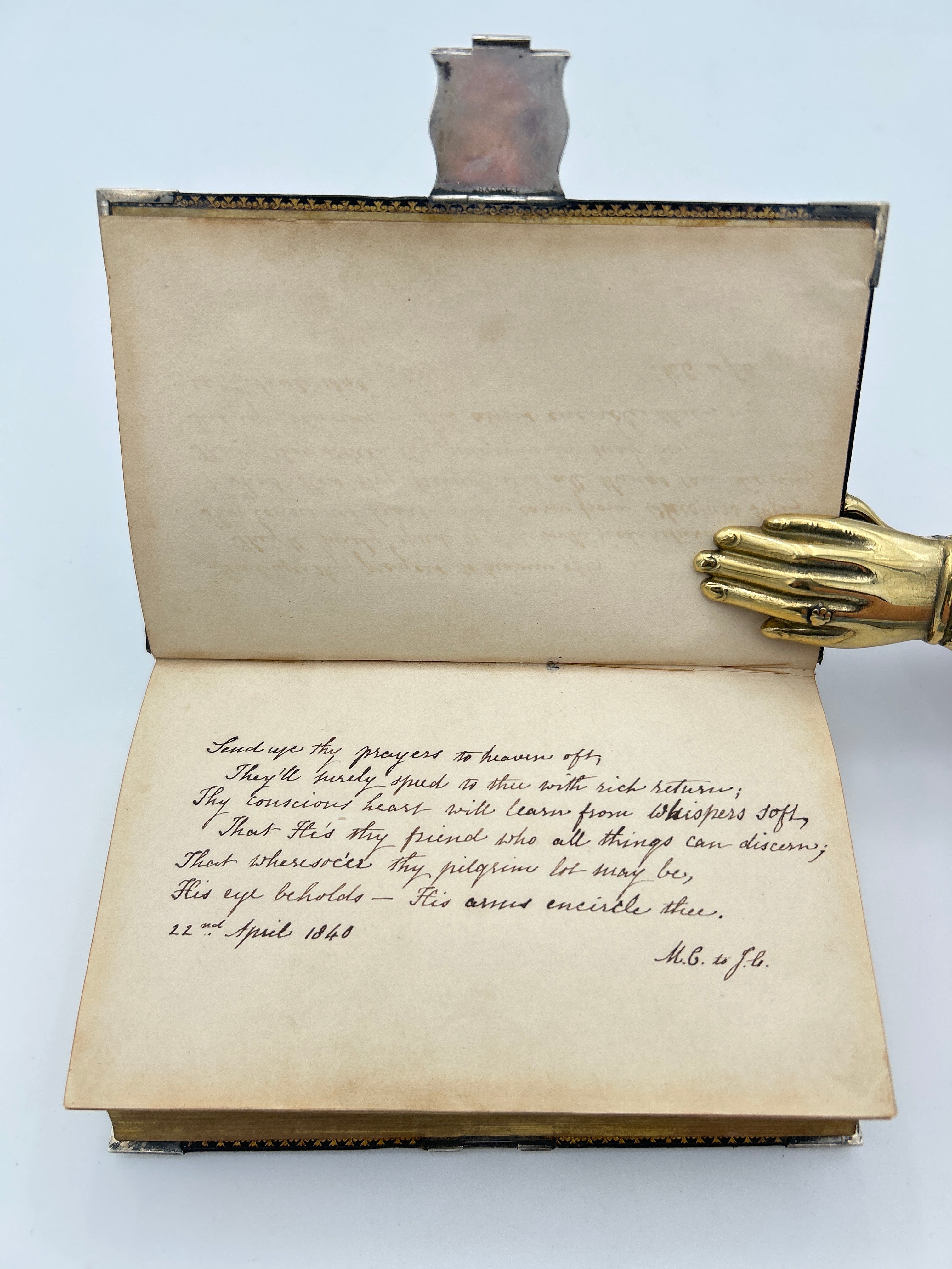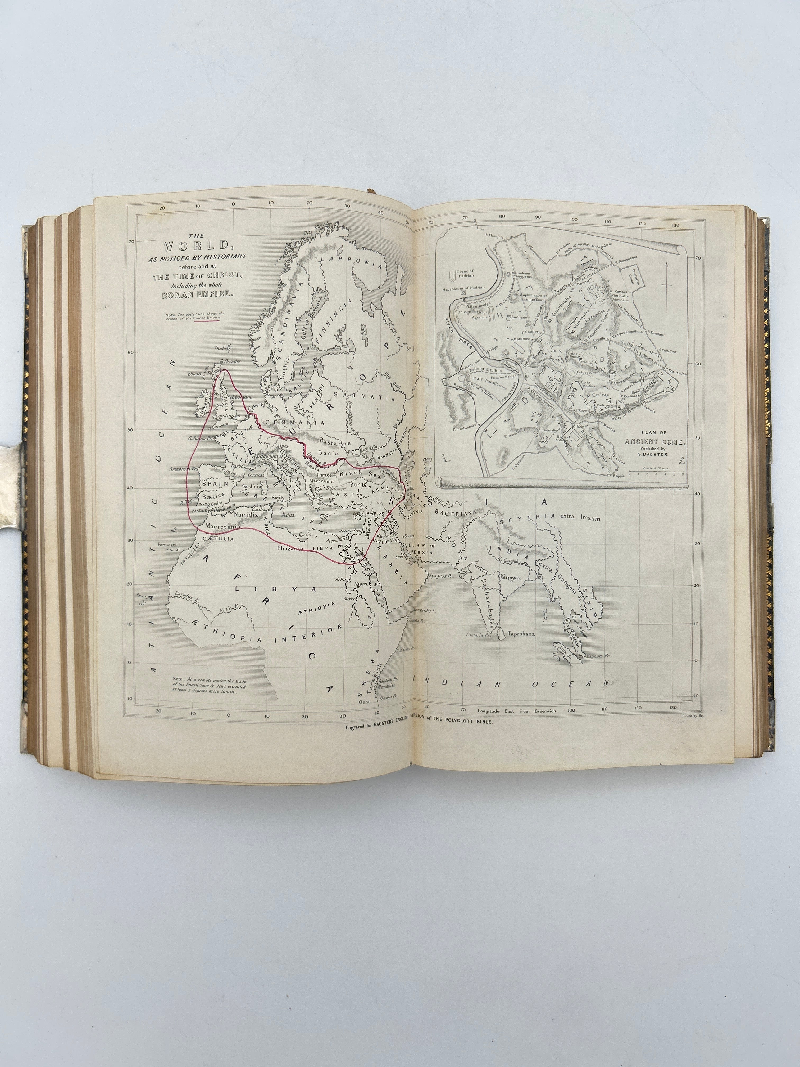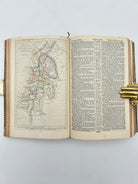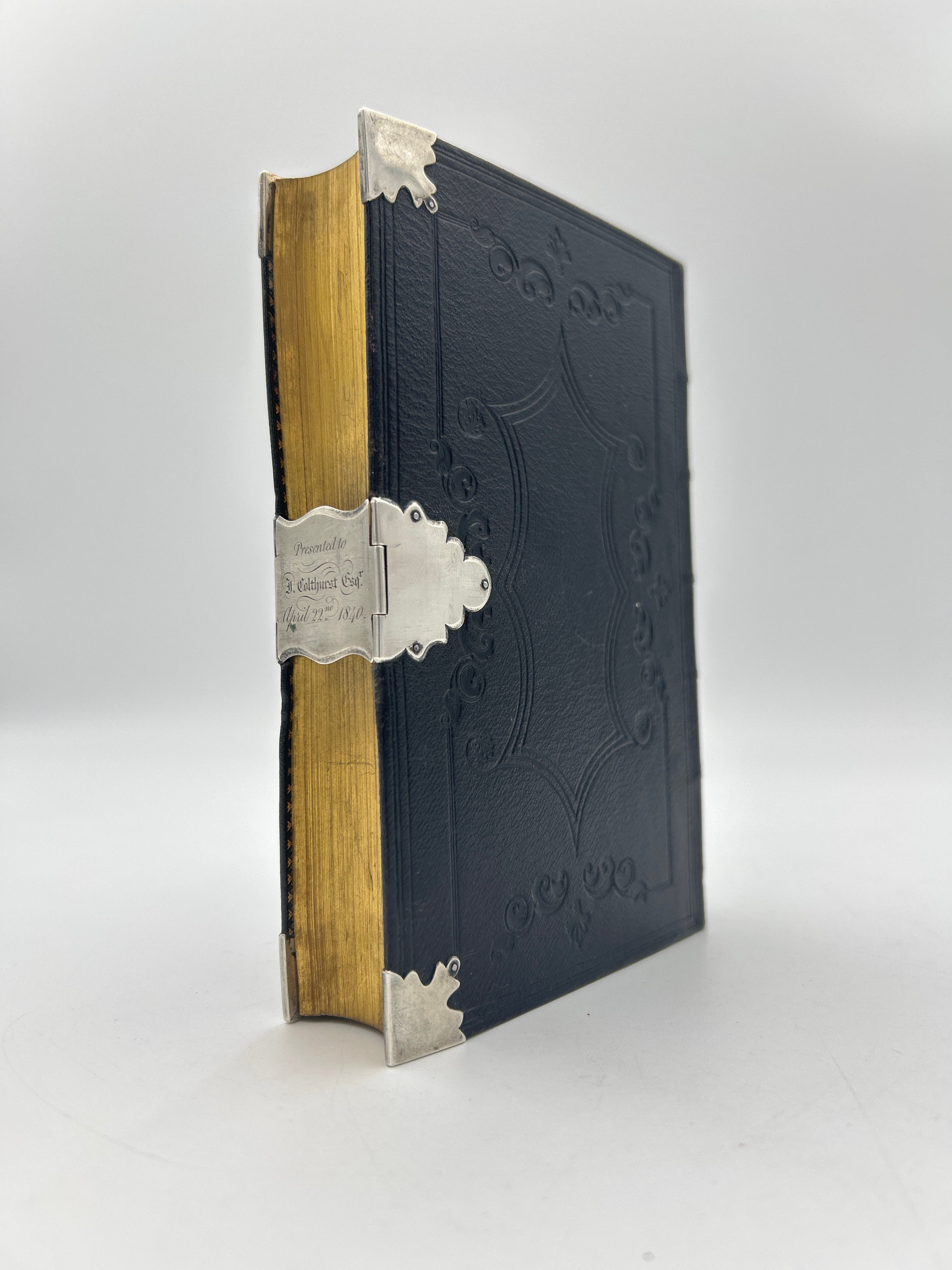 Black Morocco with gilt lettering to spine. Decorated in blind stamping with silver corner pieces and silver clasp. Clasp engraved with “Presented to J. Colthrust April 22nd 1840”. Gothic tracery patter. Gilt edges and turn ins. Slight rubbing to edges. Multiple maps throughout. Fine condition overall.