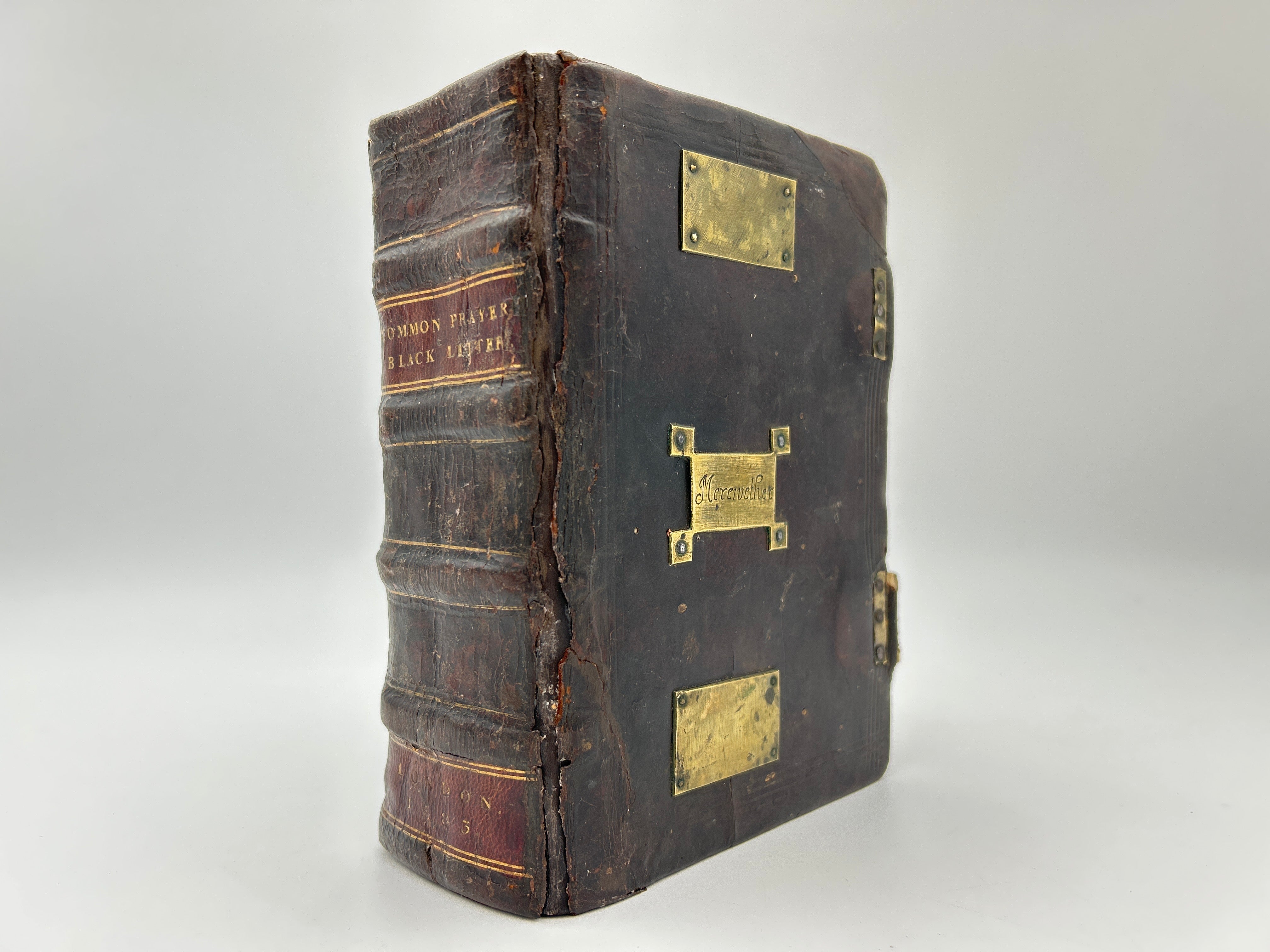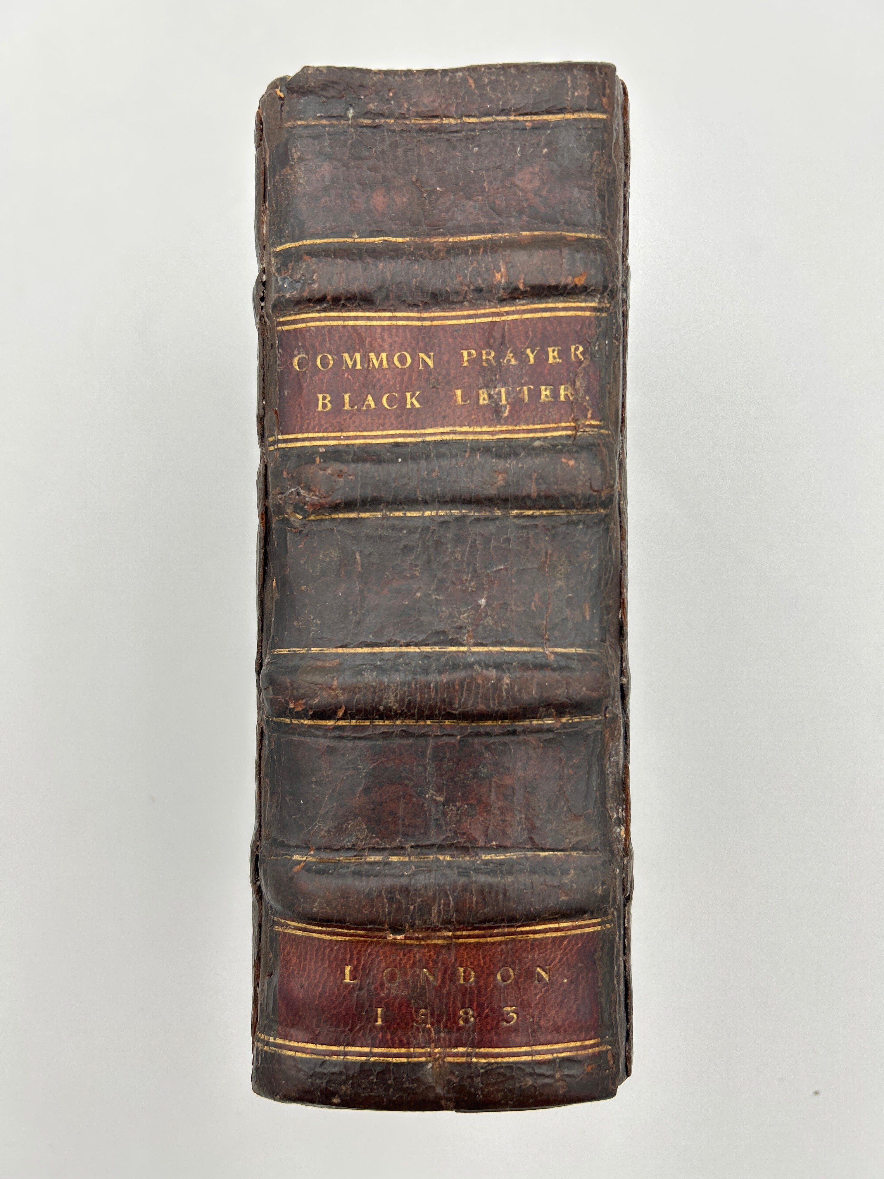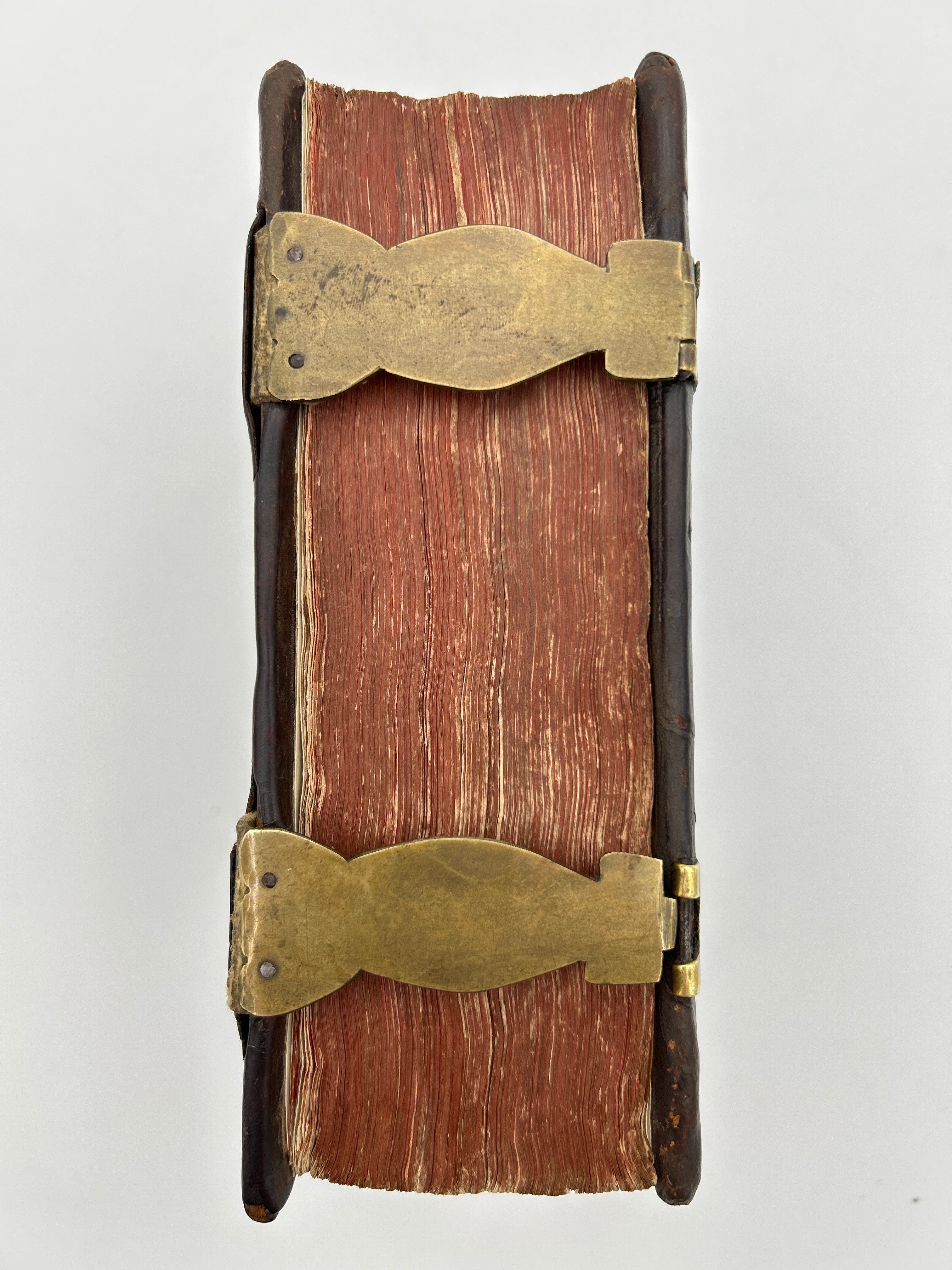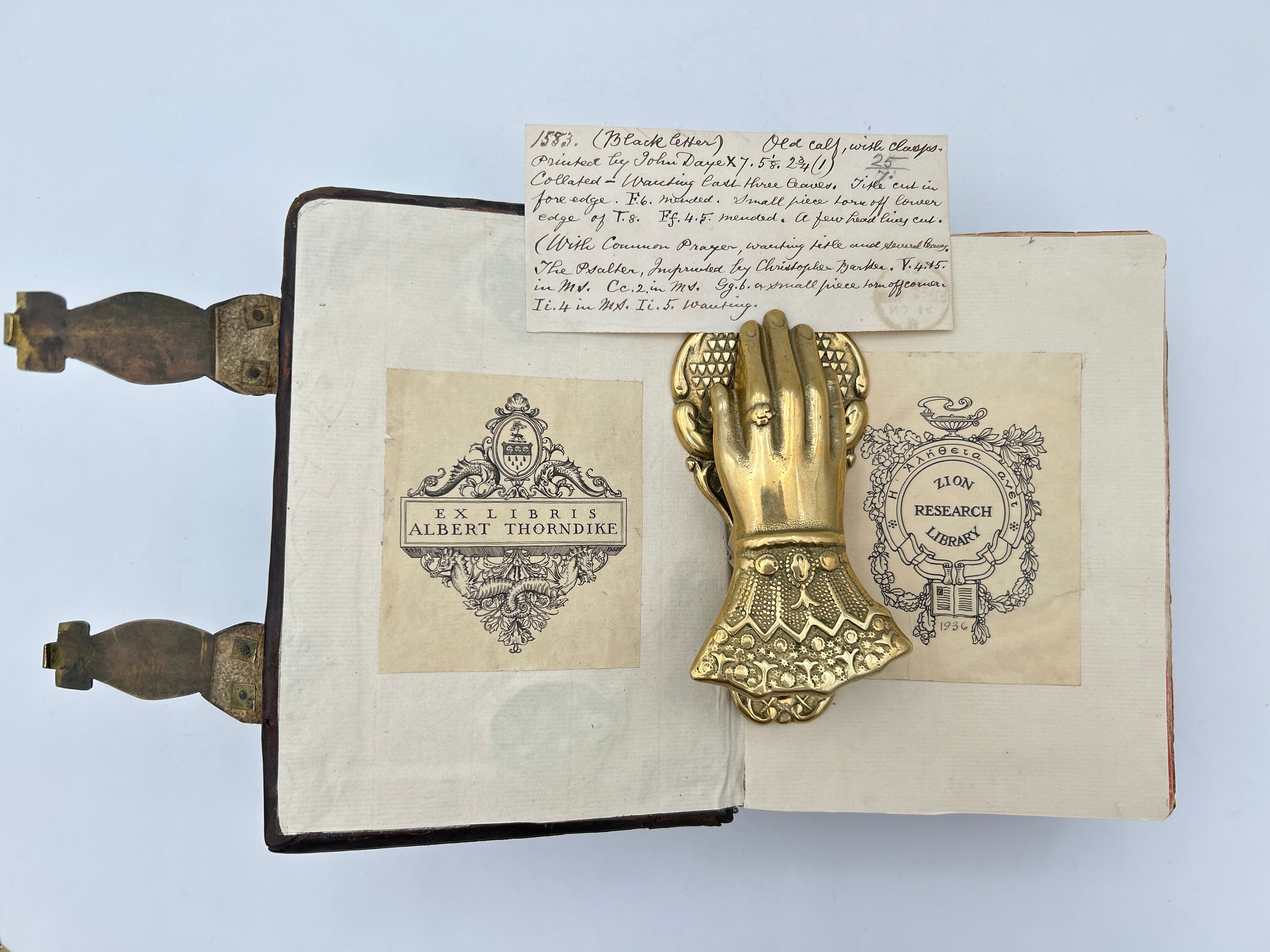 Deep brown Calf with brass clasps, rebacked with original spine laid down, four raised bands, red morocco labels (added later) lettered in gilt. Lacking title page. On the upper cover are three raised brass plates, the central plate engraved with the name Merewether which is also, as noted, inscribed on the on the title page for the Psalms in the Prayer Book. Twentieth century endpapers with bookplates of Albert Thorndike and the Zion Research Library. A very good copy, in a lovely, unsophisticated binding, of a rare edition of the Elizabethan prayer book from early in the ong career of the Barker family.