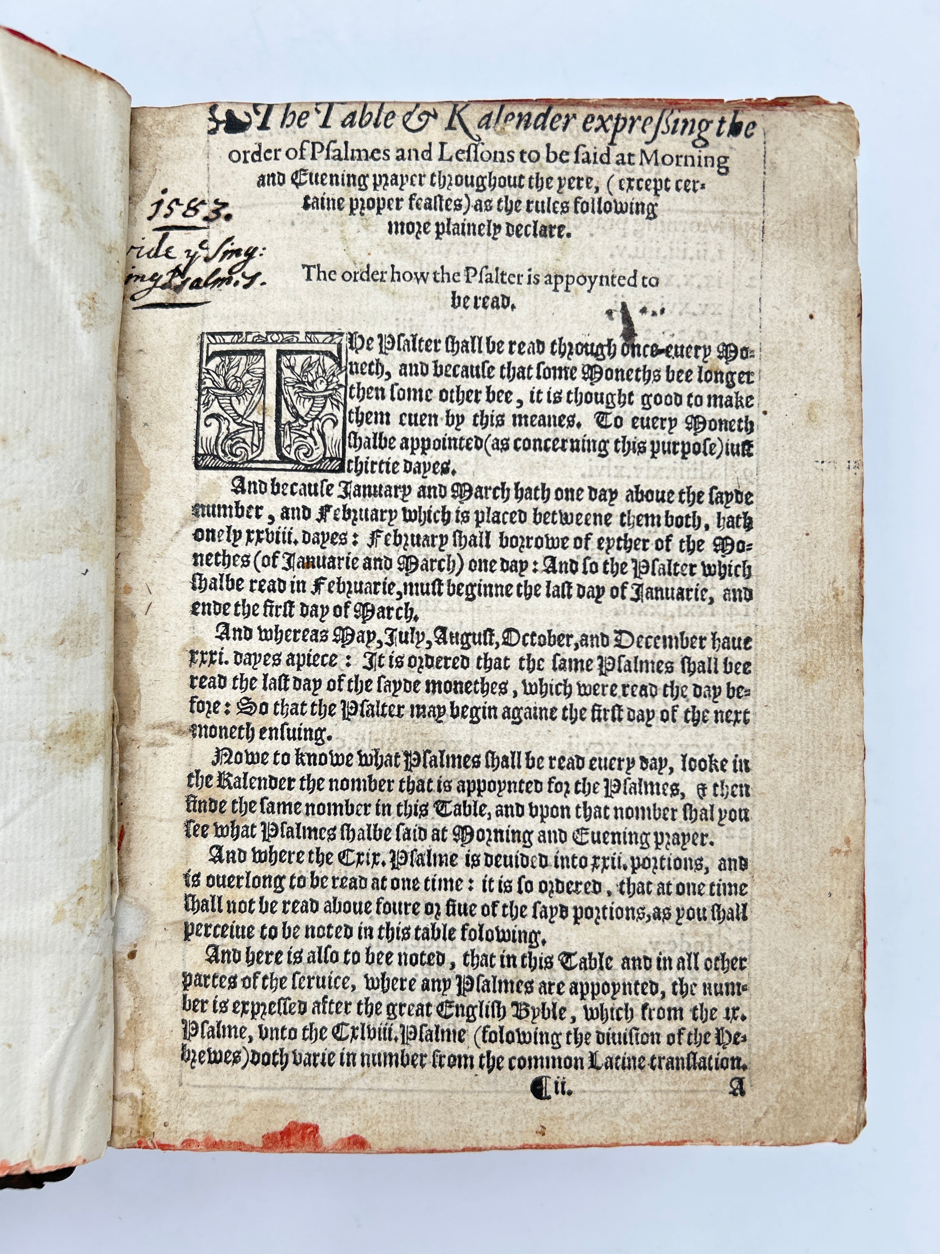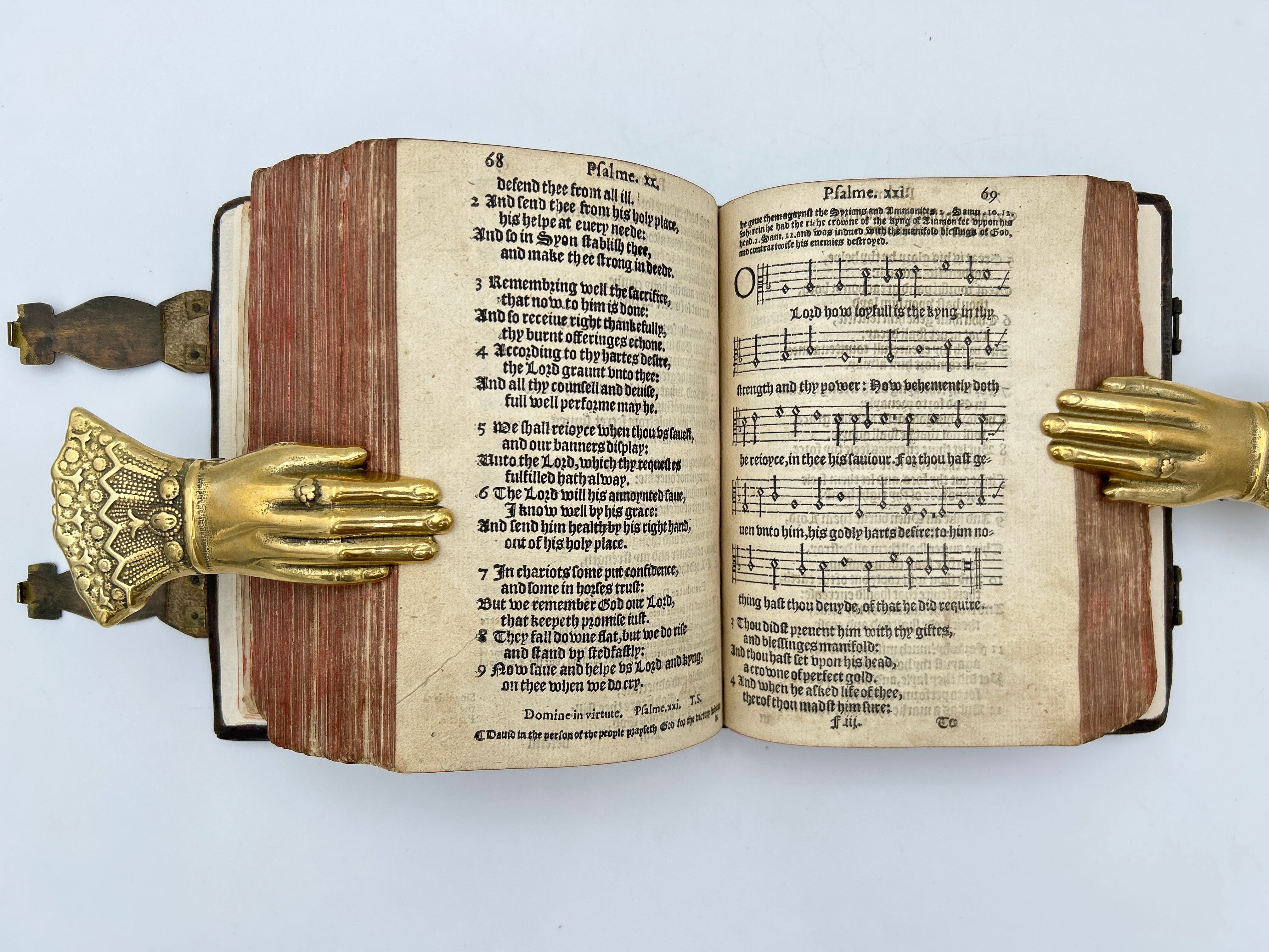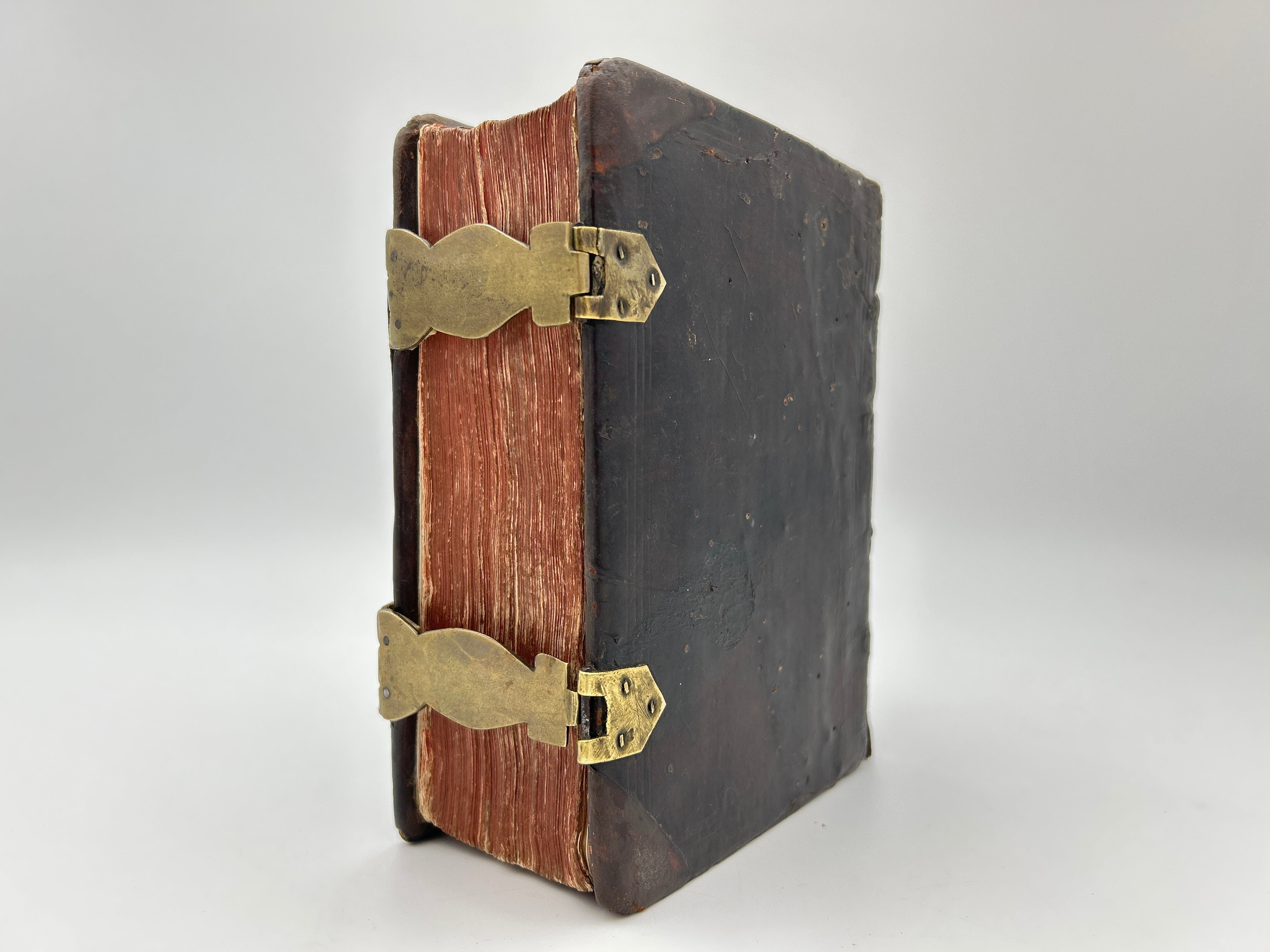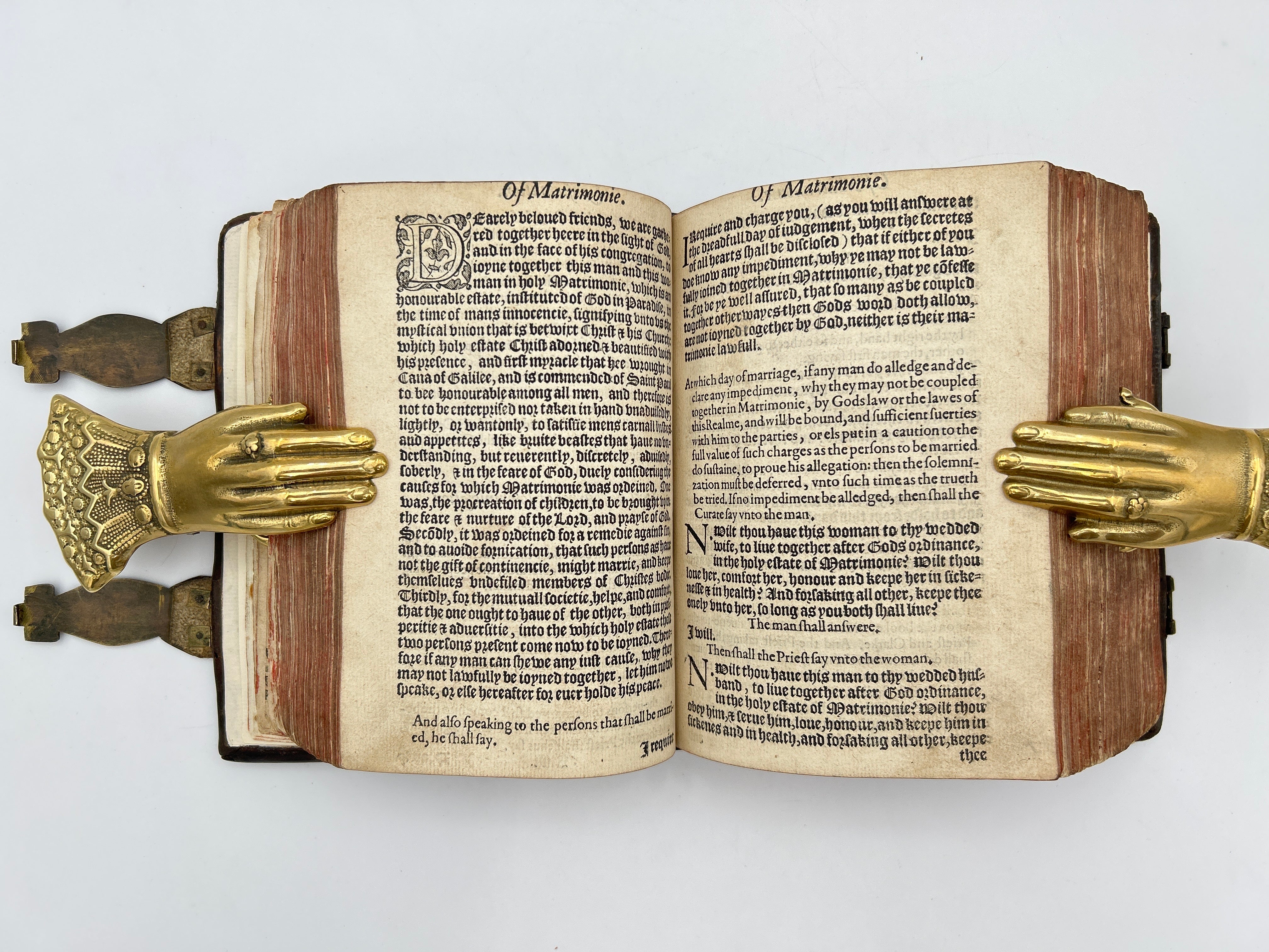 Deep brown Calf with brass clasps, rebacked with original spine laid down, four raised bands, red morocco labels (added later) lettered in gilt. Lacking title page. On the upper cover are three raised brass plates, the central plate engraved with the name Merewether which is also, as noted, inscribed on the on the title page for the Psalms in the Prayer Book. Twentieth century endpapers with bookplates of Albert Thorndike and the Zion Research Library. A very good copy, in a lovely, unsophisticated binding, of a rare edition of the Elizabethan prayer book from early in the ong career of the Barker family.