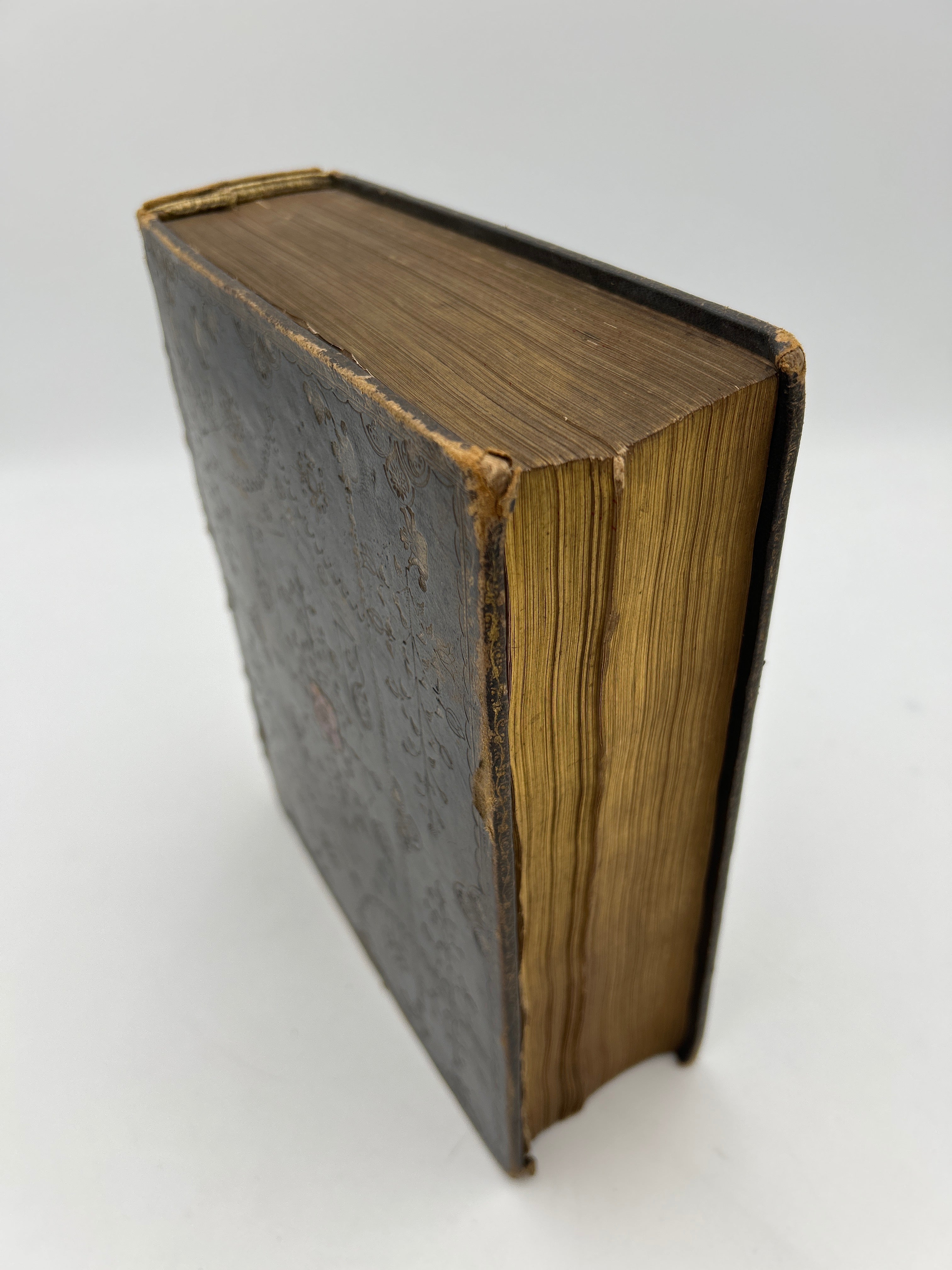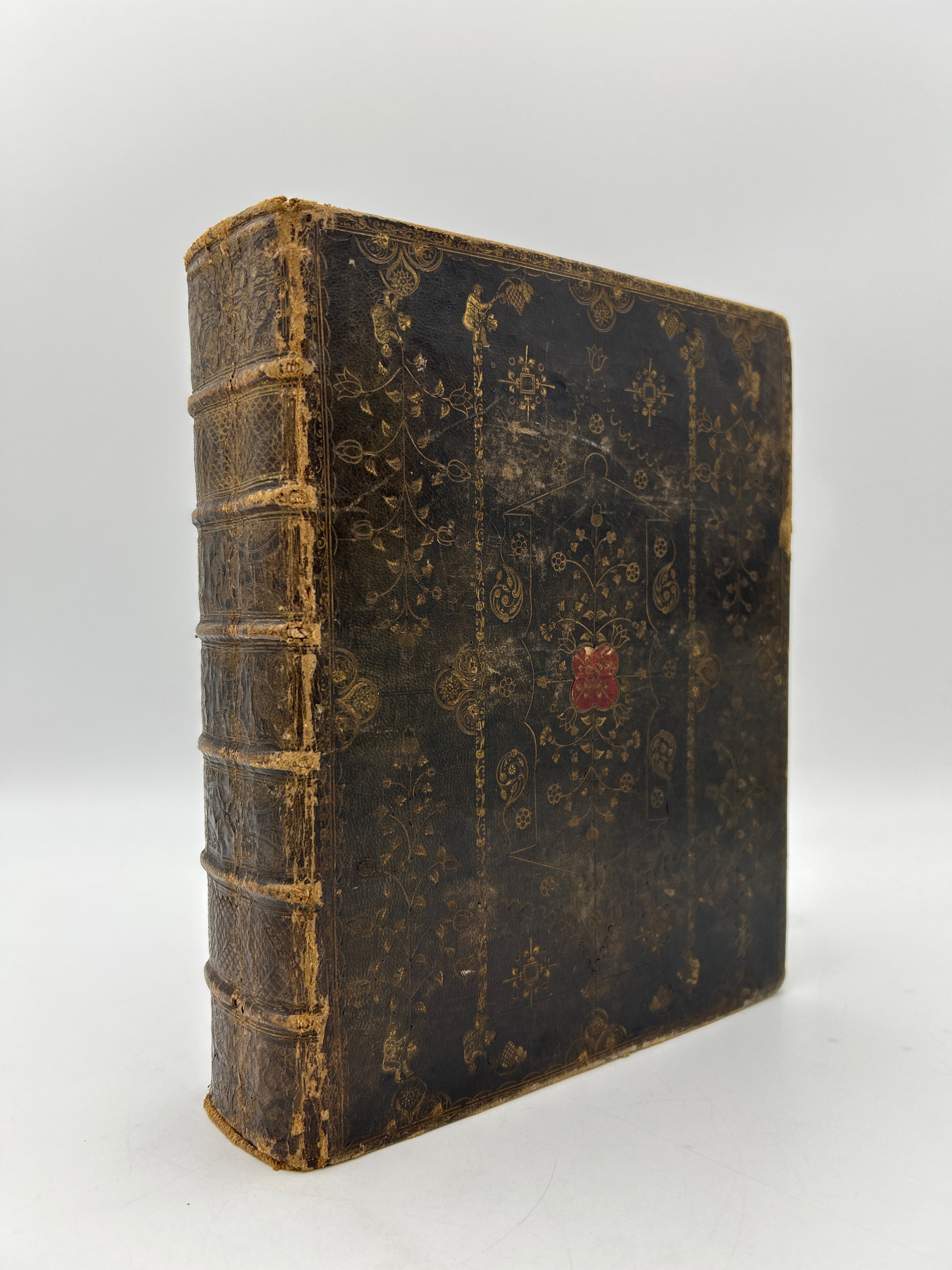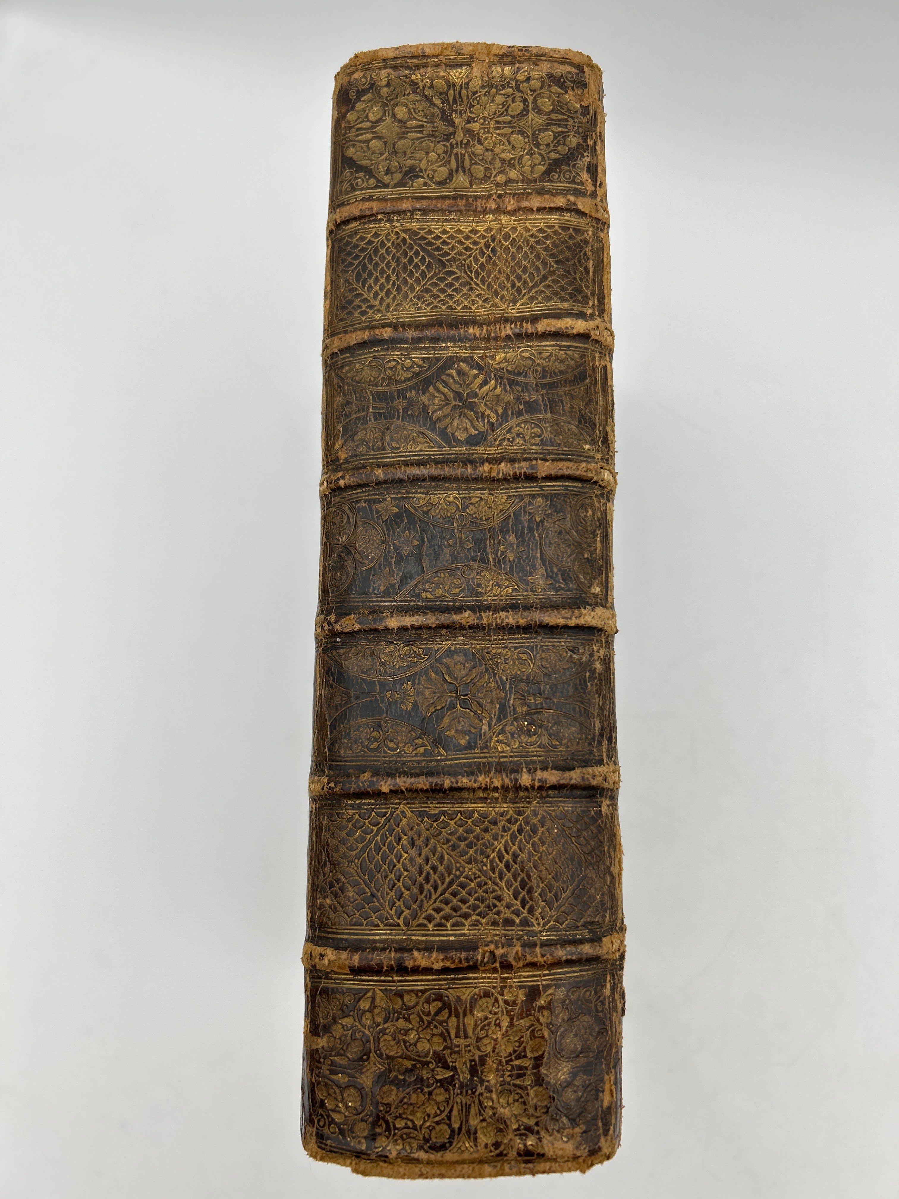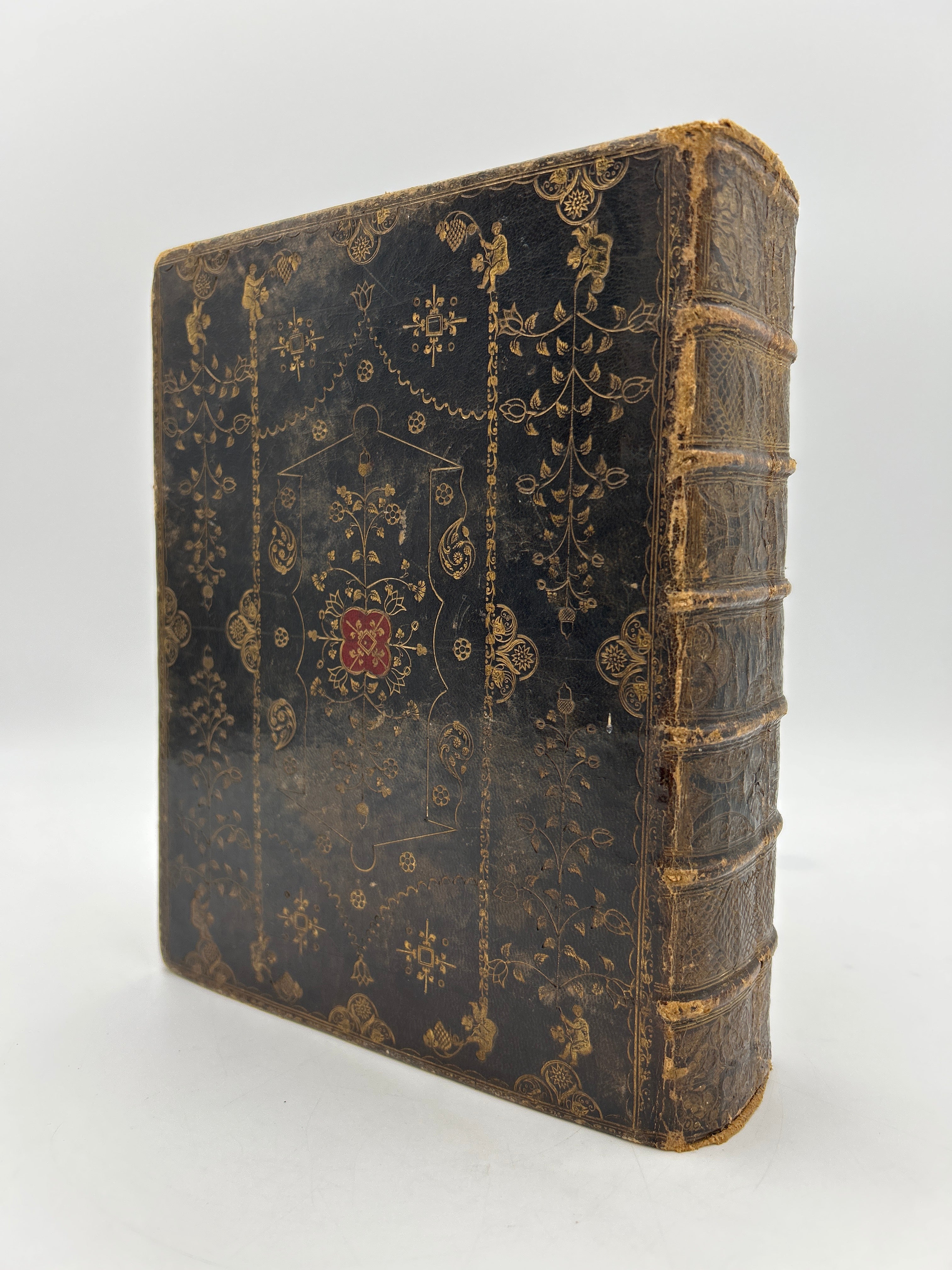 Brown leather binding with embossing on front, back and spine. Red leather inlay in center of upper and lower board. Six raised bands on spine. Red ruled pages. Gold gilding. Rubbing on all four corners and edges due to age, overall good condition.