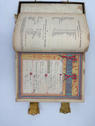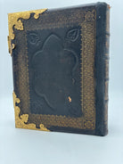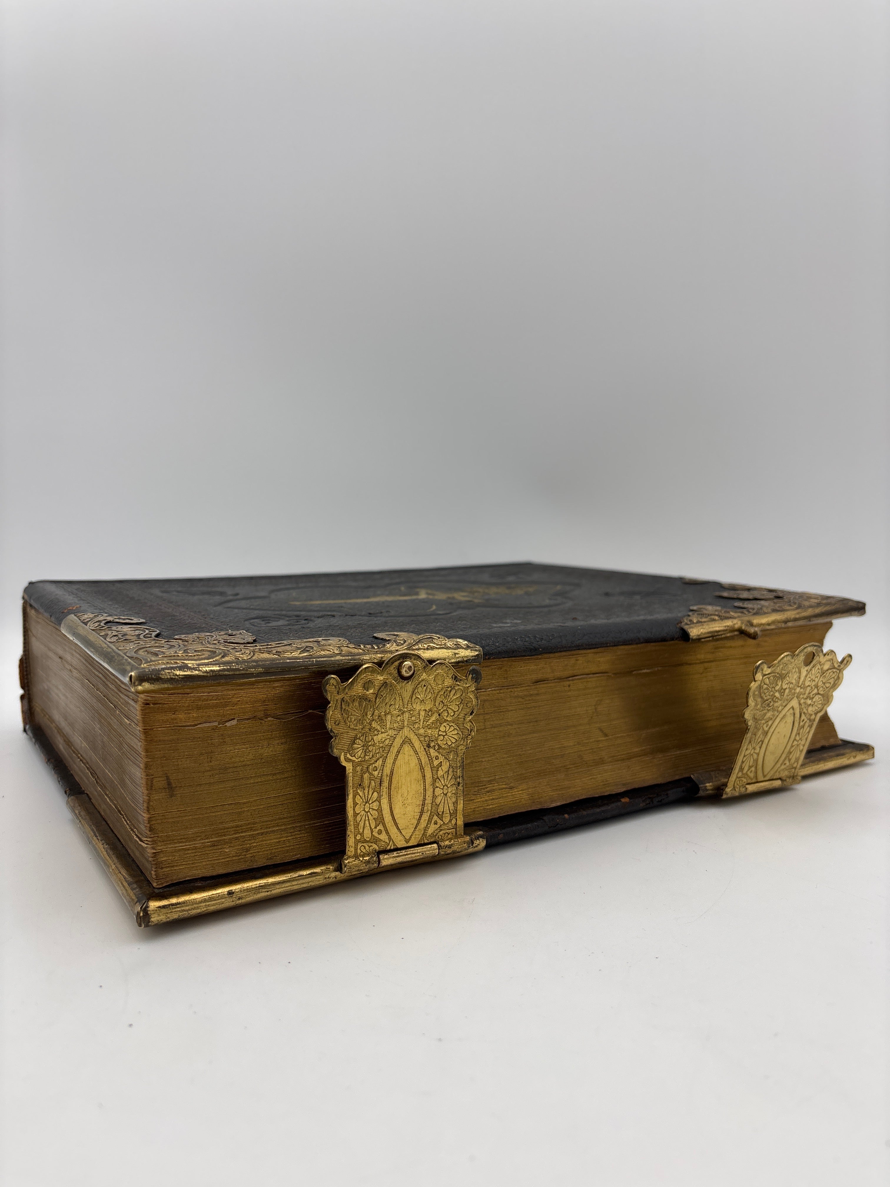 Beautiful binding with brass decorative corners, enclosure clasps, deboss image of Christ on the cross, tapped repair either side of spine, four raised bands, lovely gold tooling on spine, gold three edge, beautiful  color and black and white illustrations throughout, intact, good condition.