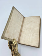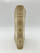 Vellum binding with silver embossing front, back and spine, slight swelling on binding. three edge gold, very good condition.