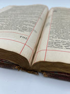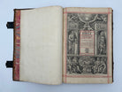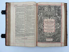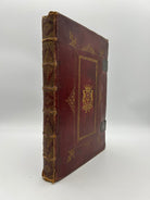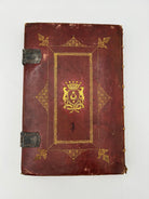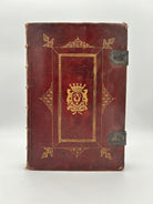 Red leather binding with gilt details on the boards and spine. Six raised bands, gilt edges, and two metal clasps. General scuffing and rubbing down to the leather along the raised bands. Chipping and fraying to the upper and lower spine. Bumping to the corners with some fraying to the upper corners. Red ruling throughout. Very good condition.