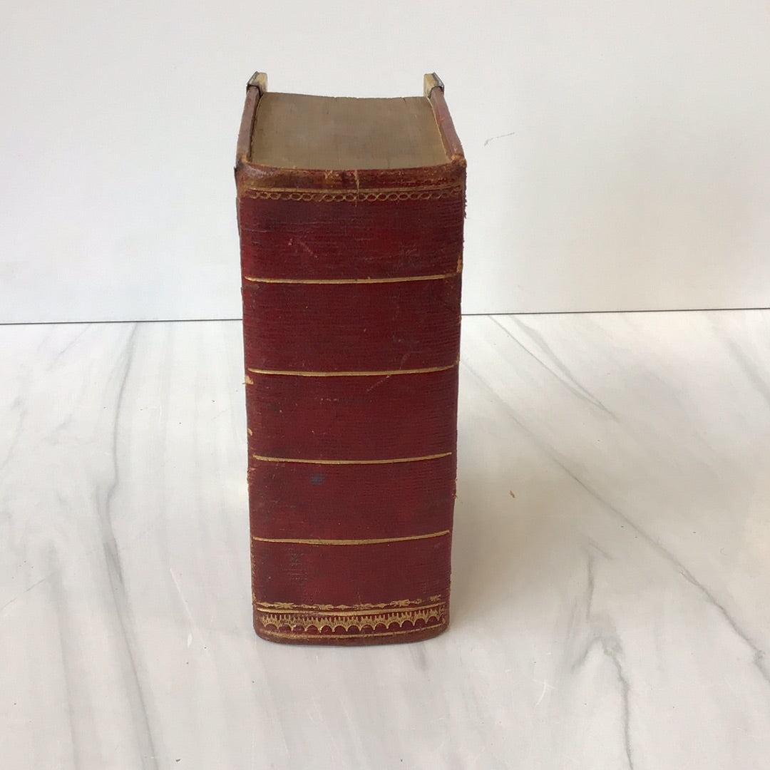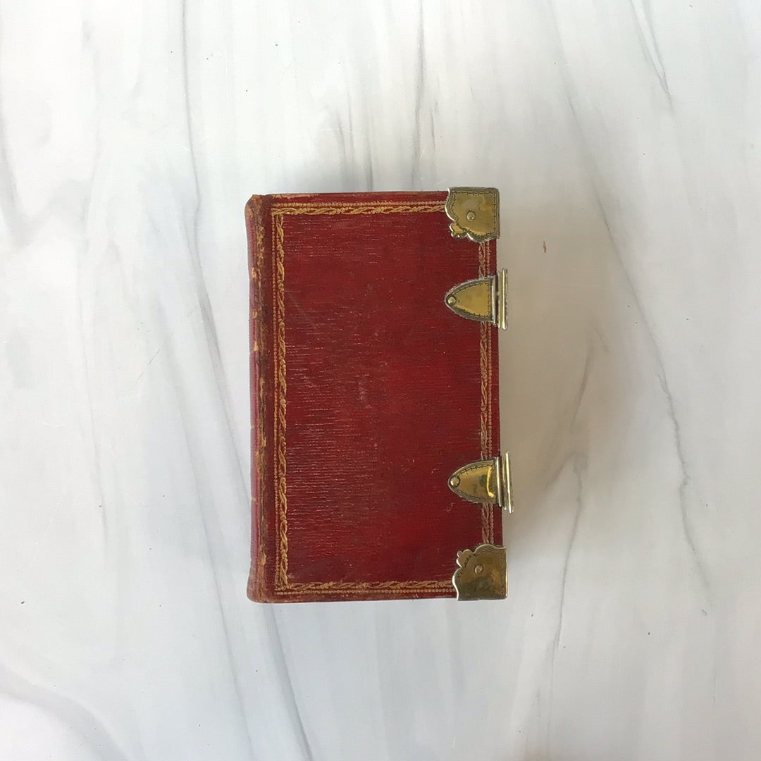Pocket size, beautiful red leather with gold tooling outlining front, back and spine, brass closure brackets with brass corner pieces on each of the four corners, gold on closed edges, very good condition.