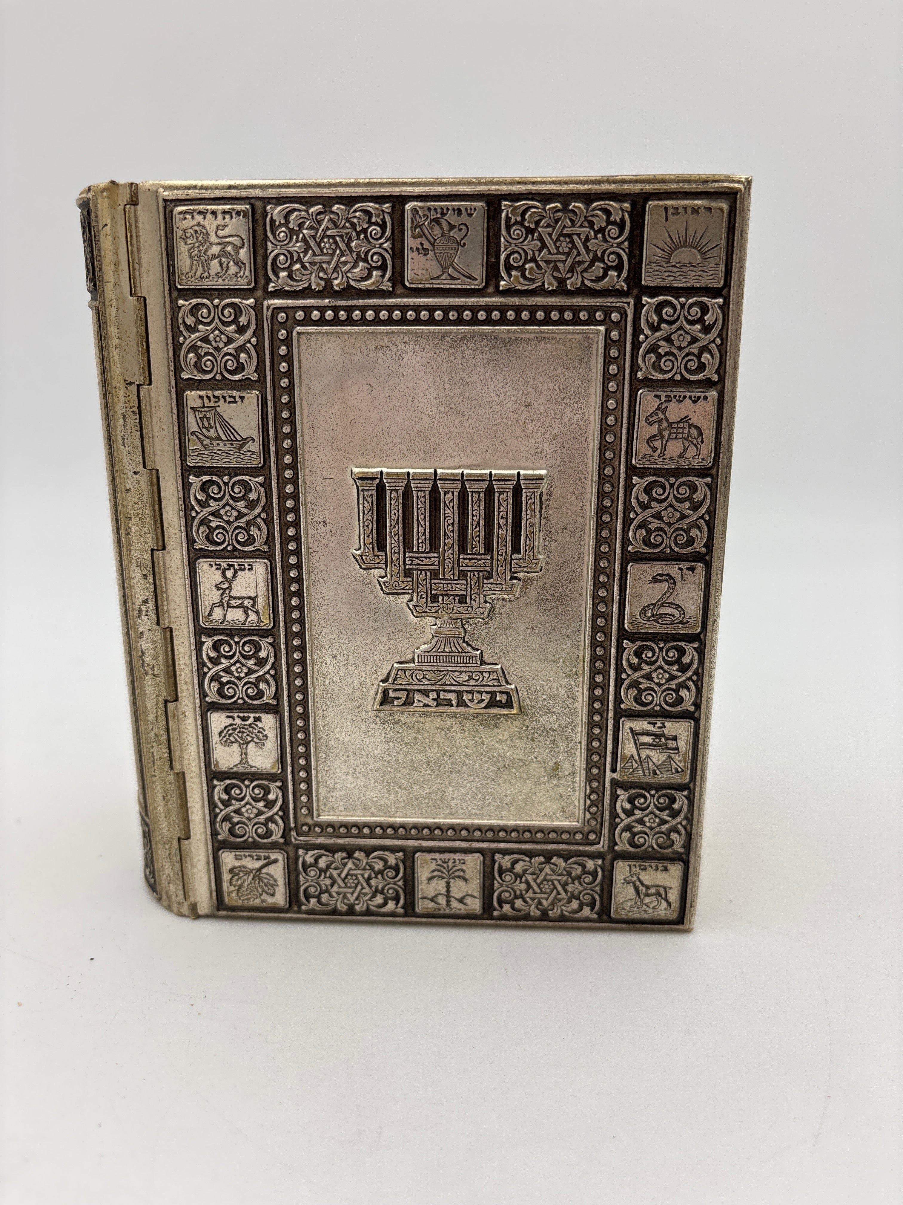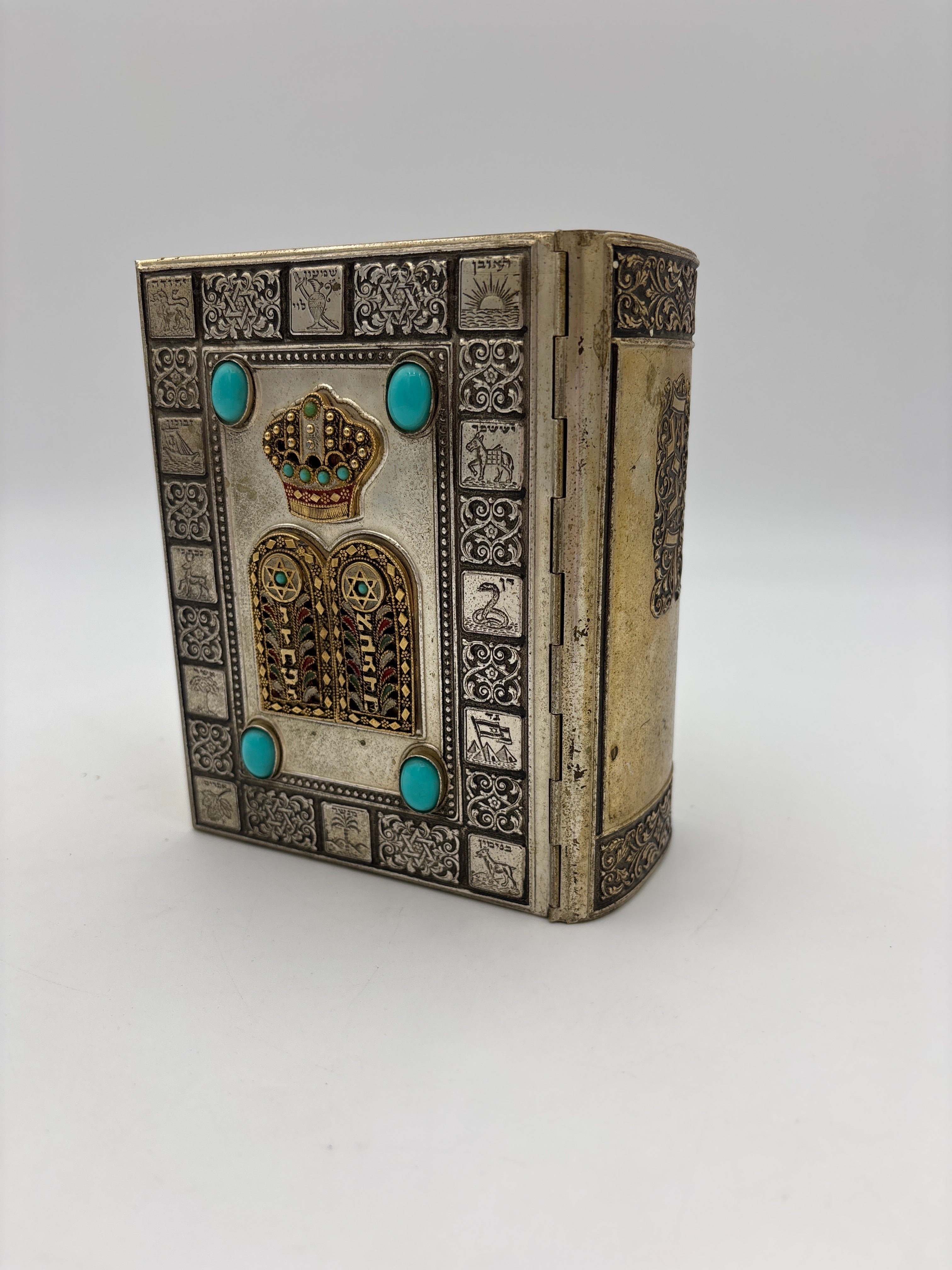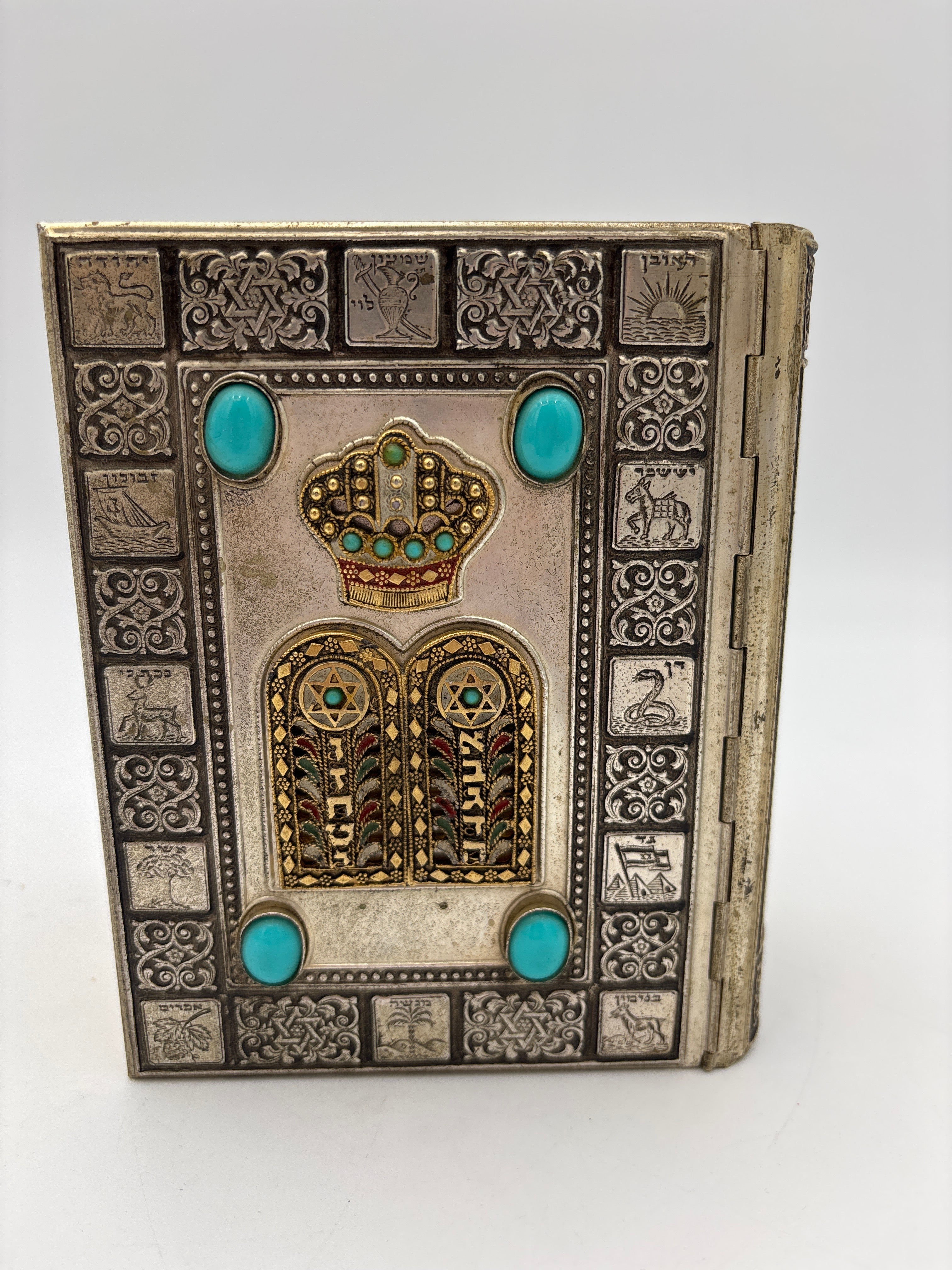 Beautiful silver tooled binding with symbol of King David and a crown, tourquoise jewels inlaid, Mennorahand other biblical images tooled on front and back, intact, very fine condition.