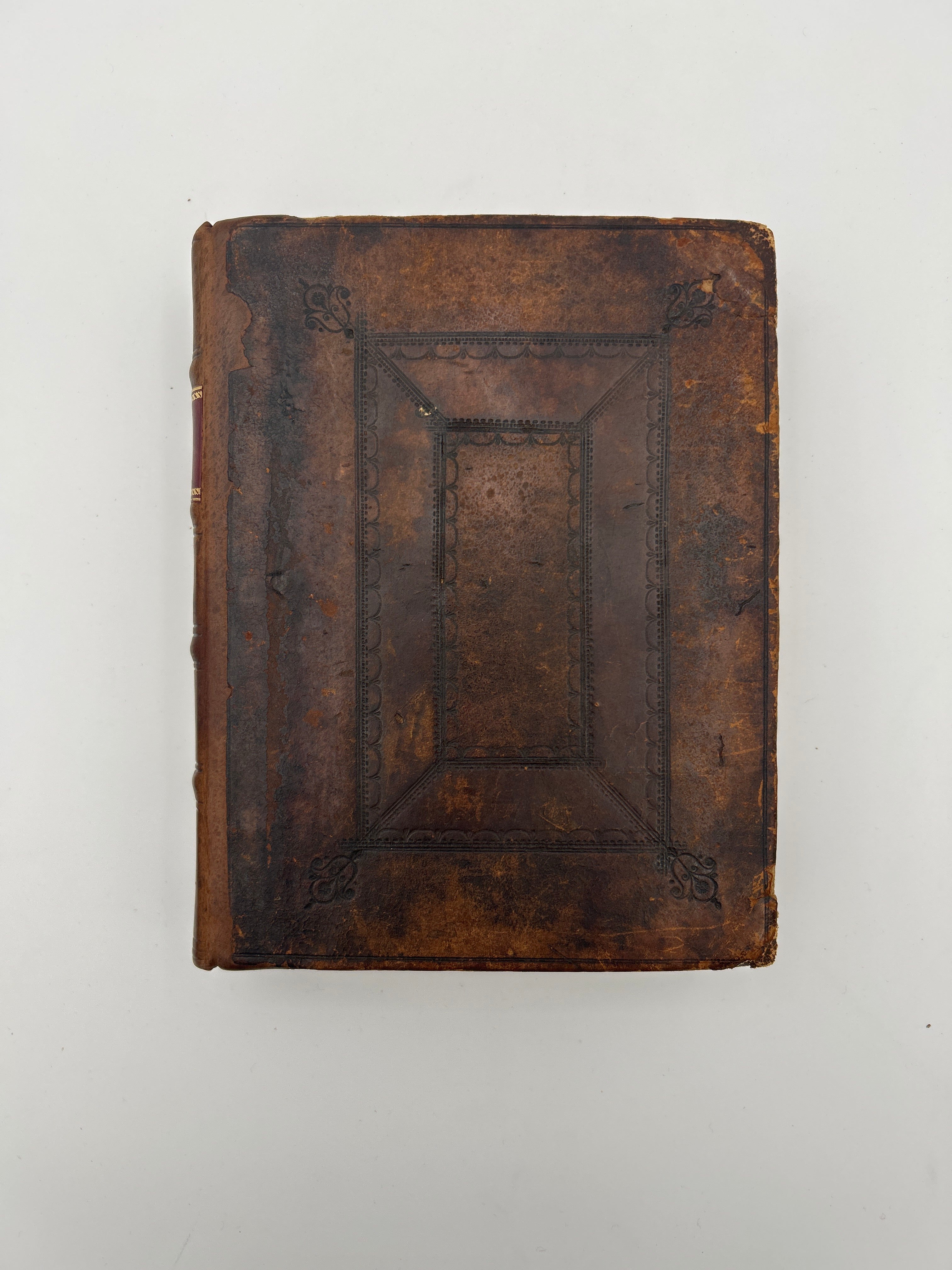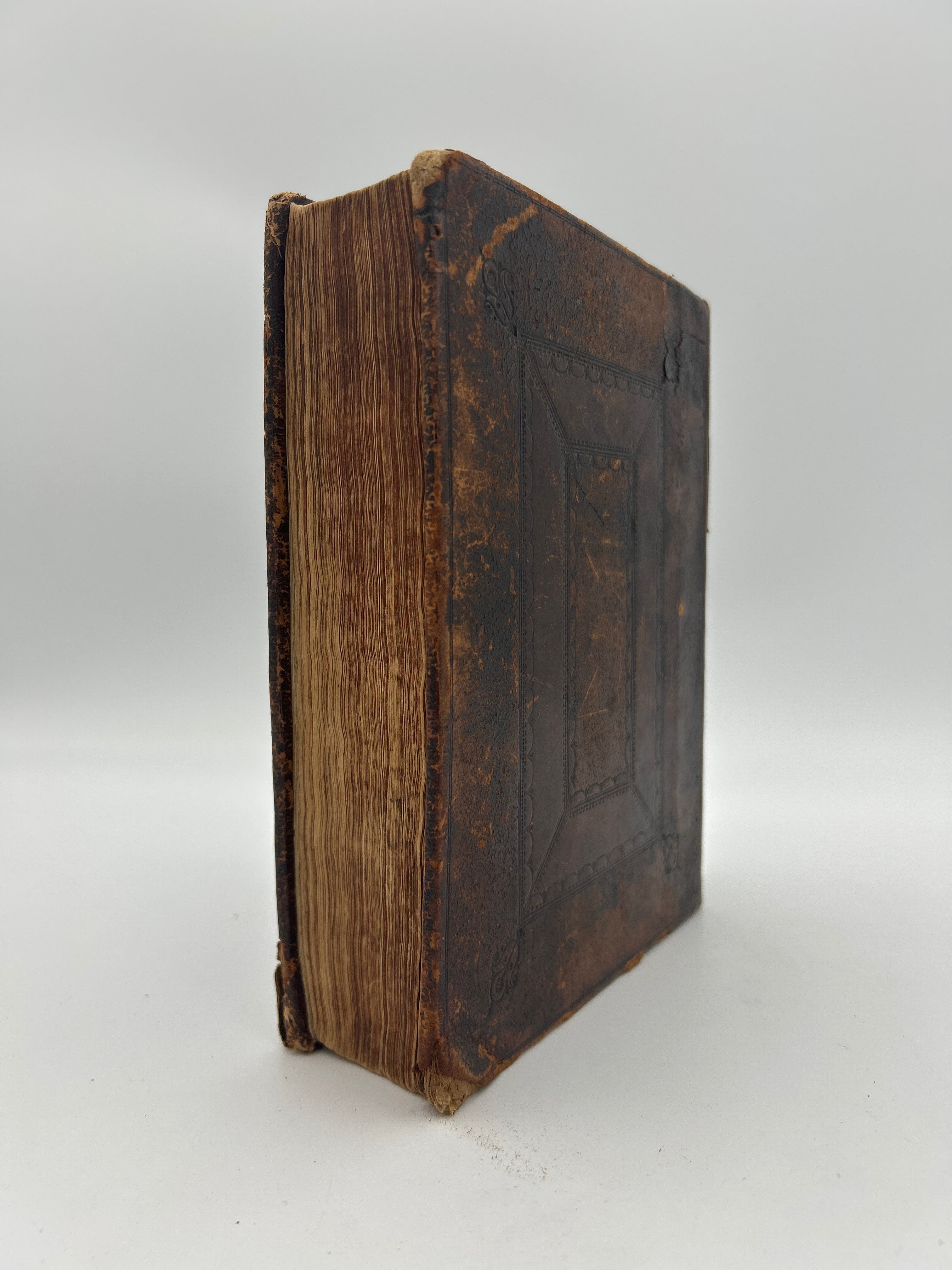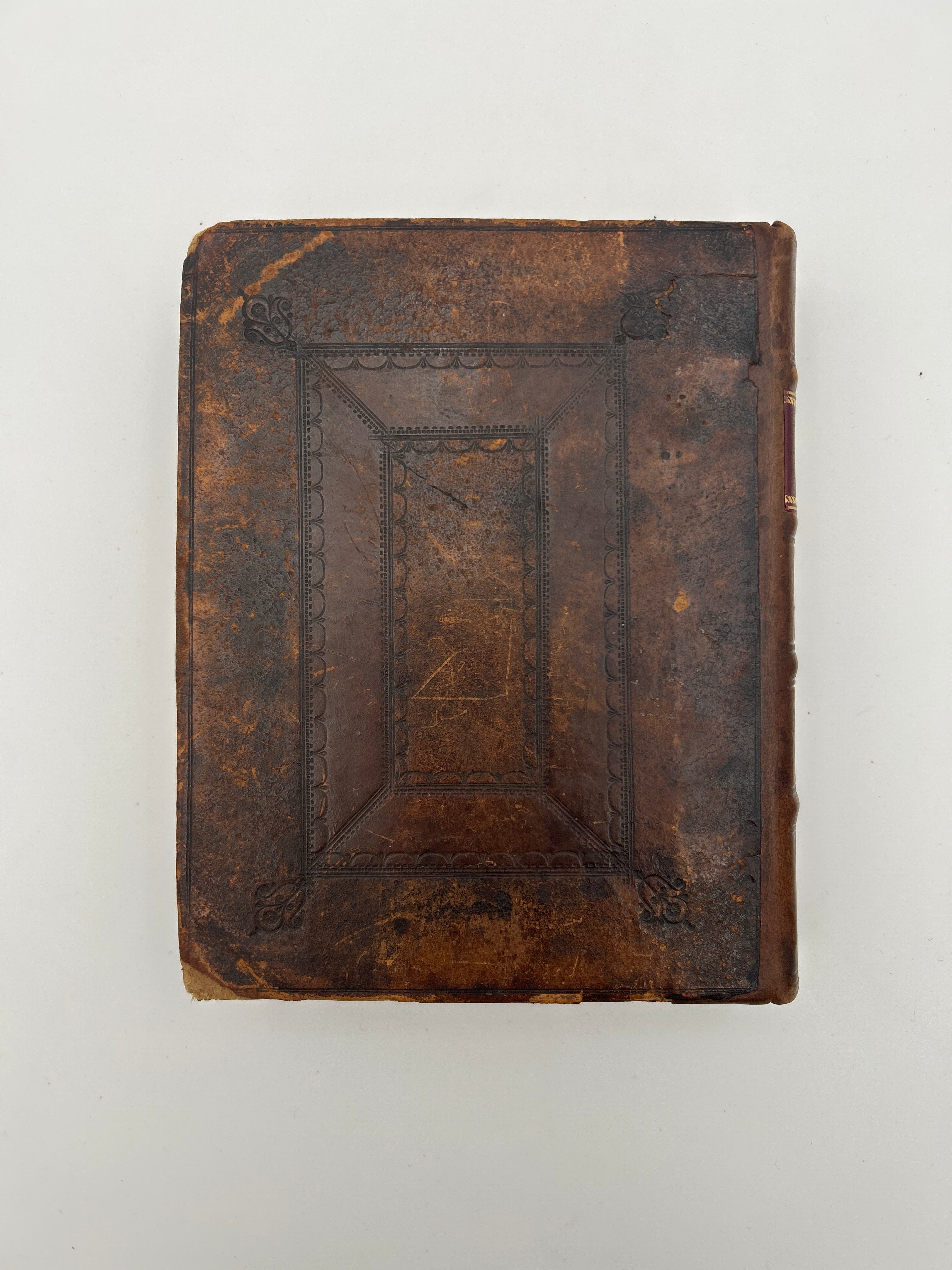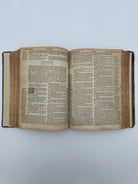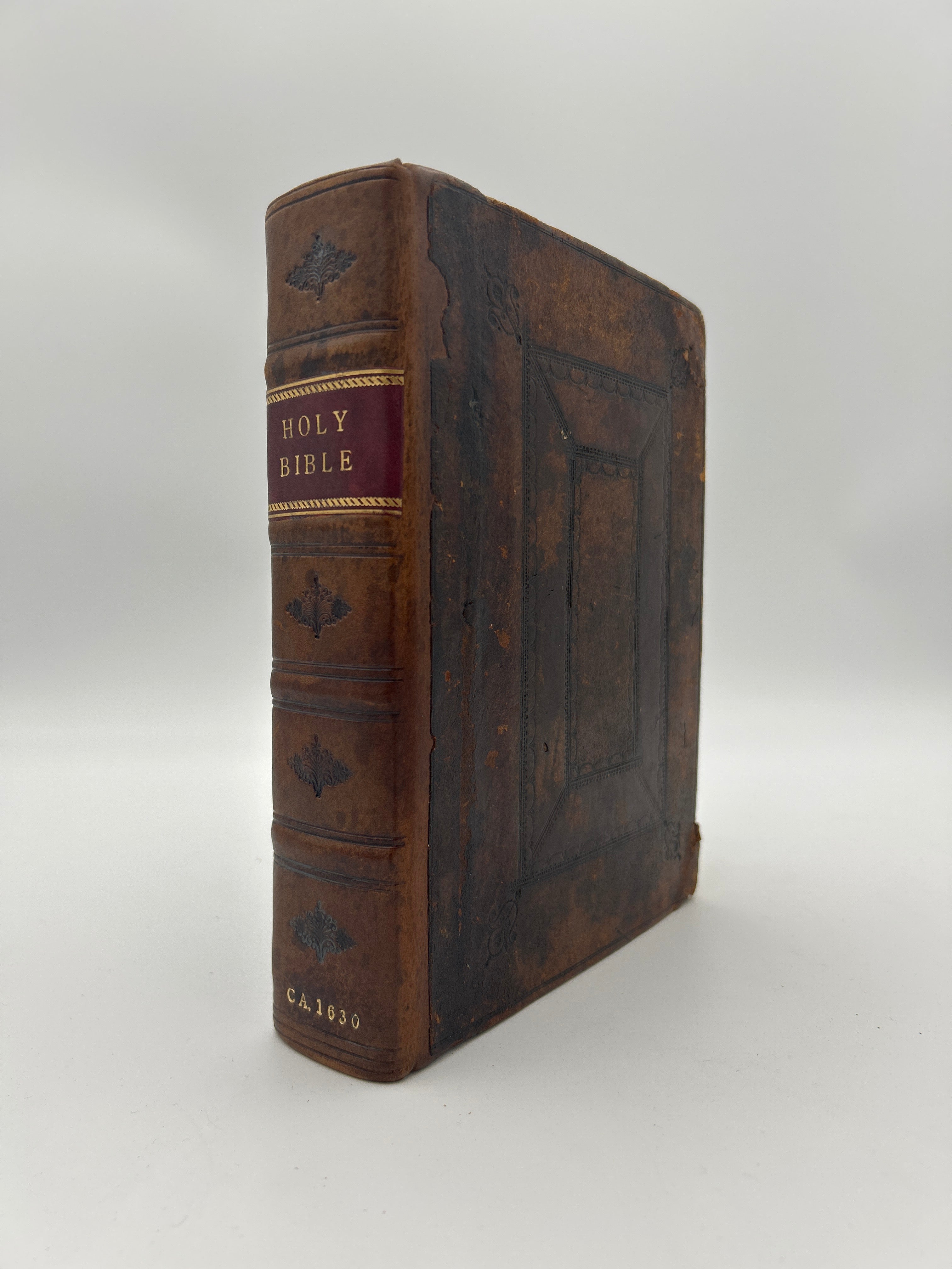 Beautiful leather binding with burgundy band reading, "Holy Bible" on spine, some light scuffing to edges, occasional finger-soiling and browning, some pages trimmed shaving some marginal footnotes. A nice clean copy overall