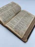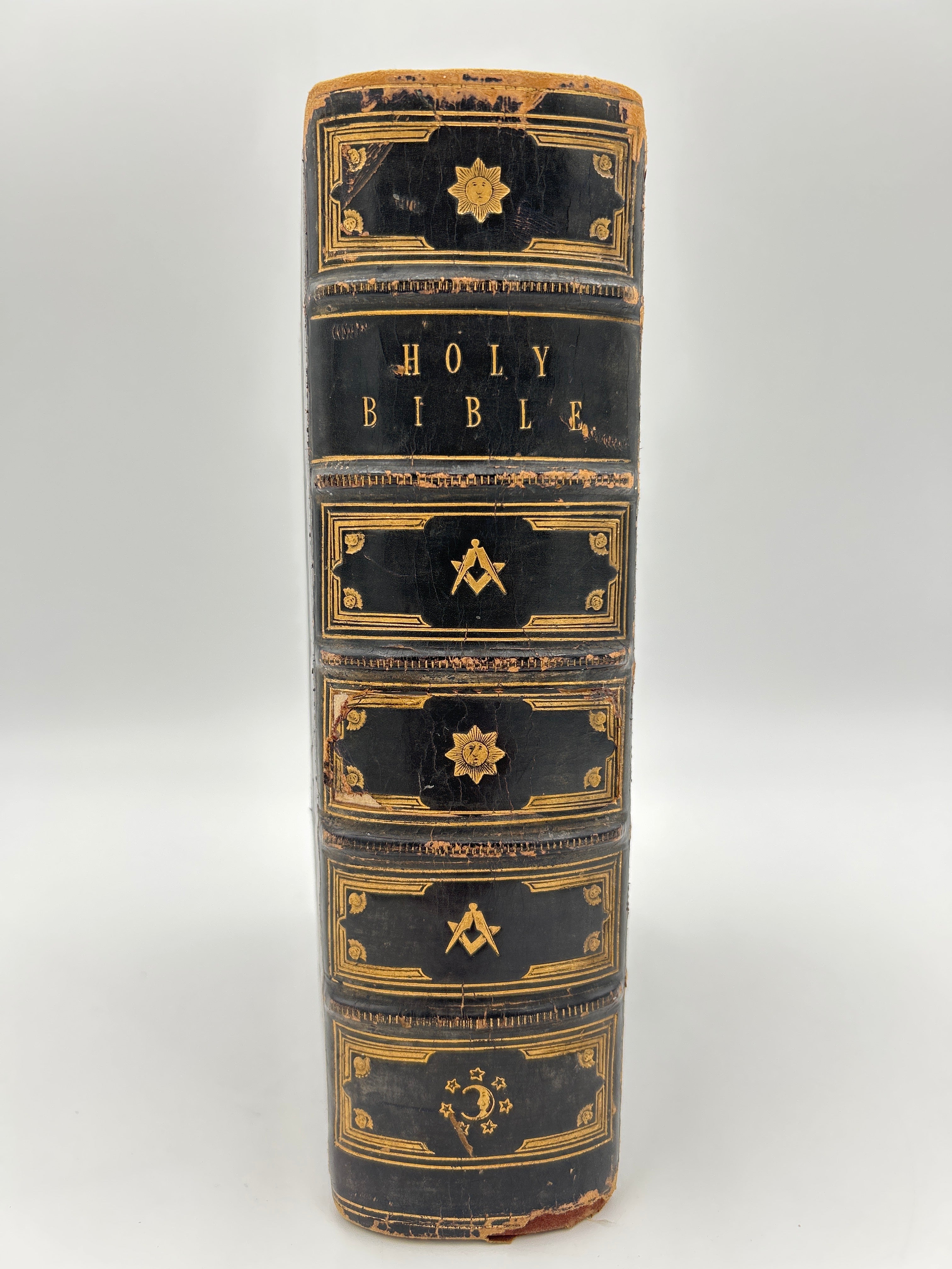 The Bible features 19th century Masonic binding. The Square and Compass in the center and lower right corner, is the most iconic symbol in Freemasonry, representing the balance between the physical and spiritual realms. The square stands for morality and the need to live with integrity, while the compasses symbolize personal boundaries, self-control, and the pursuit of higher knowledge. The sun with a face in the upper left corner symbolizes divine light, enlightenment, and wisdom, shining equally on all. The half moon in the upper right corner represents change, cycles, and transformation, reflecting the feminine principle and the journey toward illumination. The Seven Stars in the lower left corner holds special significance in Masonic teachings, symbolizing completeness and perfection, often linked to the seven virtues or the seven liberal arts and sciences. The number seven is sacred, representing spiritual wholeness, and the stars can also connect to celestial bodies like the Pleiades, reinforcing the idea of divine guidance. Together, these symbols encapsulate Masonic principles of balance, personal growth, and the pursuit of divine knowledge, urging Freemasons to seek truth, virtue, and enlightenment on their spiritual journey.