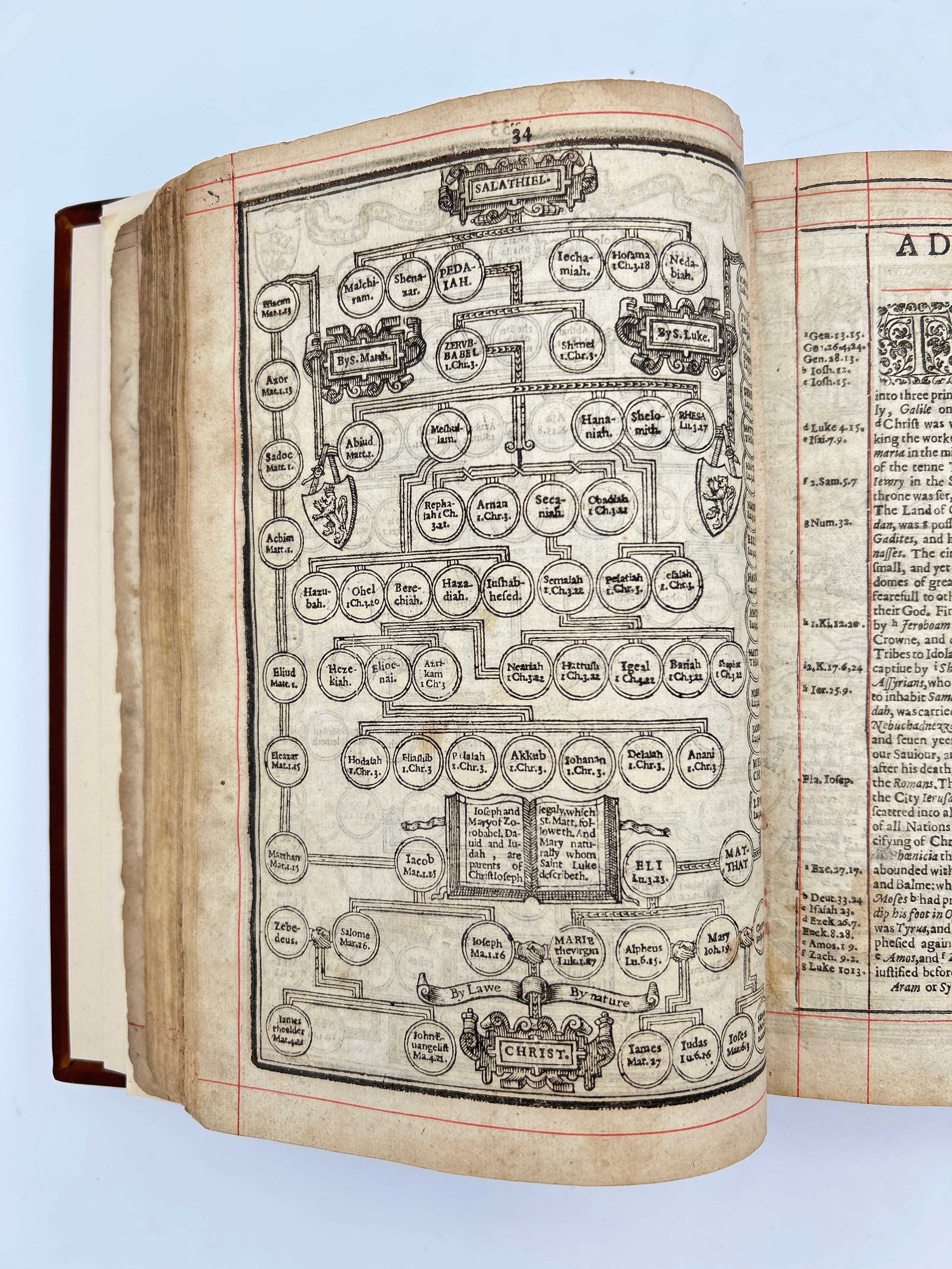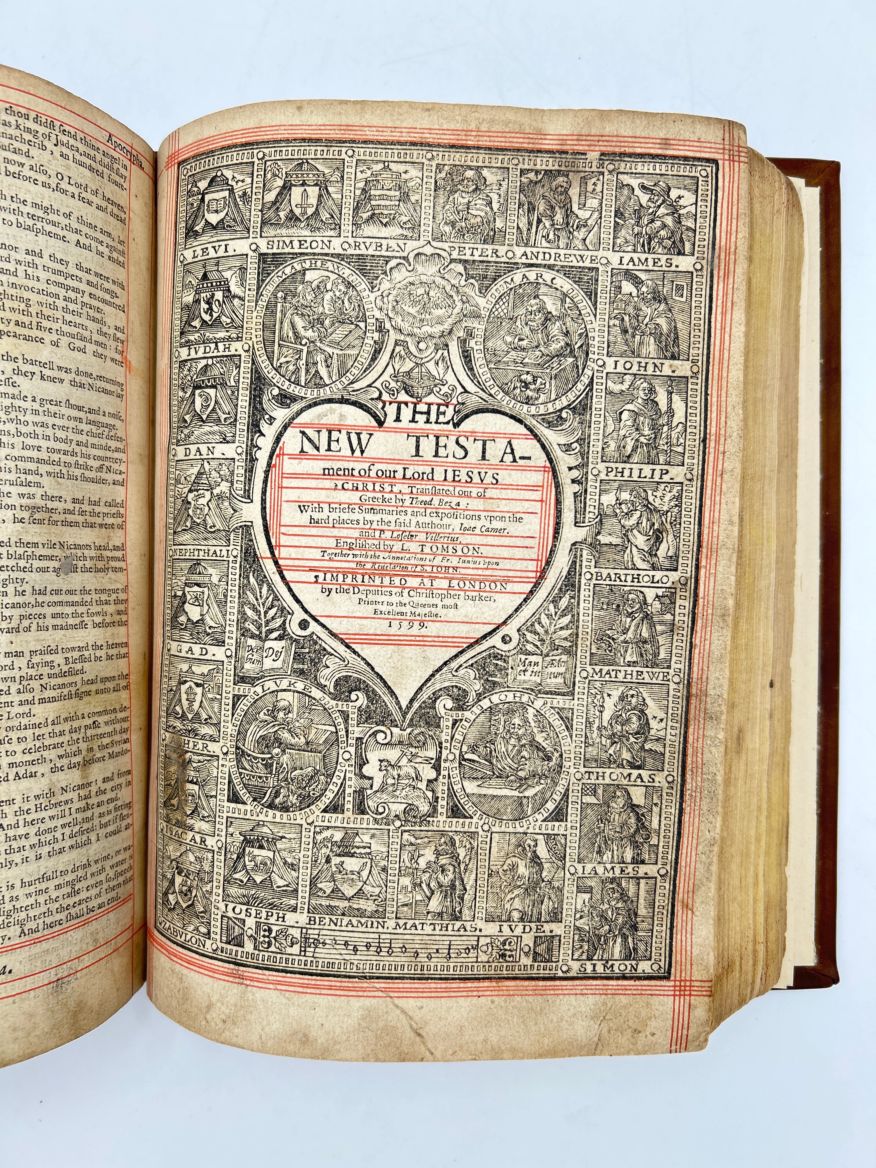 5B, Red lined bible to include the Apocrypha, 34 pages of Genealogy, wood cuts included.