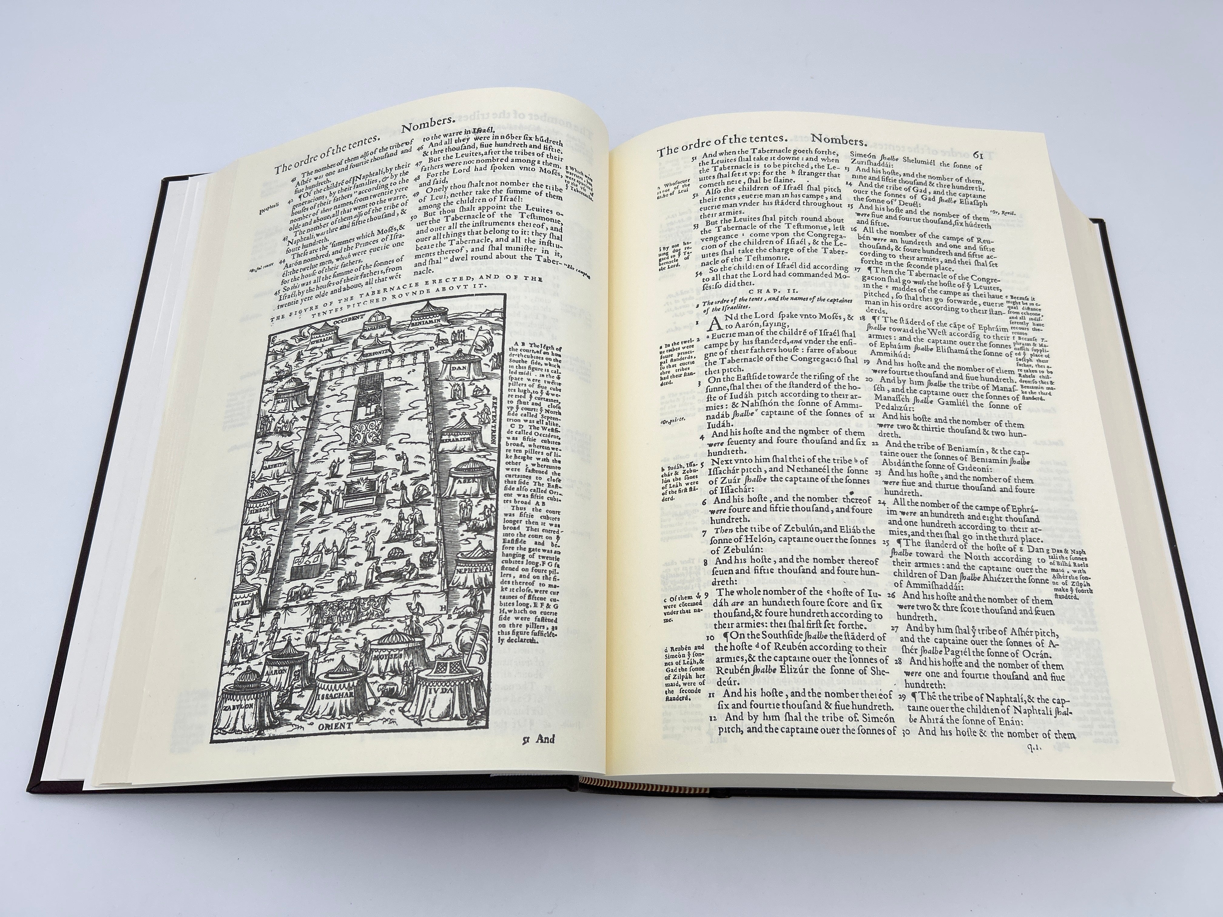 The Bible. Large Print Edition. First edition, first printing.  Pebbled brown bonded leather with gold lettering on spine. Large print, with original wood cut pictures.