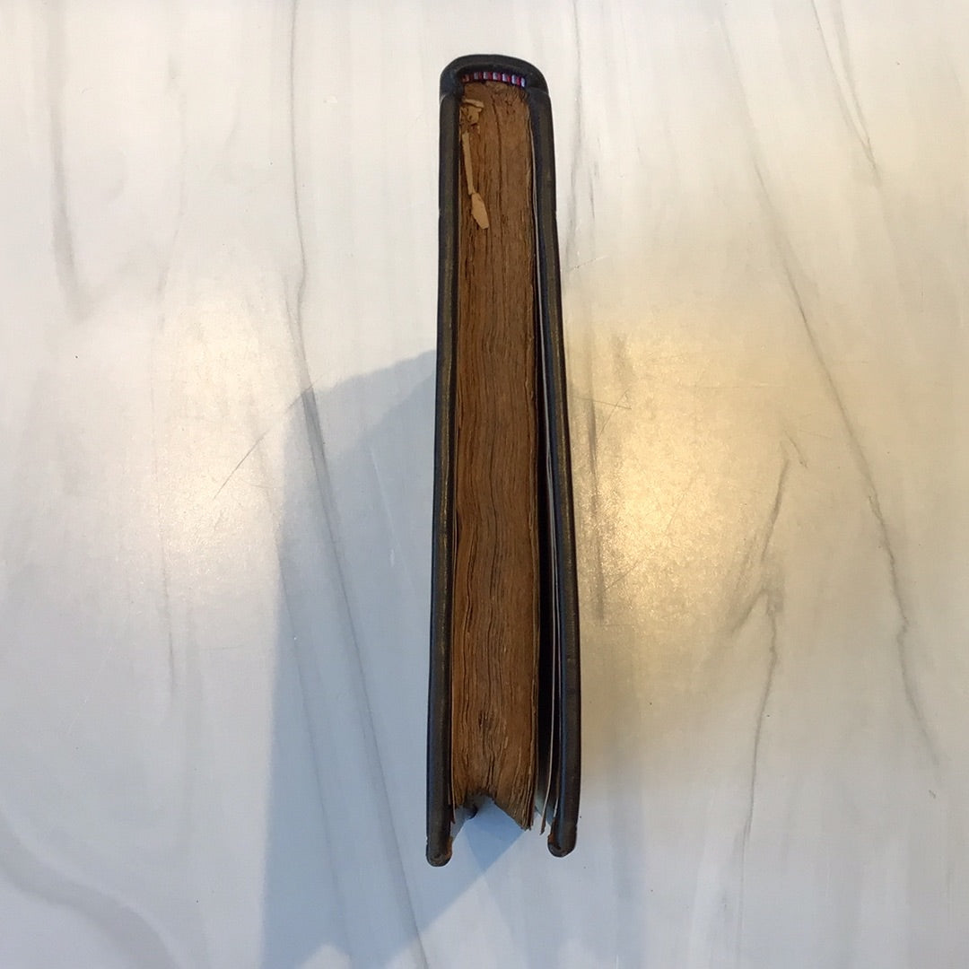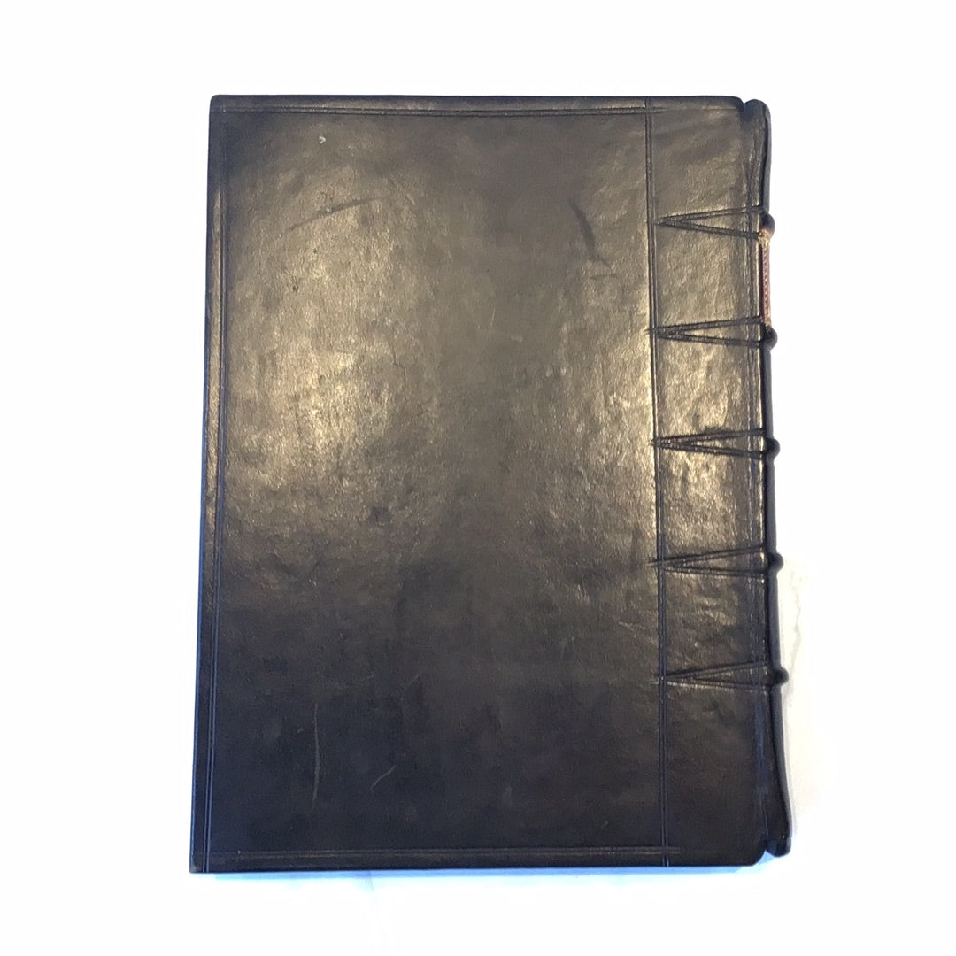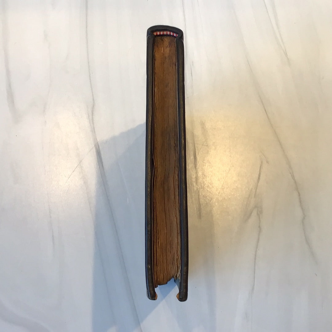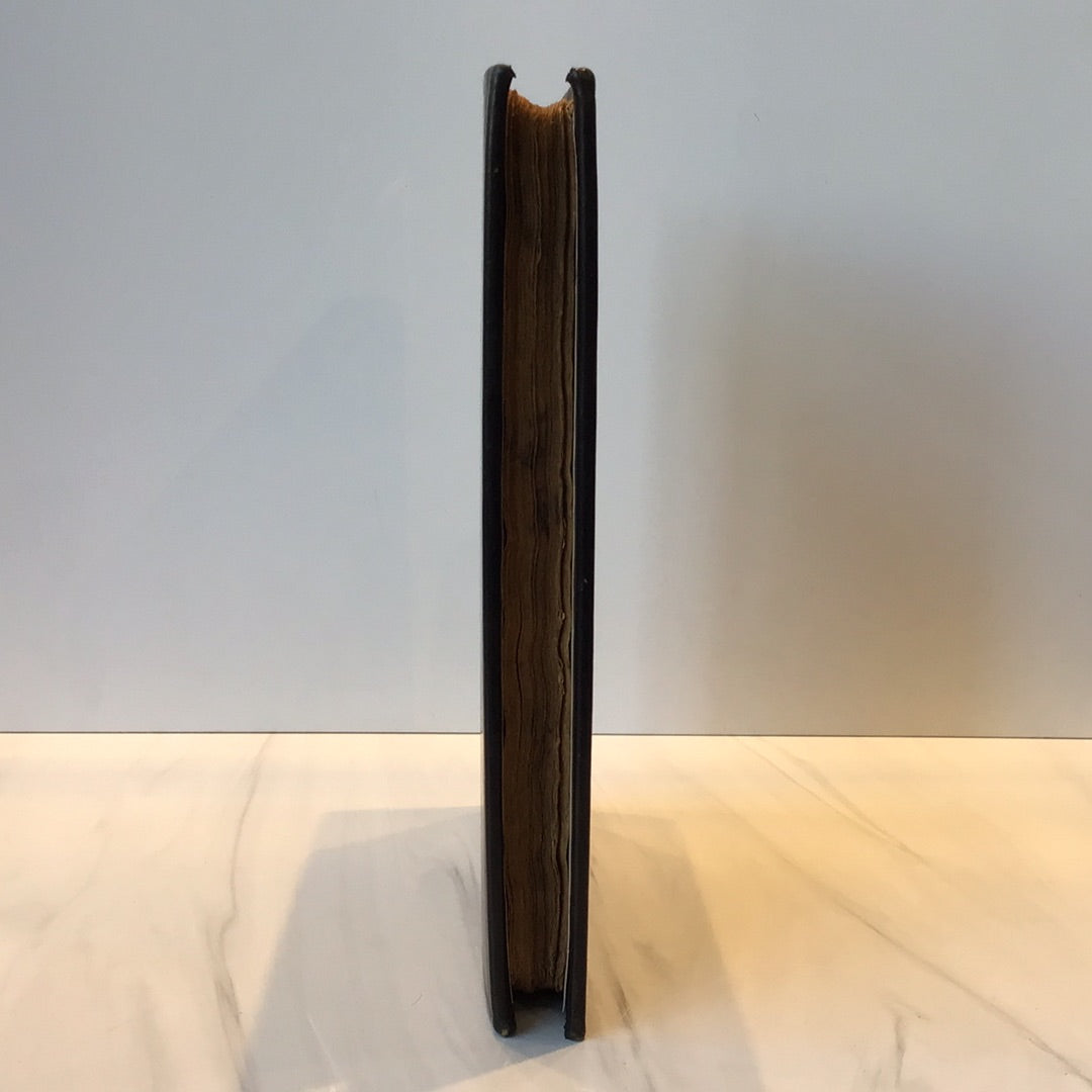 Black leather rebound, title page and entire text original, browning due to age on paper, very good condition.