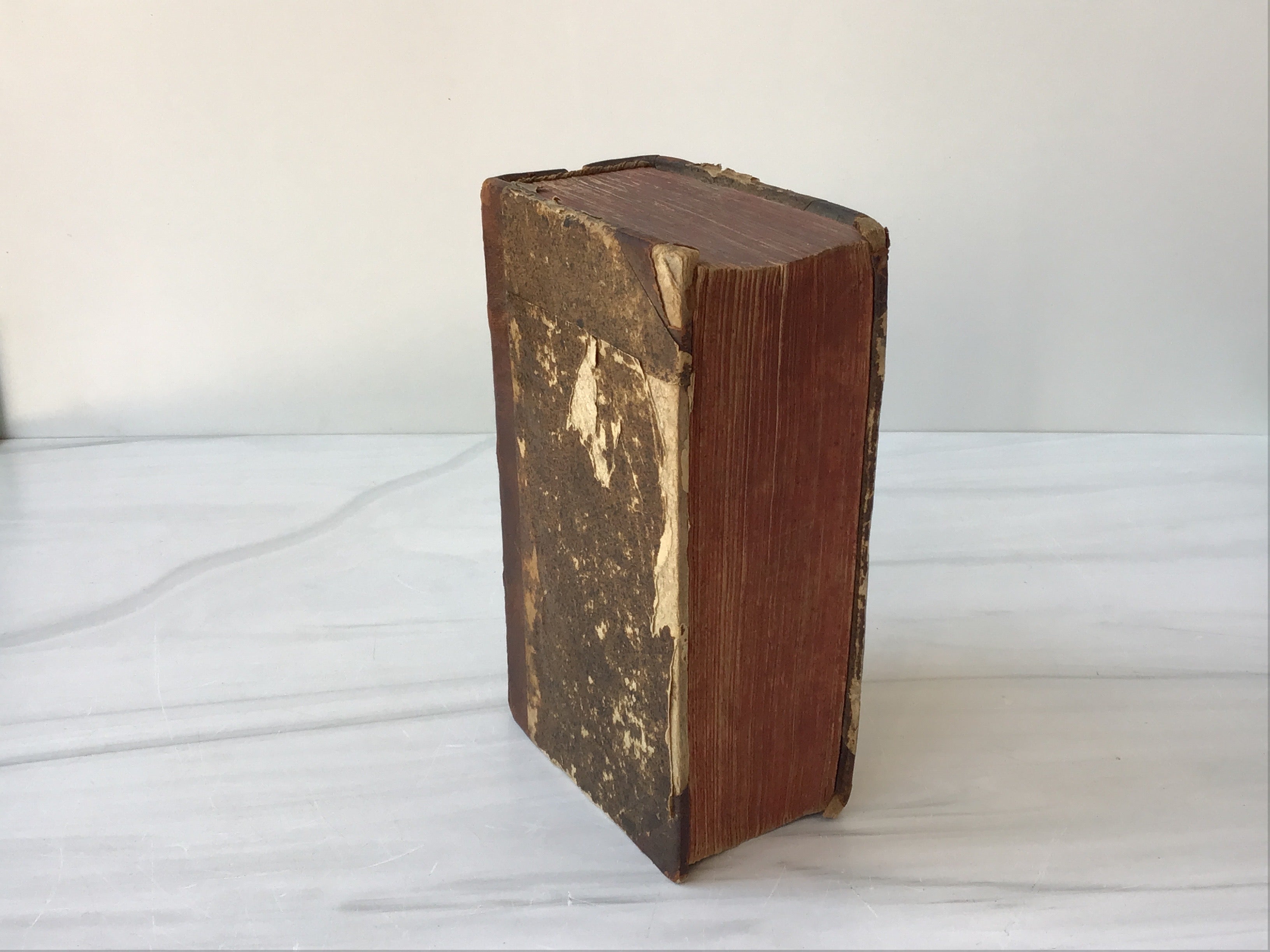 Red edge leather brown leather bible, three raised bands, red edges, wear on front, back, intact, fair condition.
