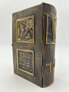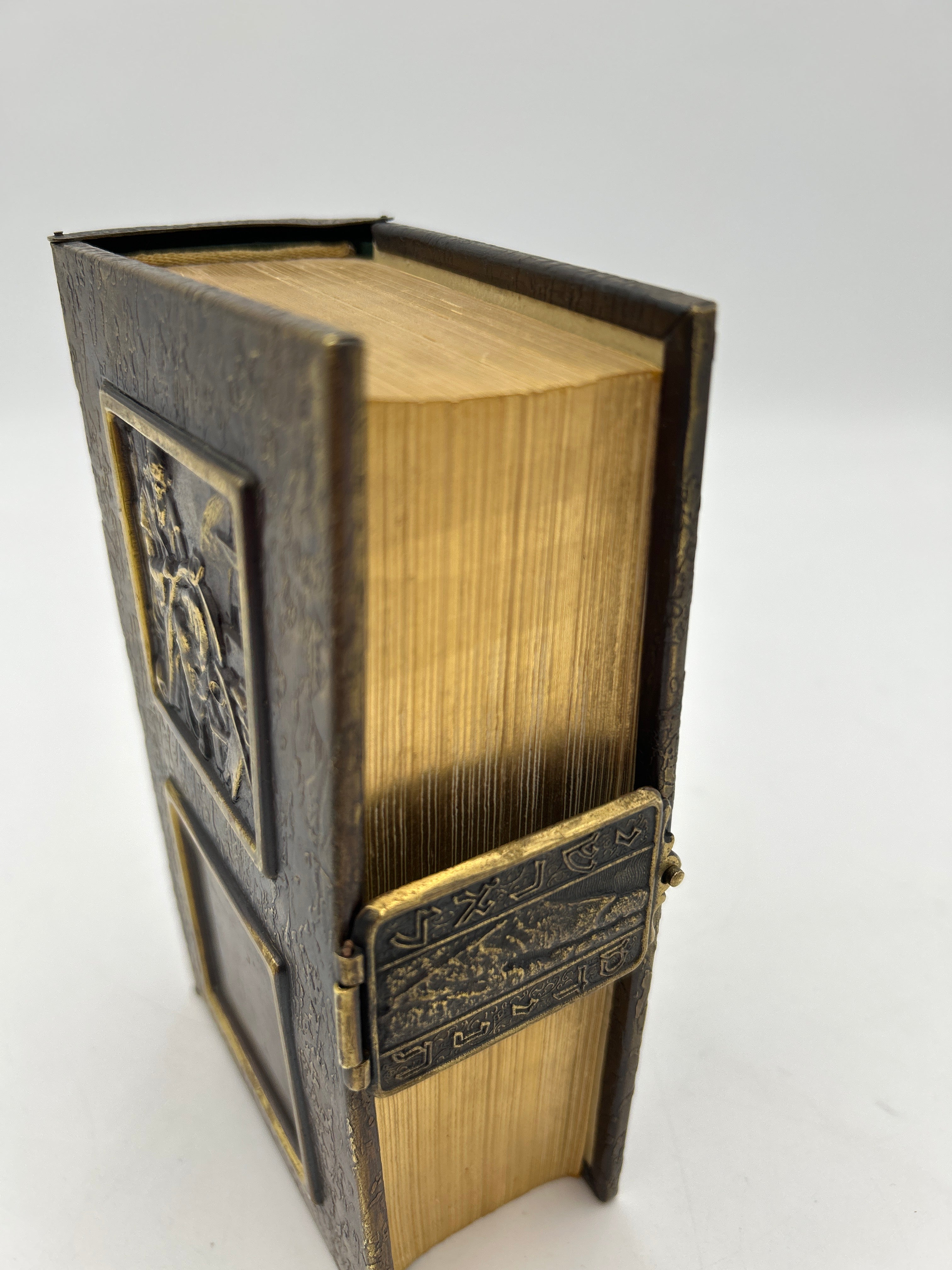 Fully engraved brass binding with enclosure clasp. Red and black print. Black and white illustrations throughout. Gilded edges. Pristine condition.