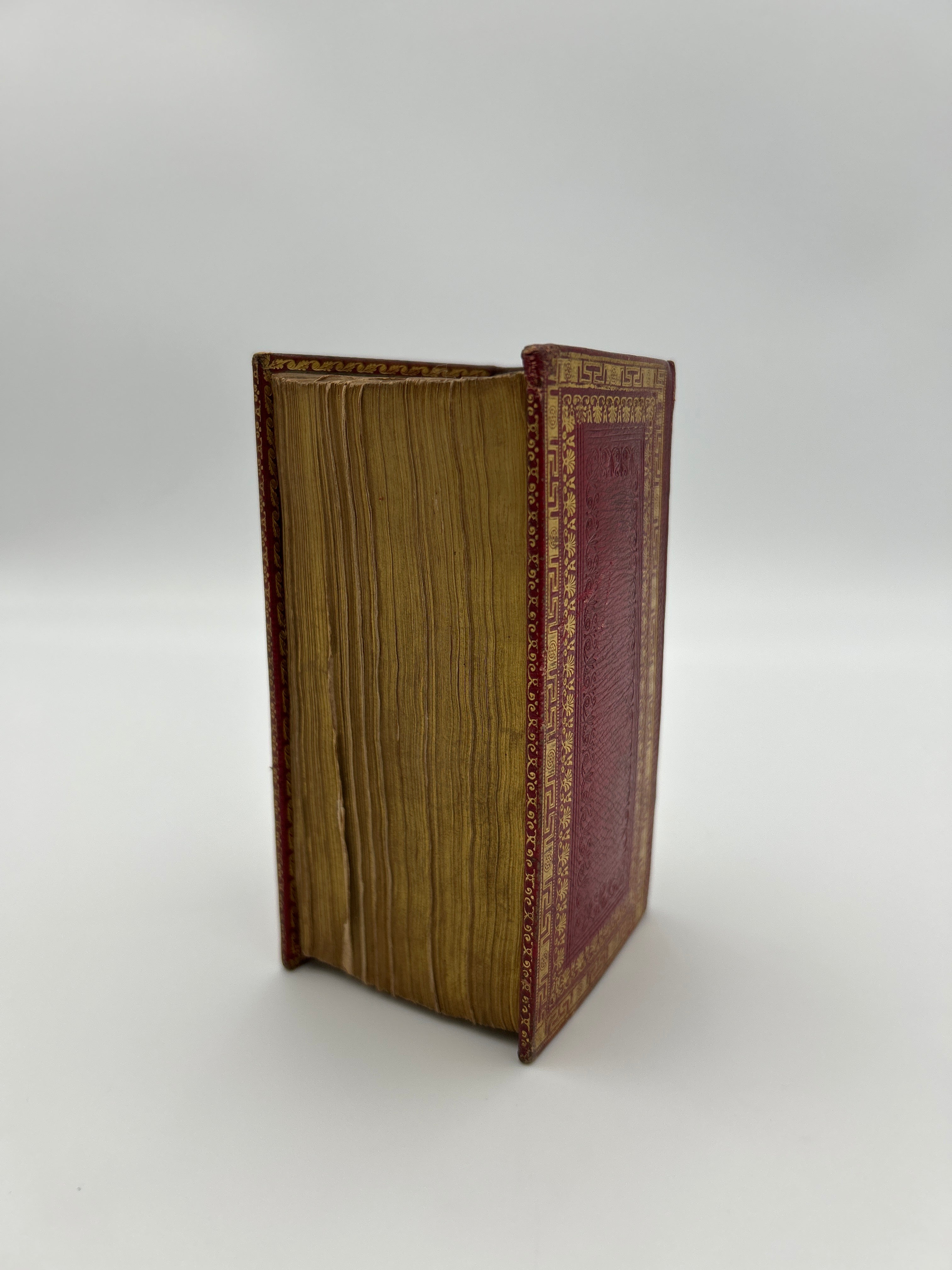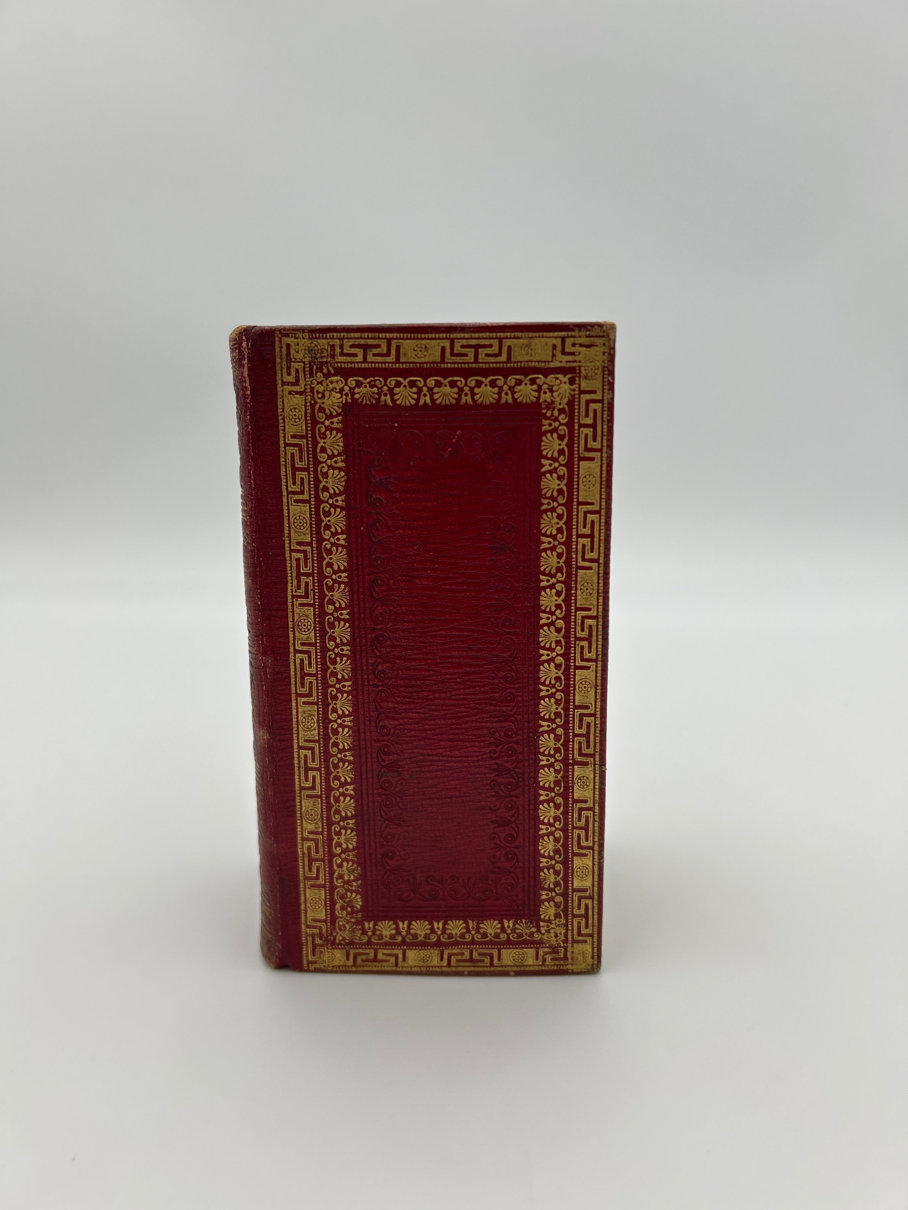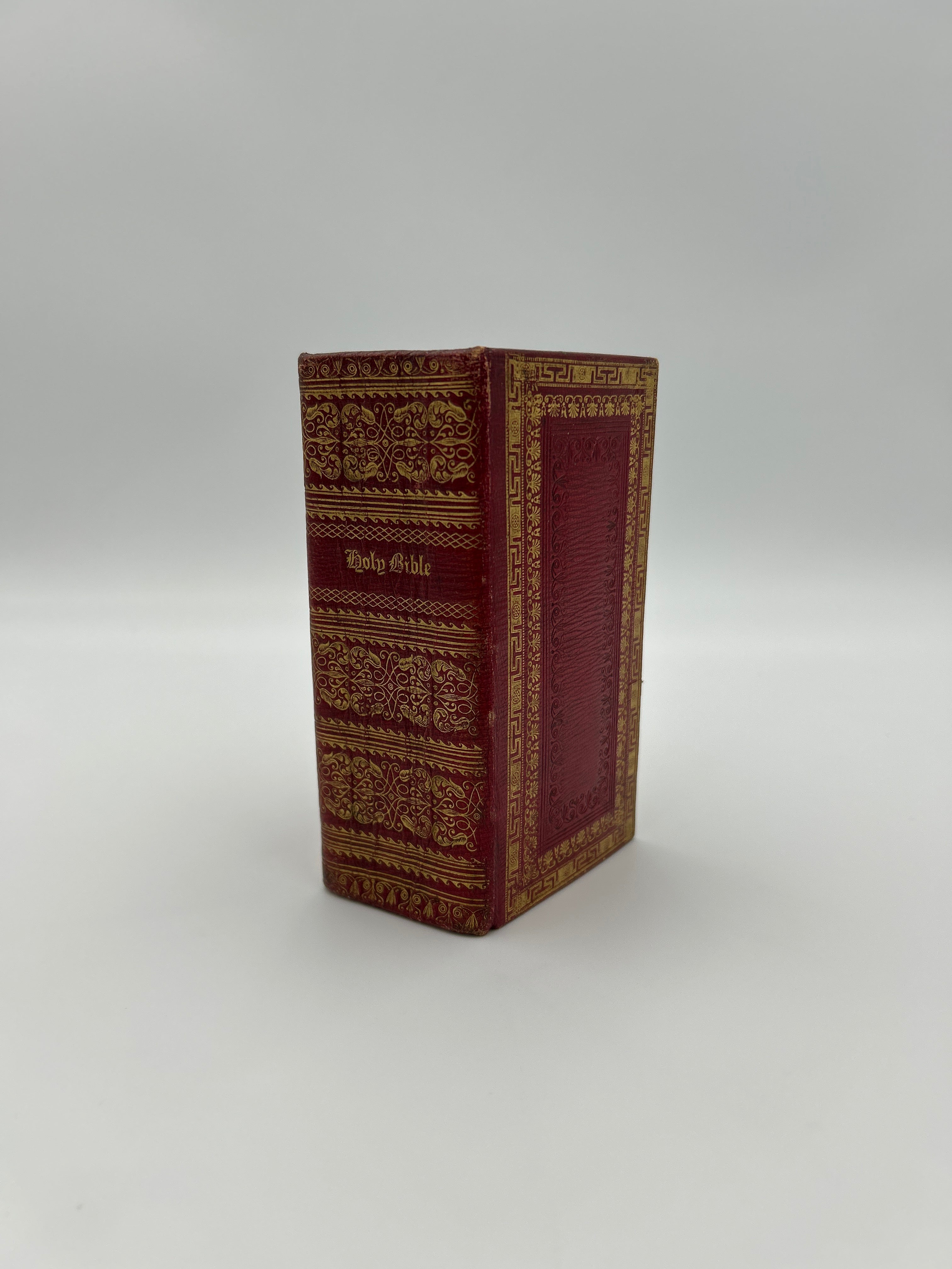 Pocket size red leather with gold tooling front, back and spine, spine beautifully tooled in gold filigree pattern with title, Holy Bible, gold edges around closed book, very good condition