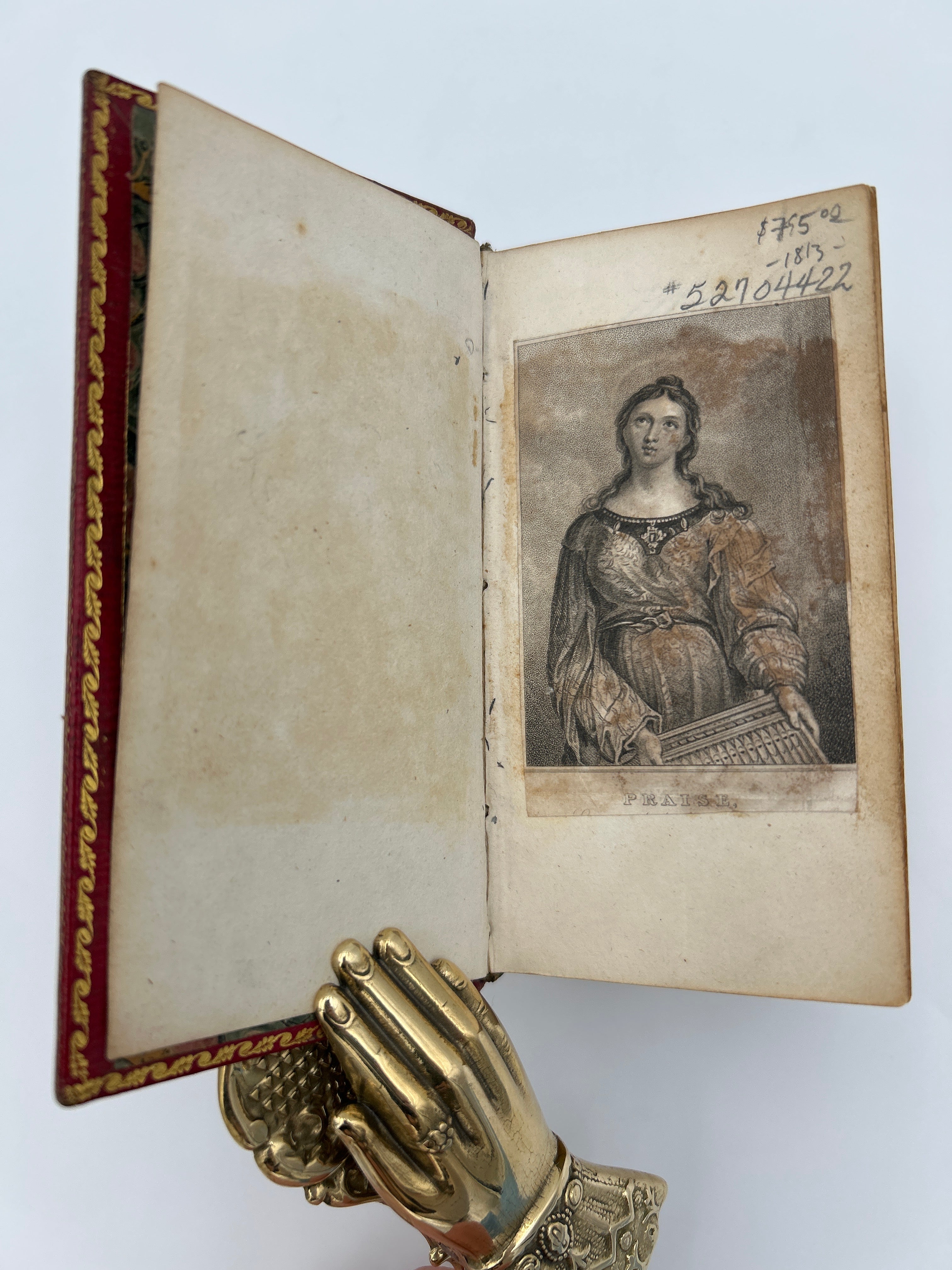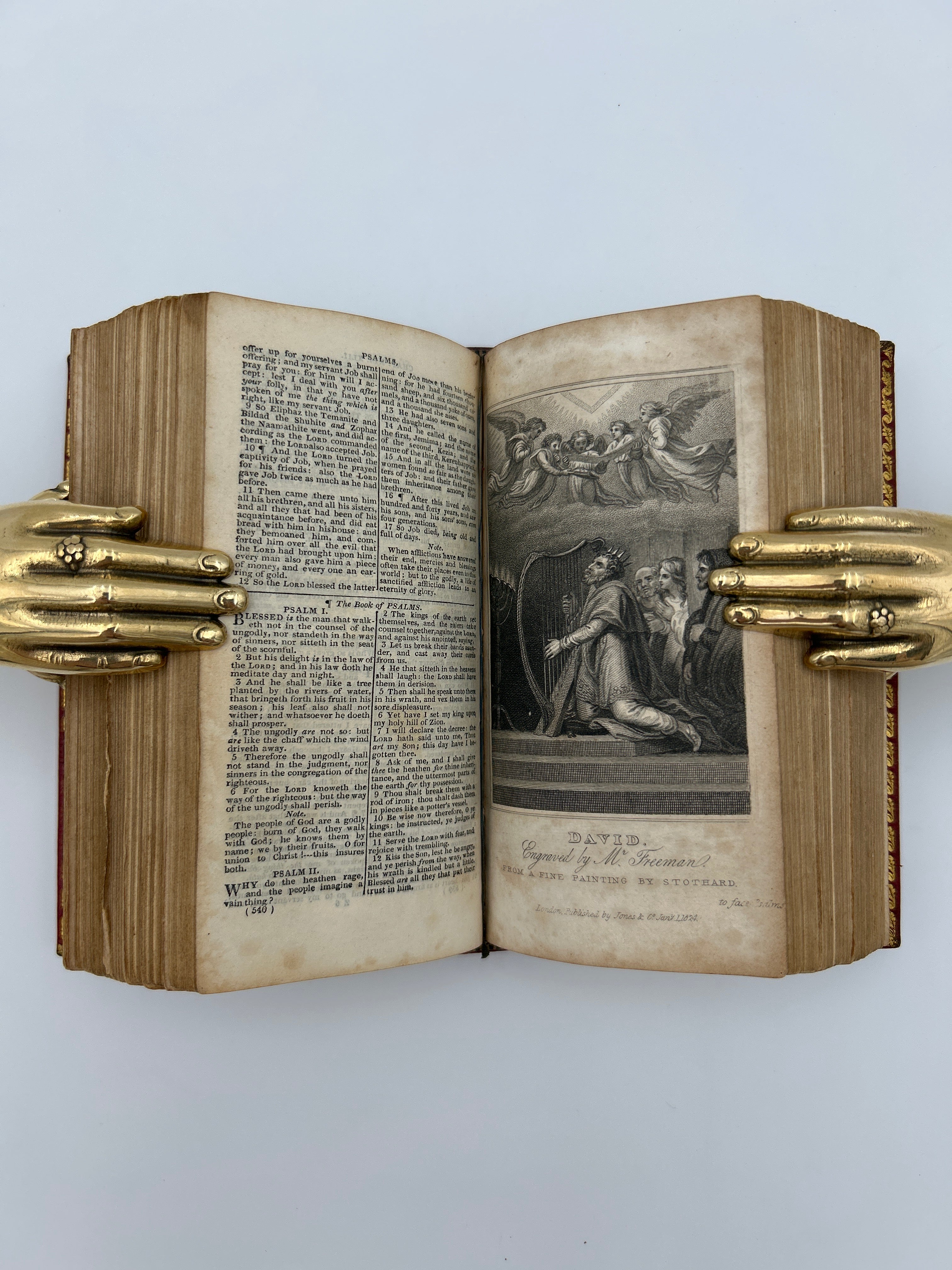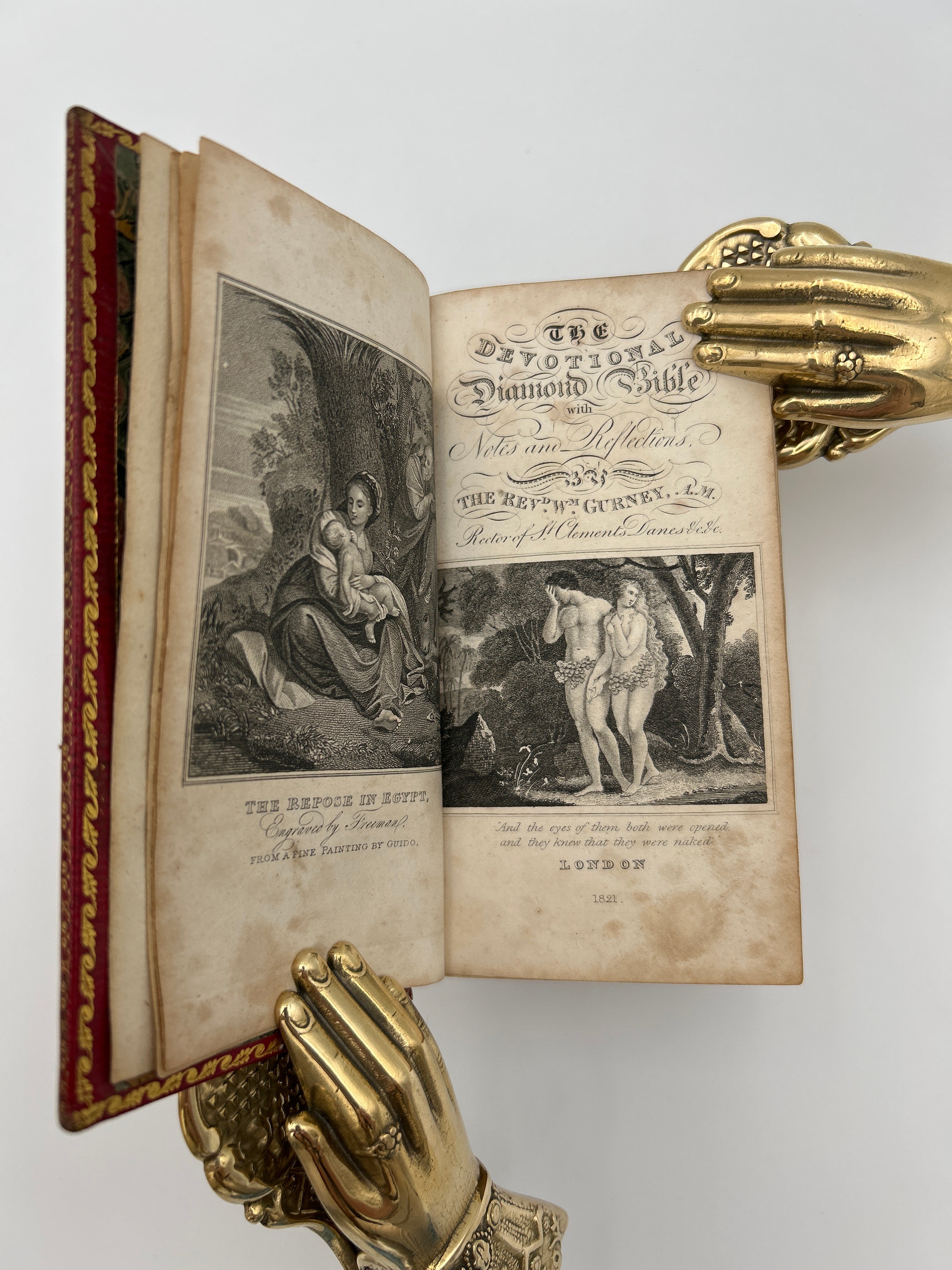Pocket size red leather with gold tooling front, back and spine, spine beautifully tooled in gold filigree pattern with title, Holy Bible, gold edges around closed book, very good condition
