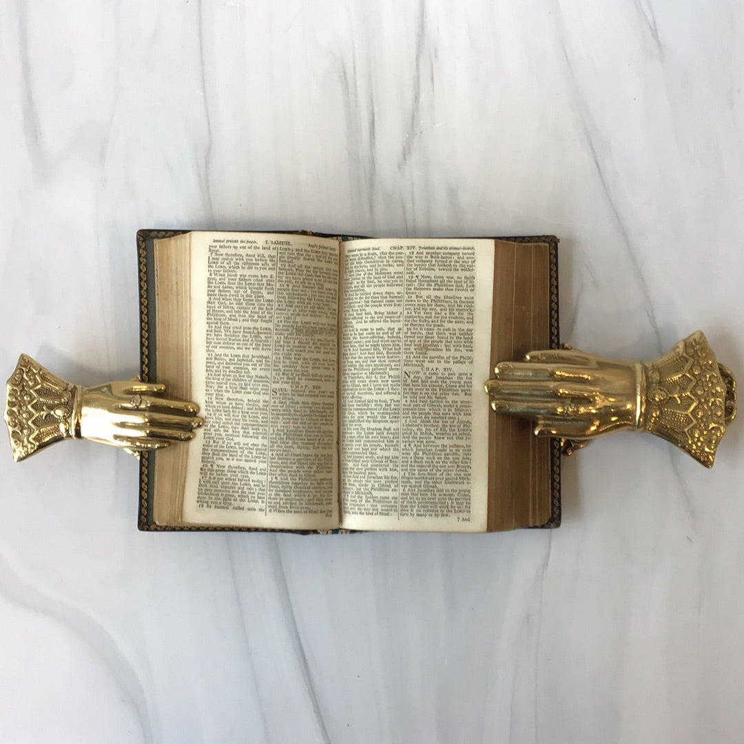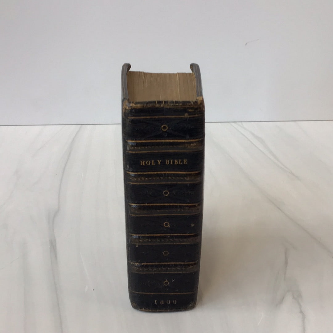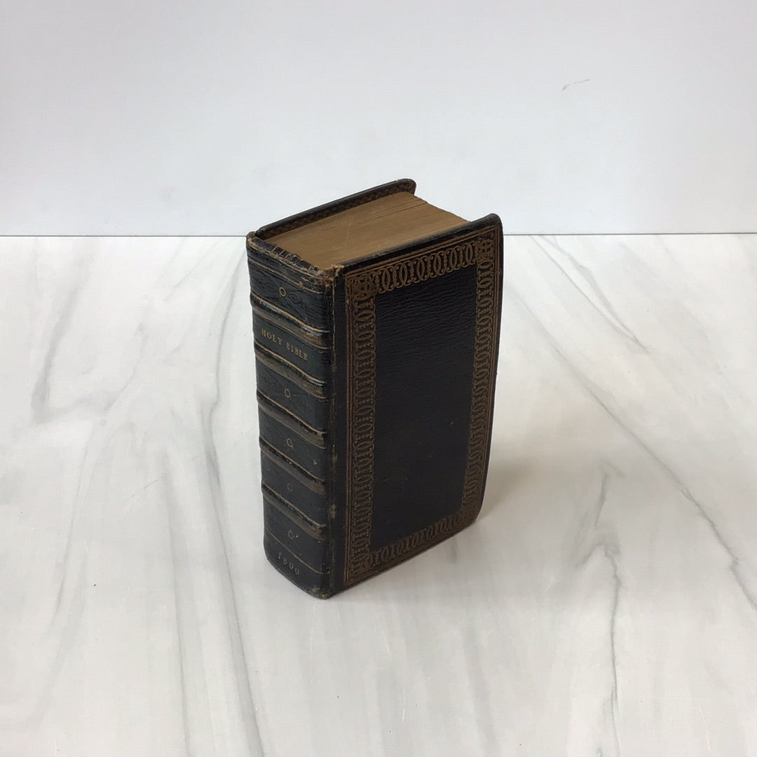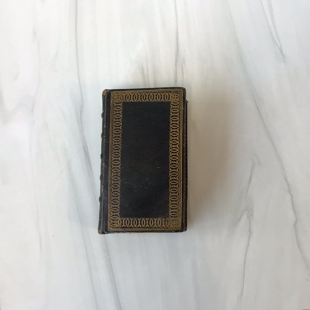 Pocket size black leather with gold tooling around front, back and spine, gold edges, slight rubbing around outside edges, five raised bands on spine, very good condition.