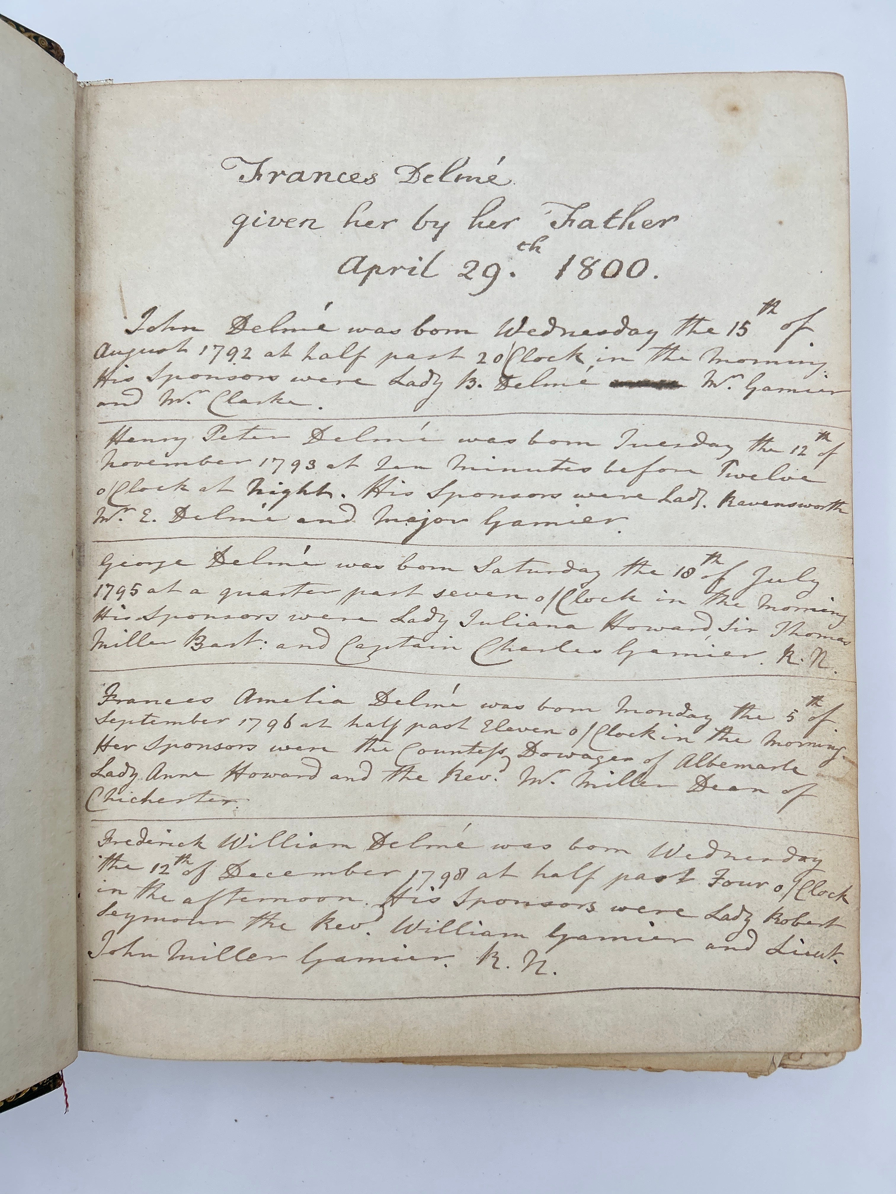 Green Morocco leather with gilt tooled borders and gilt lettered spine. Marbled endpapers. Covers a little worn with slight rubbing and fading to spine. Hinges with upper cover slightly cracked. Title page and first gathering has slightly frayed edges and repaired title page. Blank preliminaries inscribed “John and Francis Delme were married July the 25th 1791”. On opposite page is written, “Francis Delme giver her by her Father April 29th 1800” and under are biographical notes about members of the family.