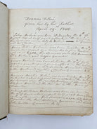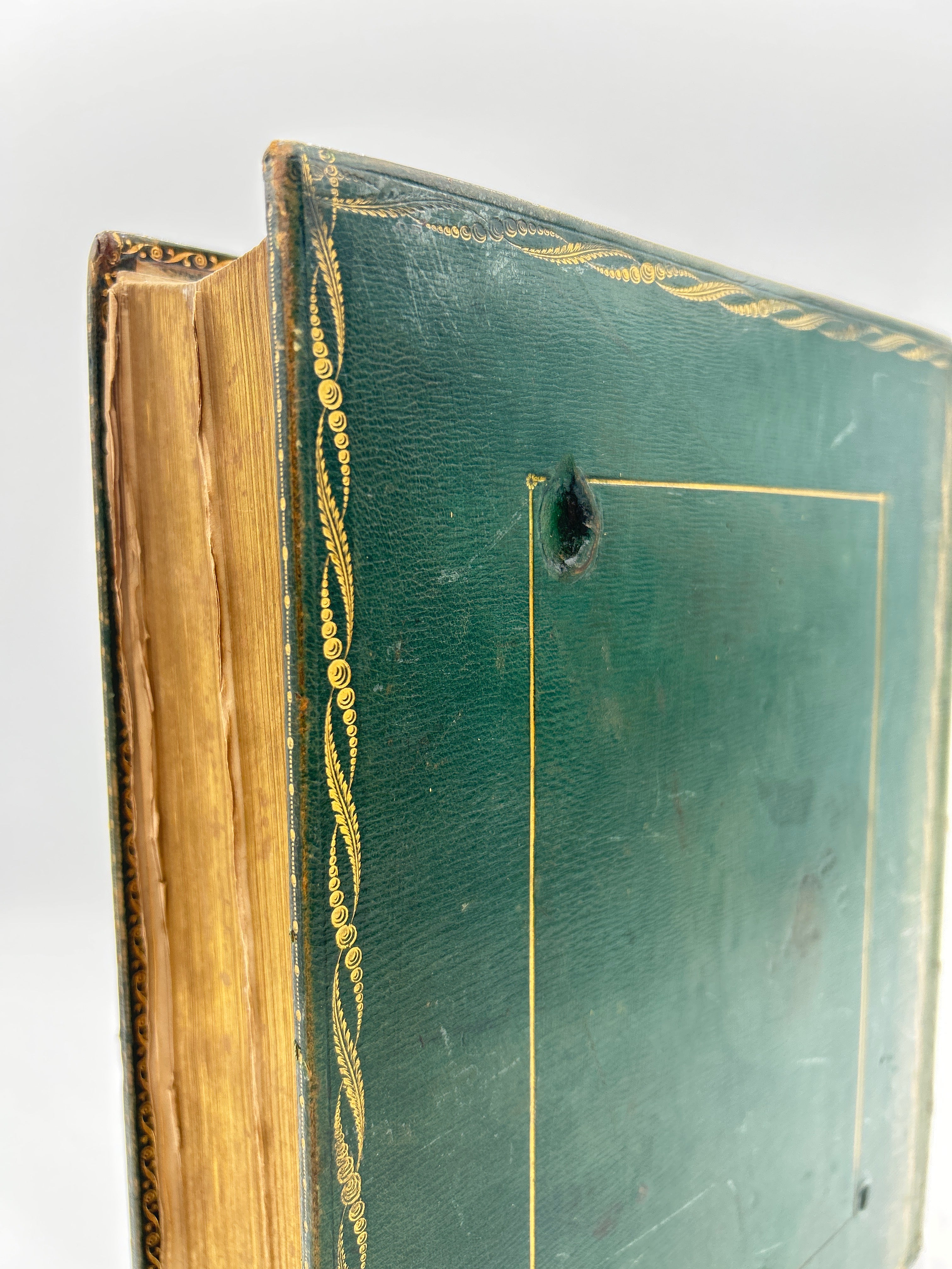 Green Morocco leather with gilt tooled borders and gilt lettered spine. Marbled endpapers. Covers a little worn with slight rubbing and fading to spine. Hinges with upper cover slightly cracked. Title page and first gathering has slightly frayed edges adn repaired title page. Blank preliminaries inscribed “John and Francis Delme were married July the 25th 1791”. On opposite page is written, “Francis Delme giver her by her Father April 29th 1800” and under are biographical notes about members of the family.