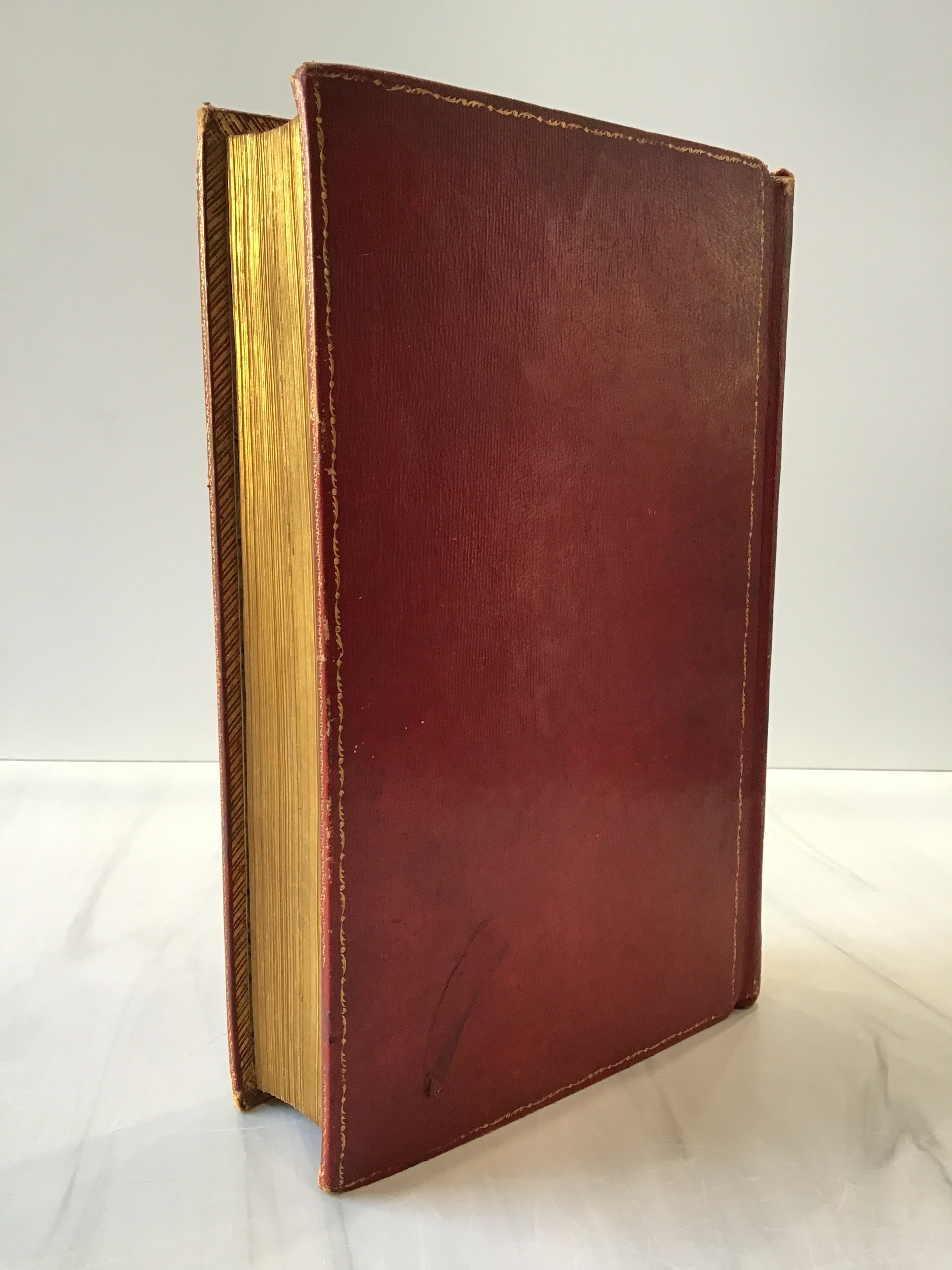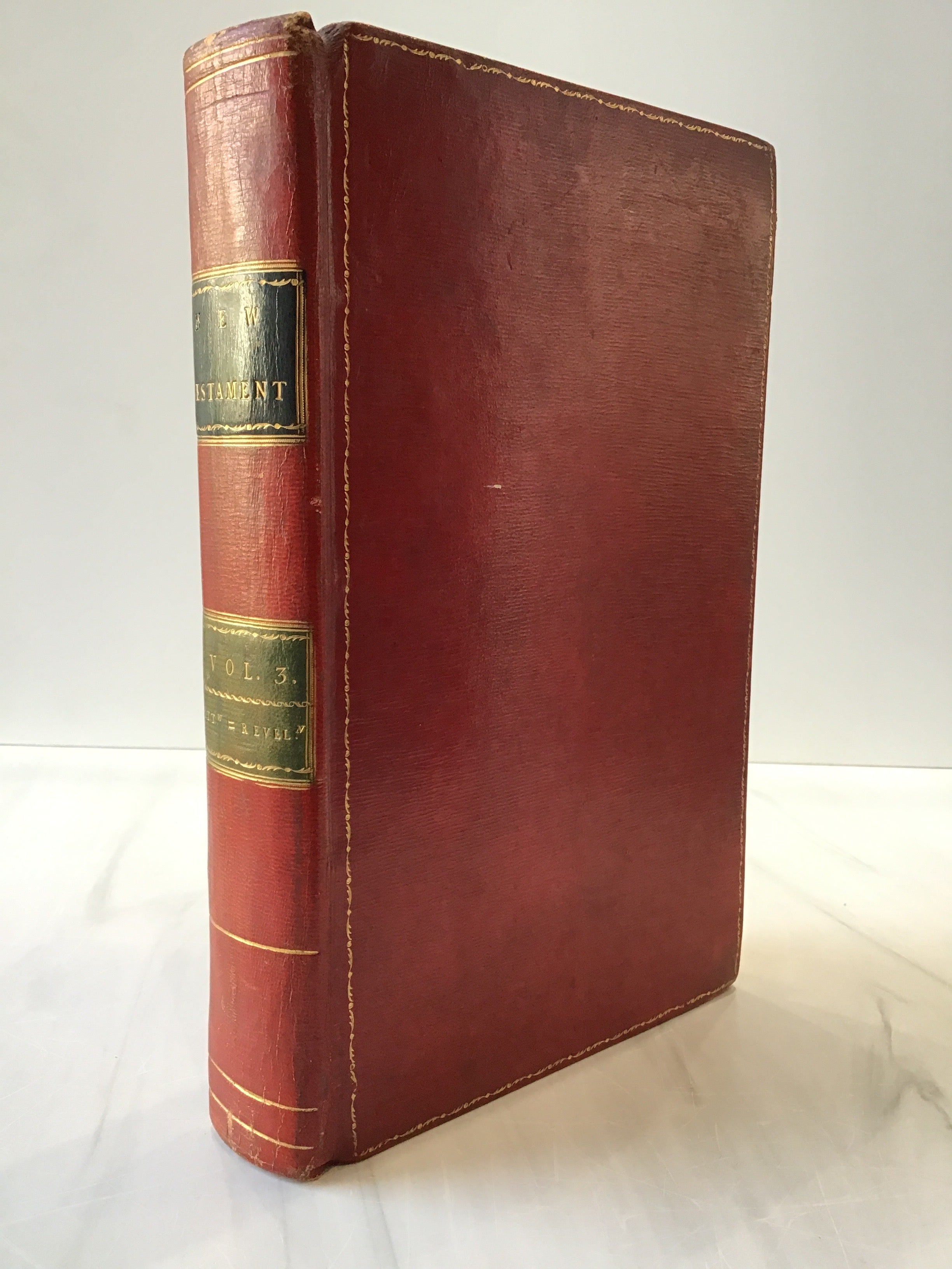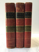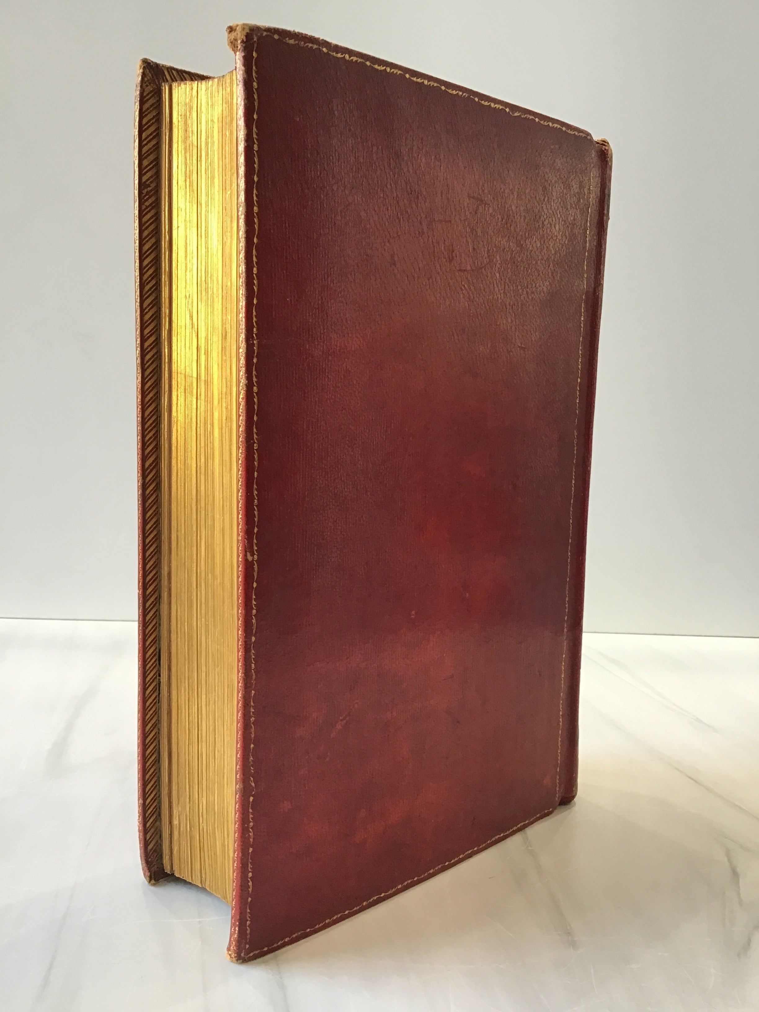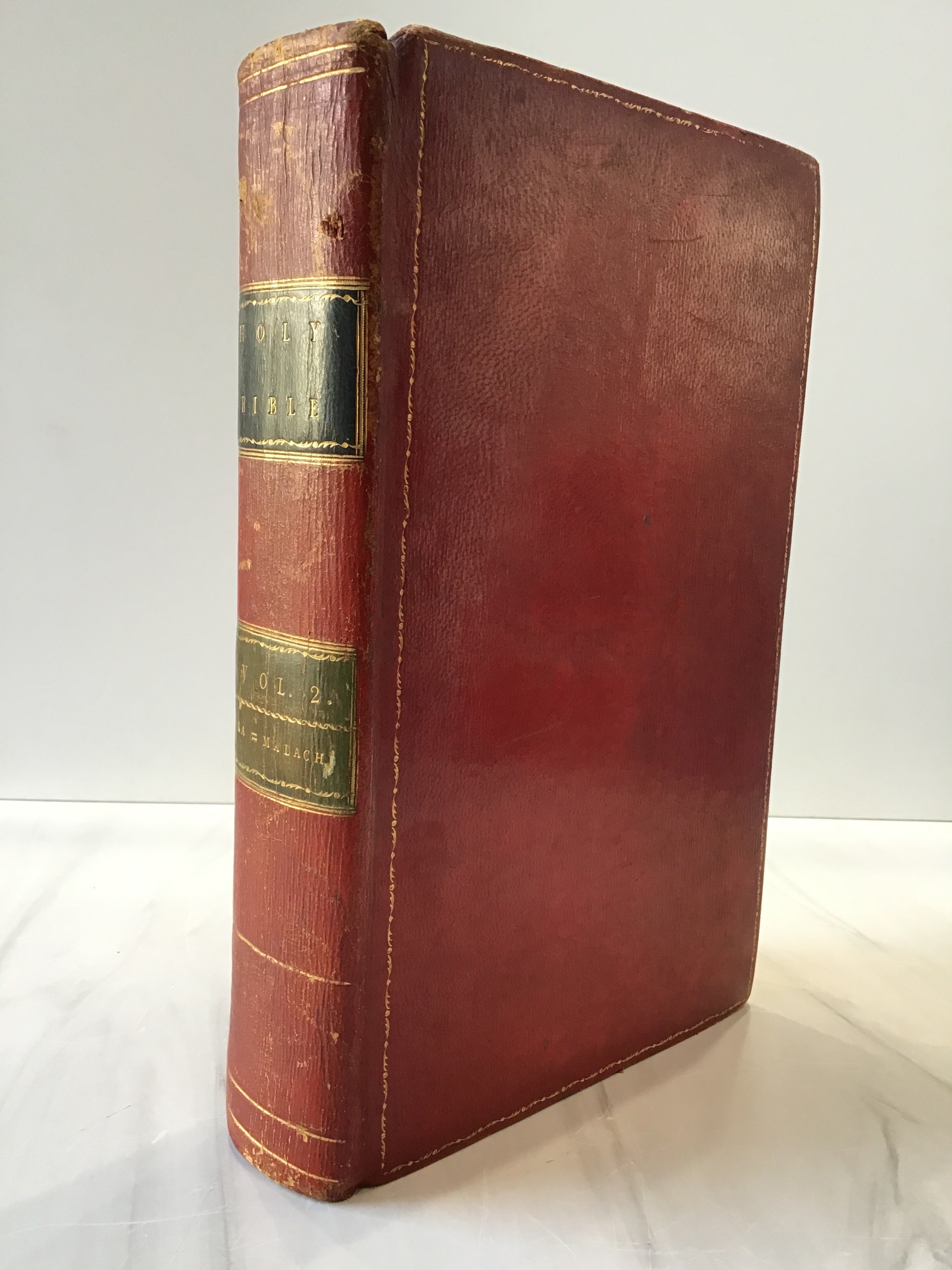 Three red leather hardback books with gold embossed design along front and back covers, a red, and a green box on the spine, gold embossed lettering and designs on the spine, and gold fore edge designs. All three have scuffs and fading to the leather over the covers and spines. Vol 1 has three spots on the front cover where the leather has faded to white. Vol 2 has a tear in the leather on the back cover in the lower right hand corner about three inches long. Vol 3, the New Testament, has an especially worn down spot on the back cover in the top right corner and a white scuff on the front cover. Interiors are in excellent condition with many silver plate etchings throughout.