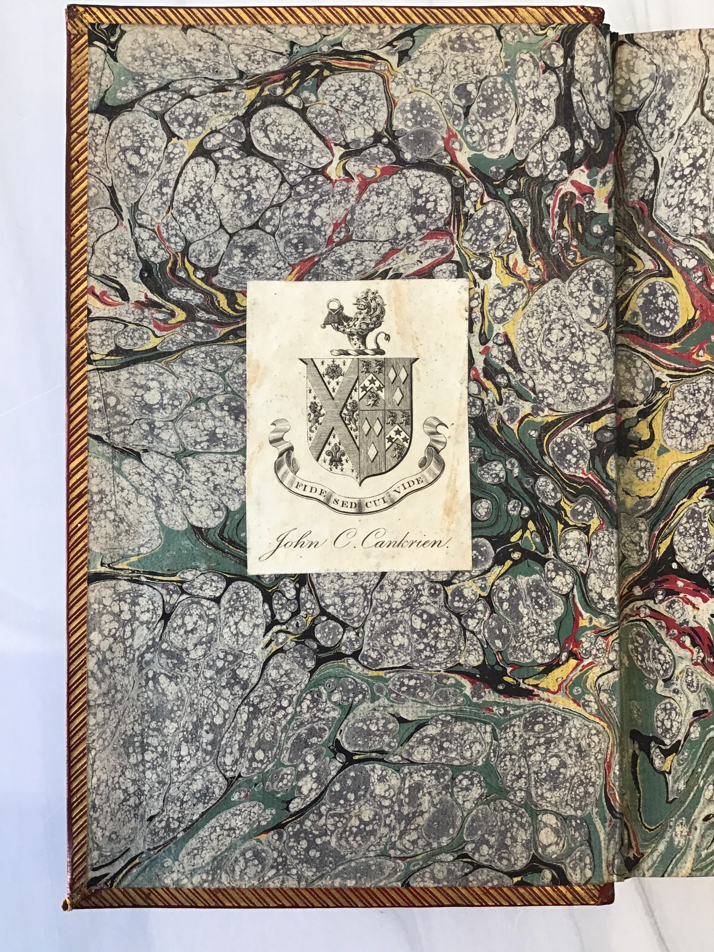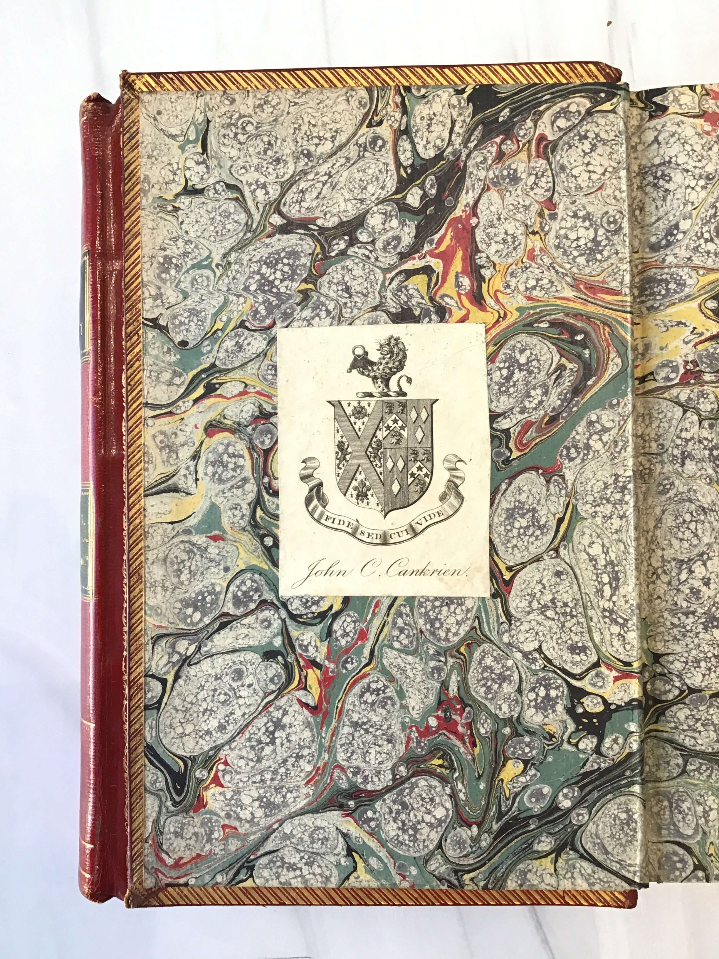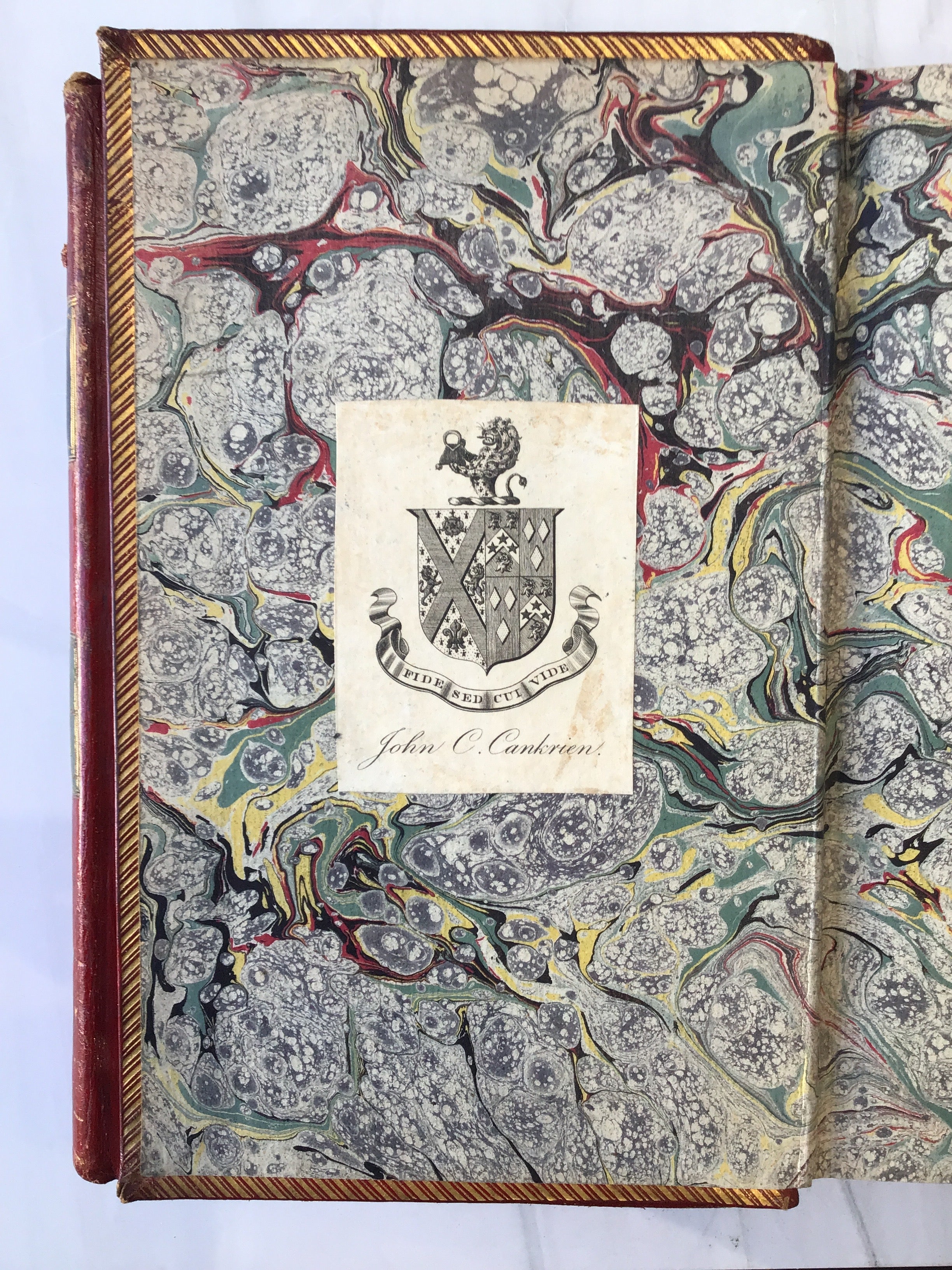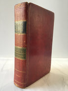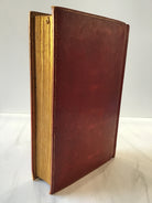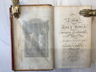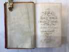 Three red leather hardback books with gold embossed design along front and back covers, a red, and a green box on the spine, gold embossed lettering and designs on the spine, and gold fore edge designs. All three have scuffs and fading to the leather over the covers and spines. Vol 1 has three spots on the front cover where the leather has faded to white. Vol 2 has a tear in the leather on the back cover in the lower right hand corner about three inches long. Vol 3, the New Testament, has an especially worn down spot on the back cover in the top right corner and a white scuff on the front cover. Interiors are in excellent condition with many silver plate etchings throughout.