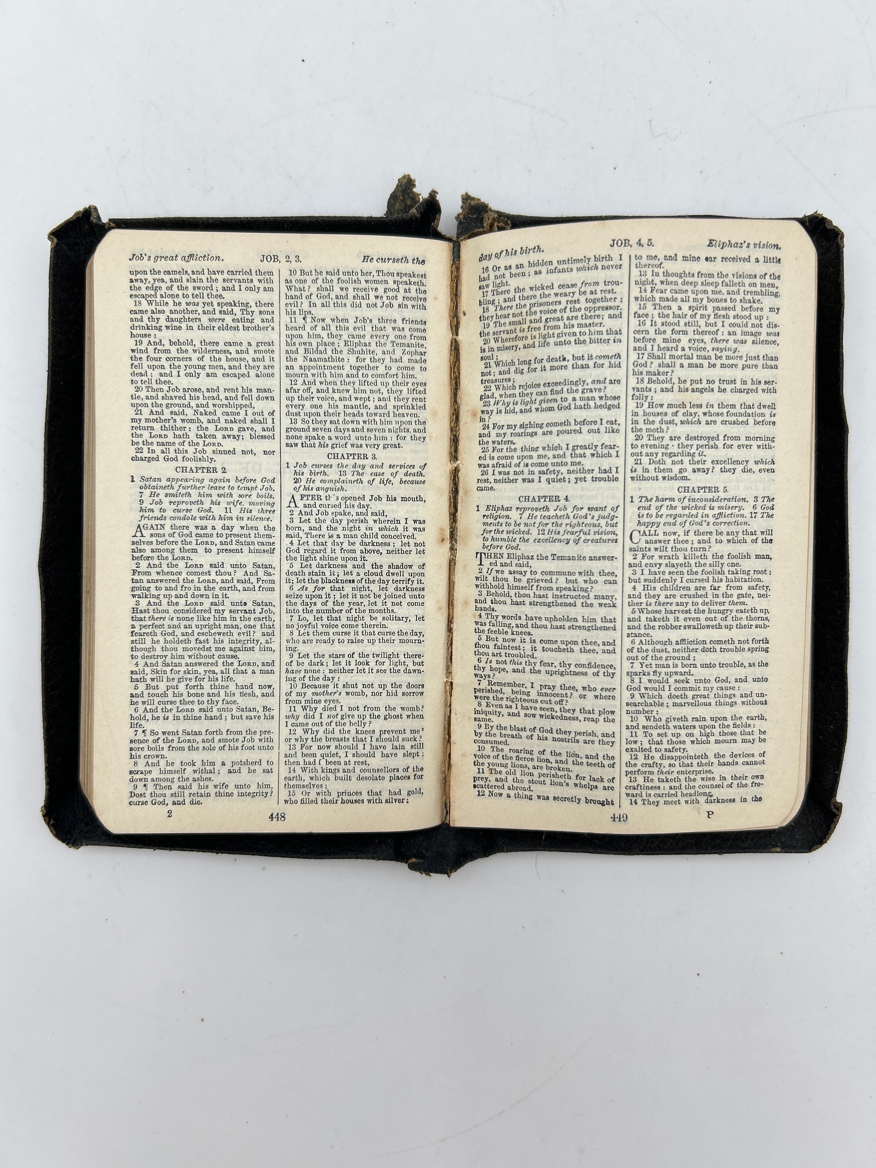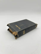 Black pebbled leather with yapp style binding folding over the fore edges to further protect the pages of the book. Gilt lettering to upper board and spine. General fading to leather along edges and fraying especially to upper spine and lower spine. Inscription to interior page “To George with love from Mother. Feb 28th 1919.” Fully intact with wear to hinge between pages 448 and 449.