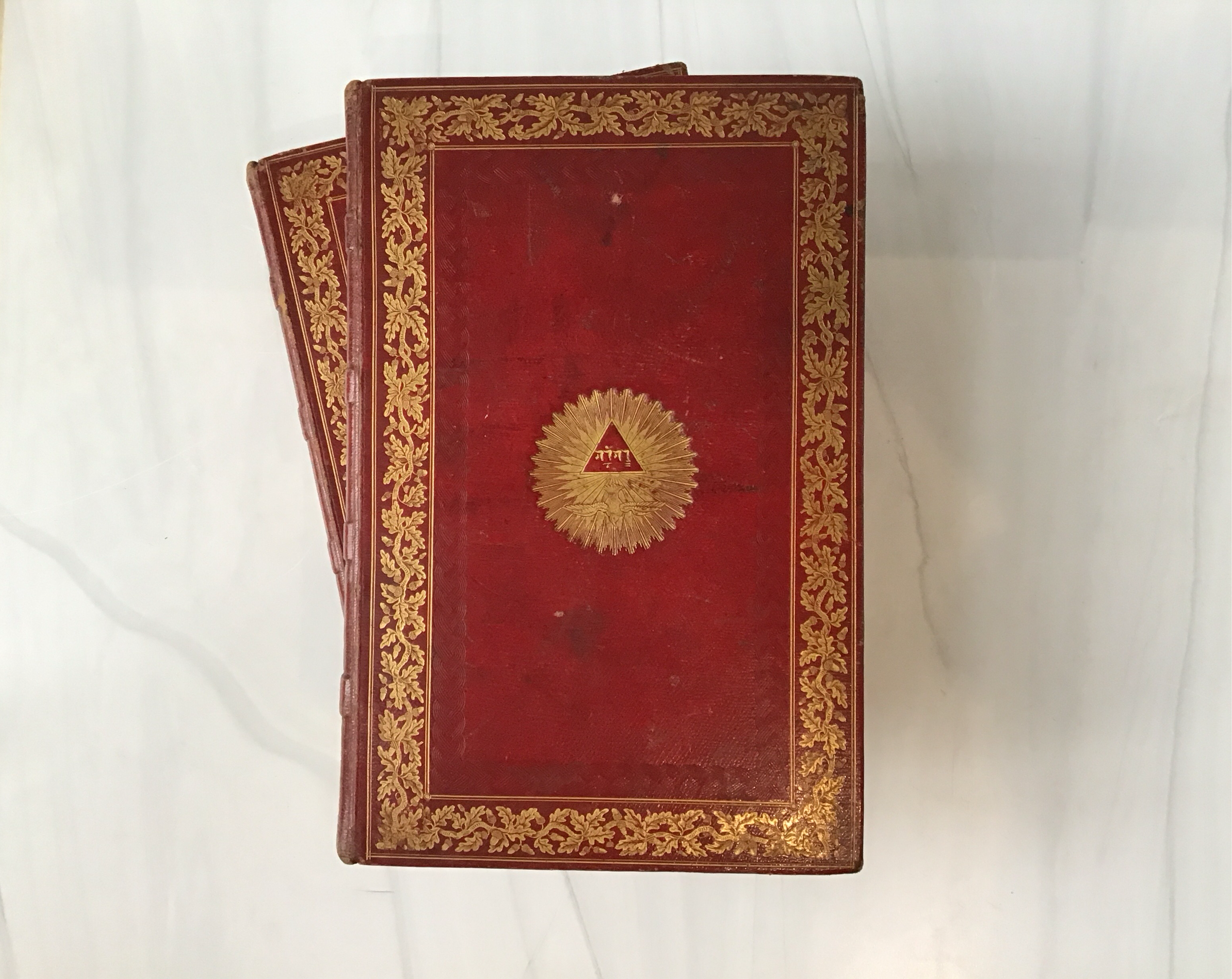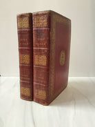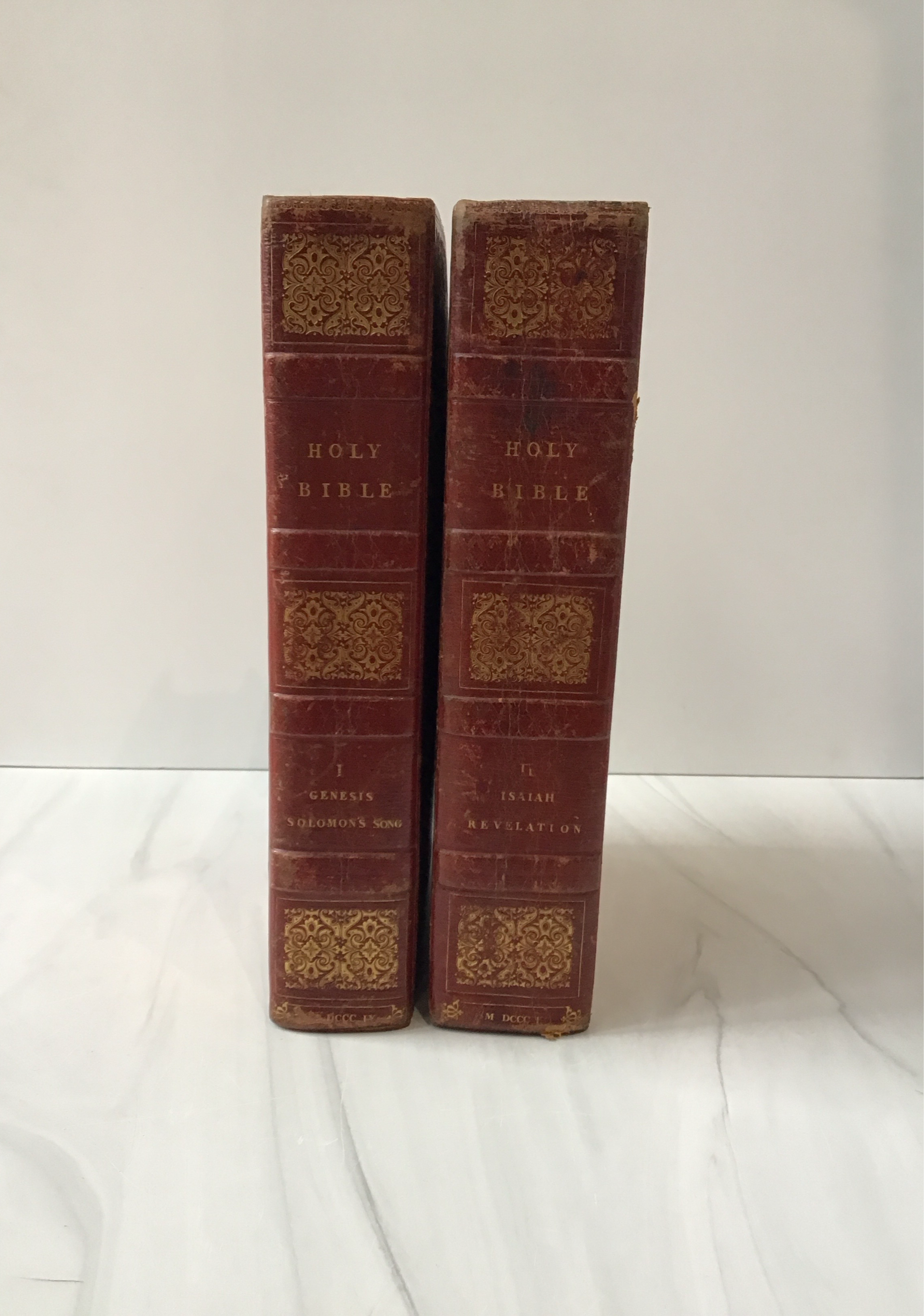 Two large red leather binding with gold embossing on front and back, four raised bands on spine, Vol. I: Genesis - Solomon's Song, Vol 2: Isaiah - Revelation, some rubbing on binding edges, gold three edge , intact, good condition.