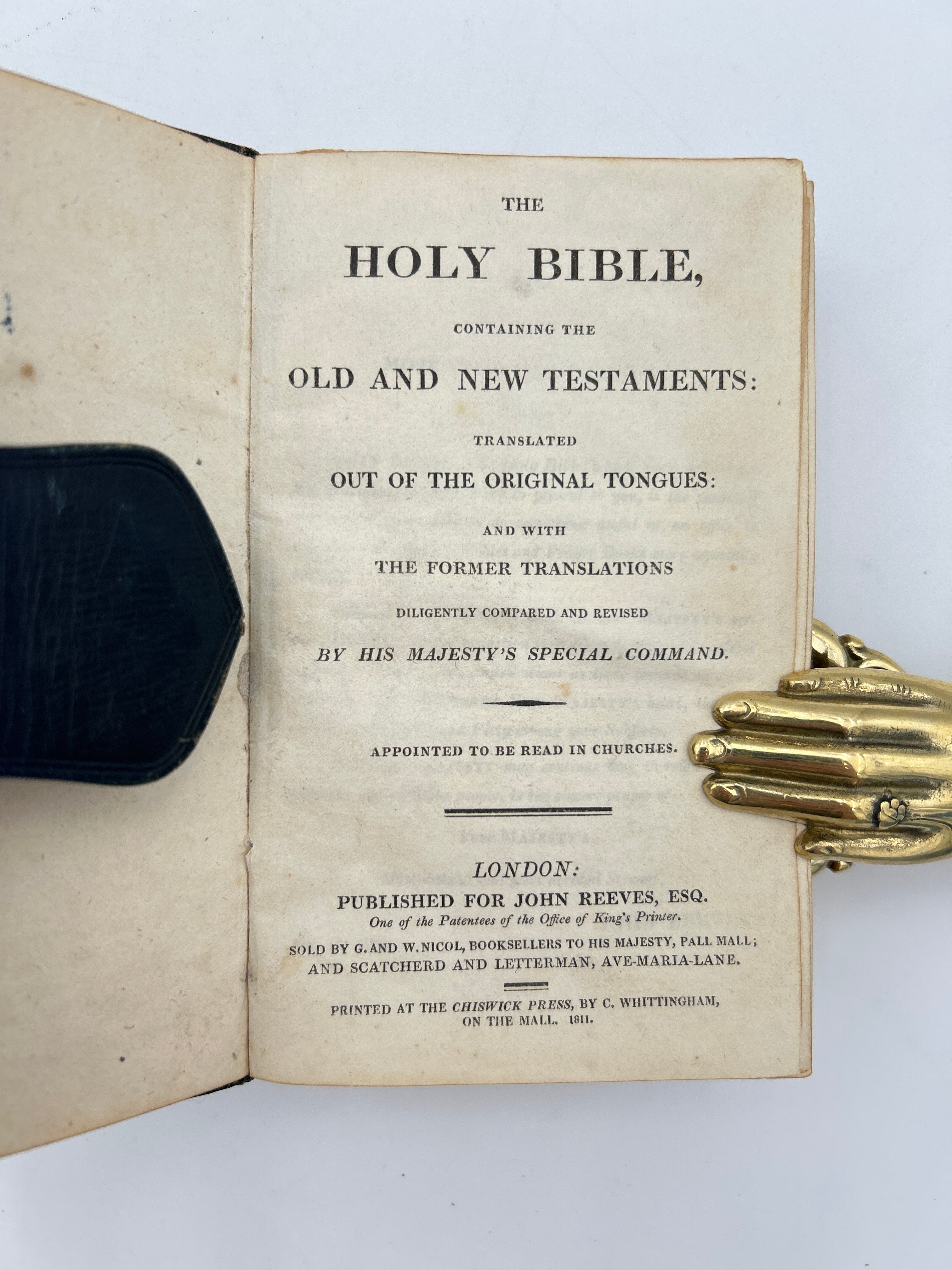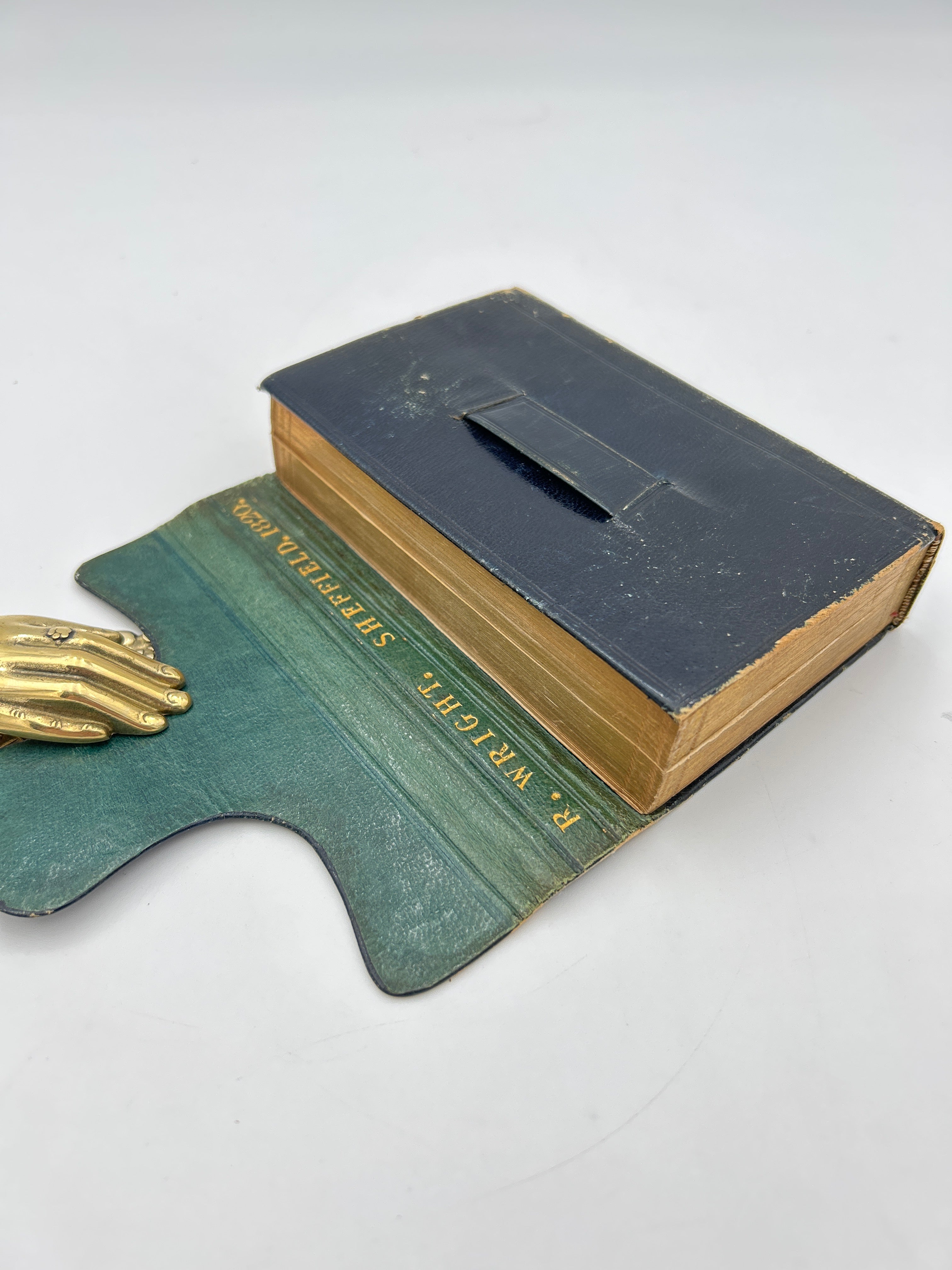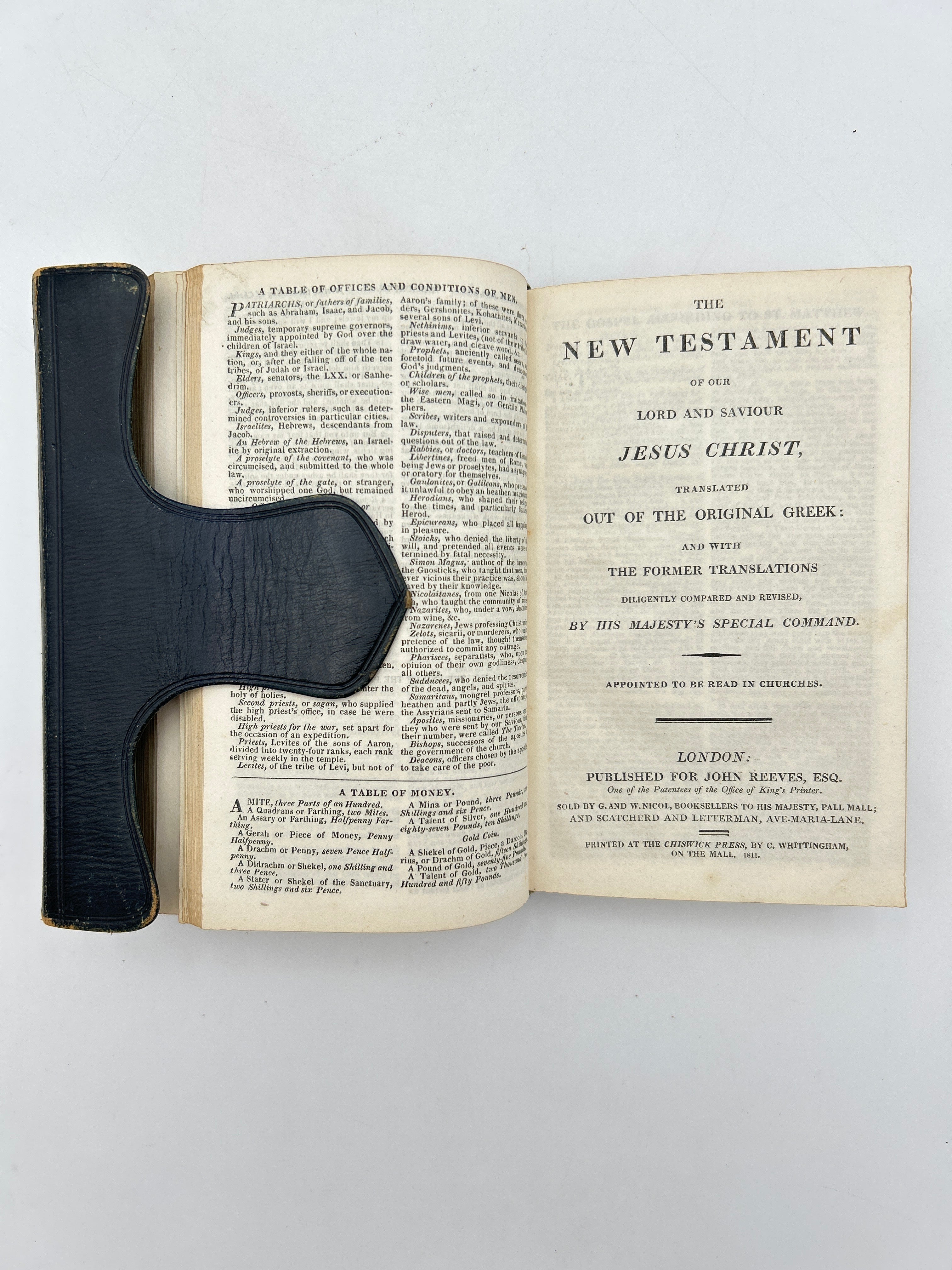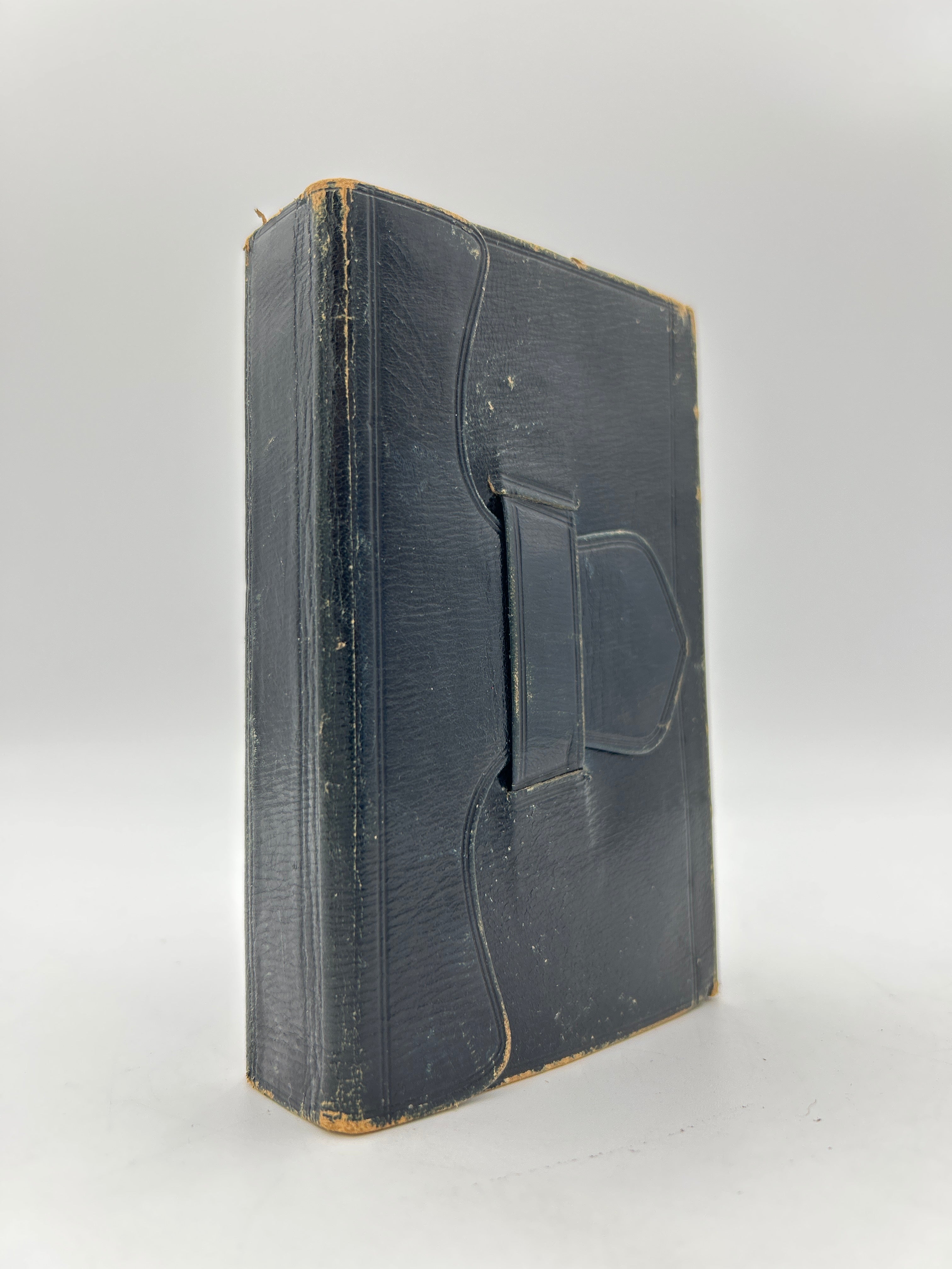 Leather enclosed binding, pocket edition, three edge gold, intact, slight rubbing on outside edges, intact, fine condition.