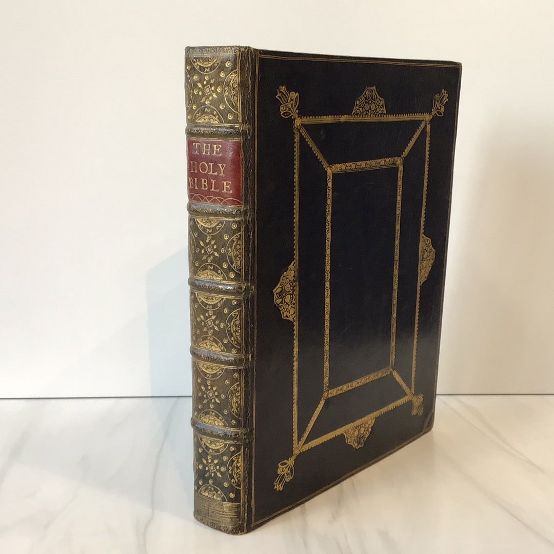 Black morocco leather with gold embossing on front back and spine, five raised bands with red morocco leather band on spine, The Holy Bible, minor rubbing on corners of binding, gilt turn-ins and marbled endpapers, fine condition