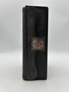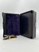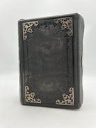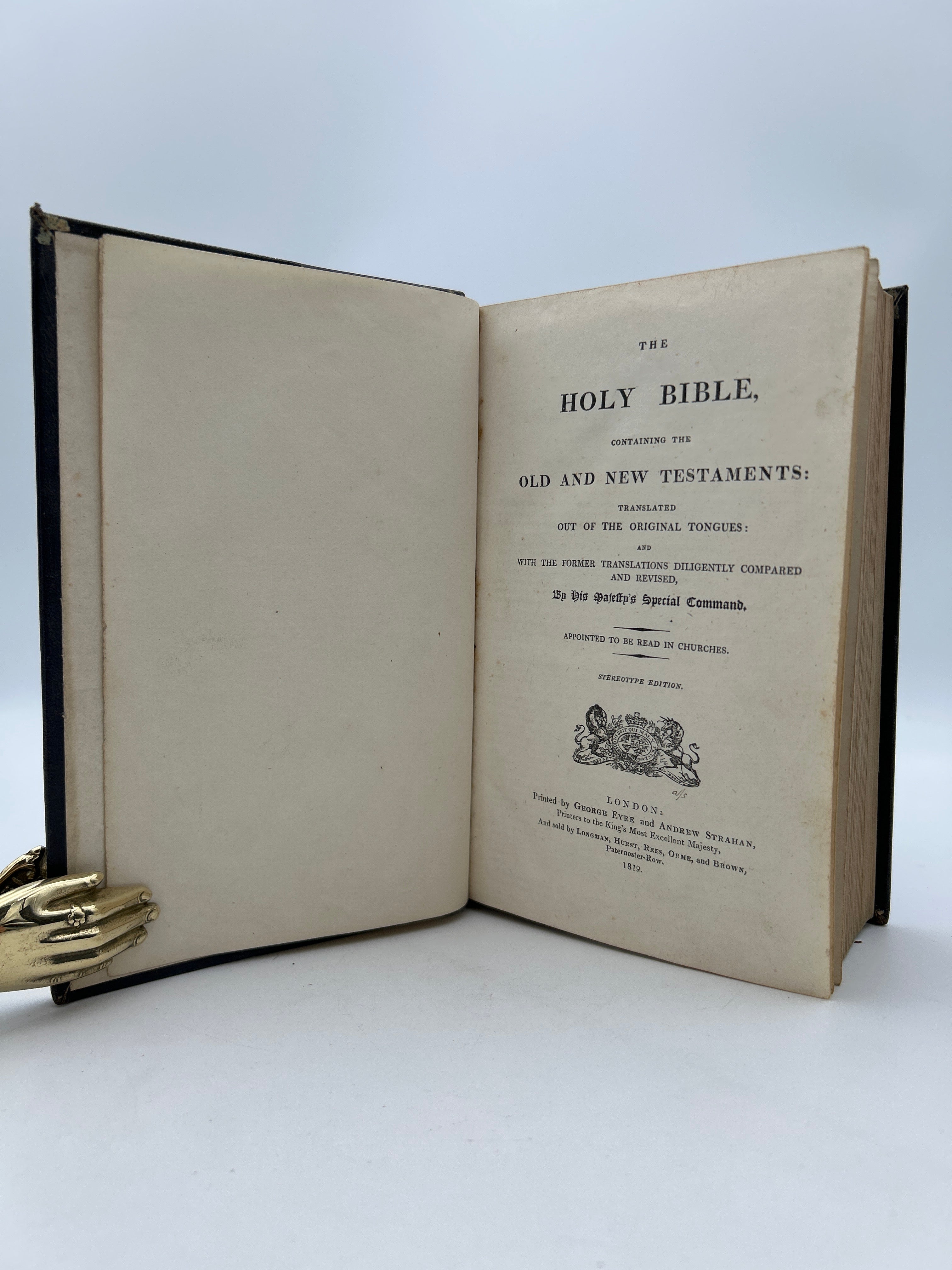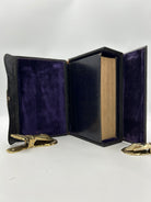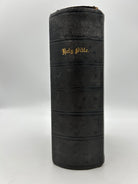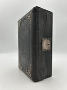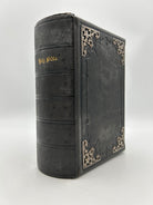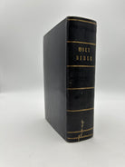 Full dark blue calf leather with gilt ruling and lettering got the spine. Housed in a black Morocco solander box lined with purple velvet. Decorative metal clasp, gilt lettering to the spine and boards decorated with metallic details to the upper board and in blind to the lower. Unique case where a larger Bible is housed in such an ornate box. Very fine condition overall.