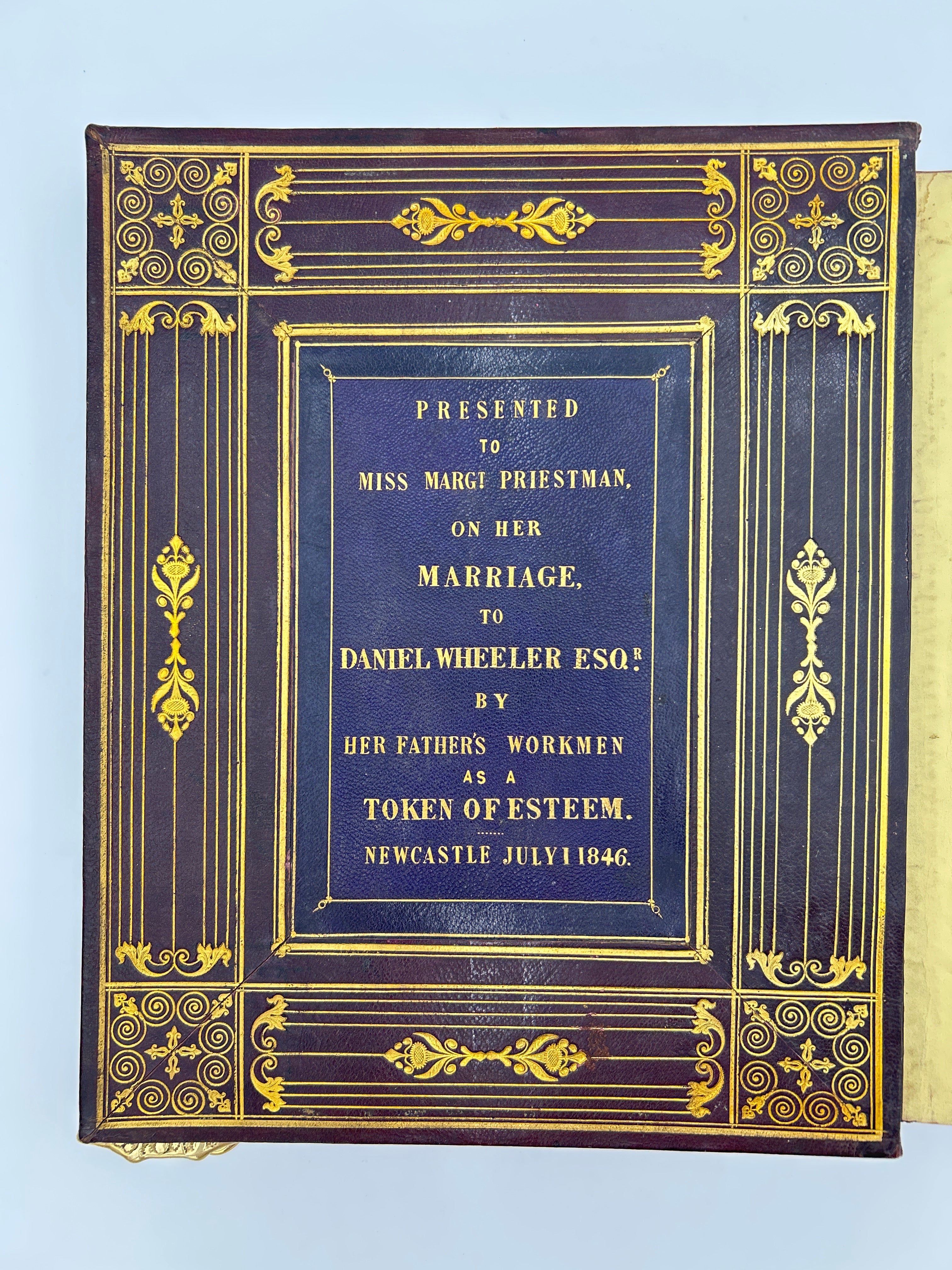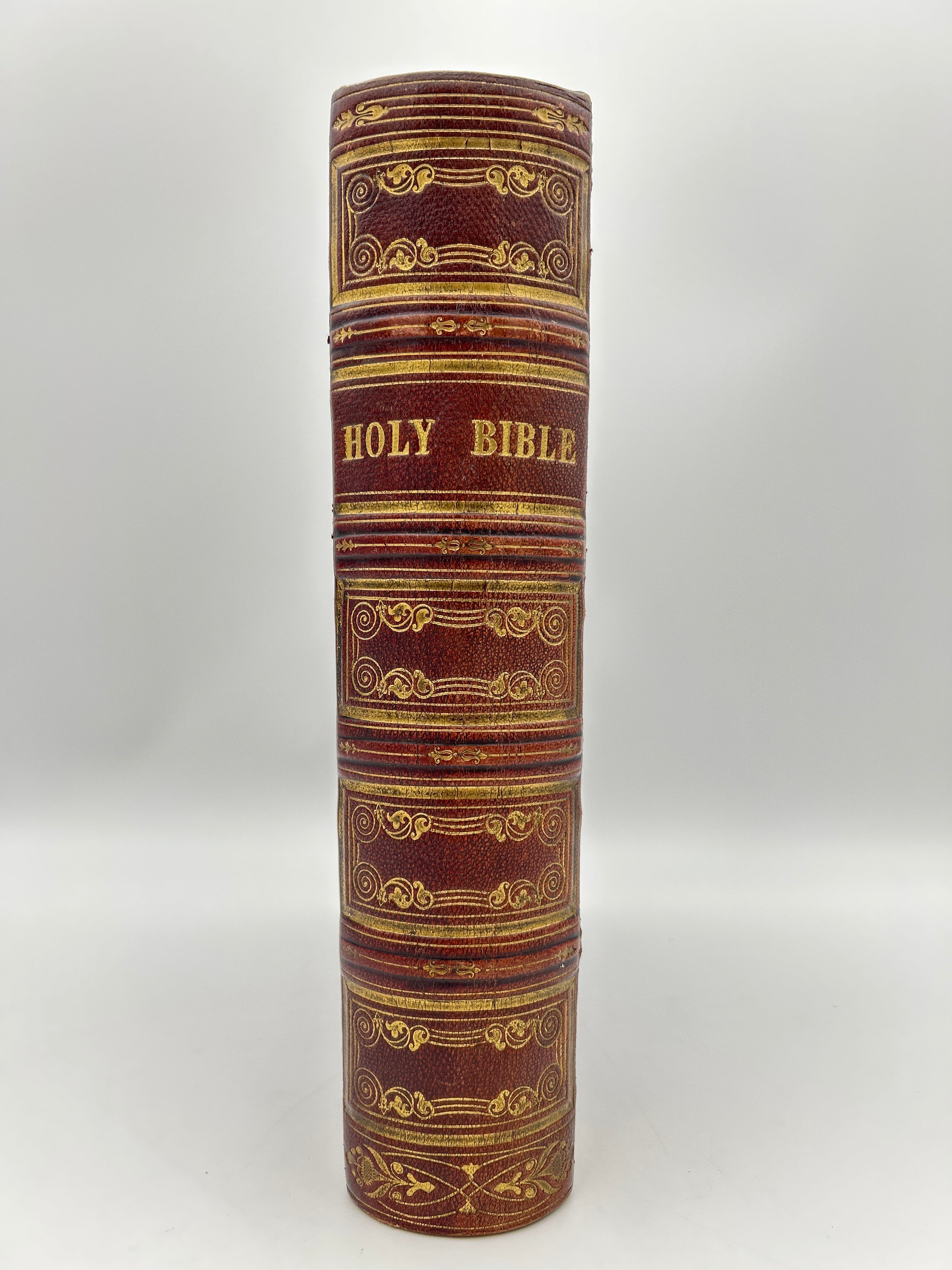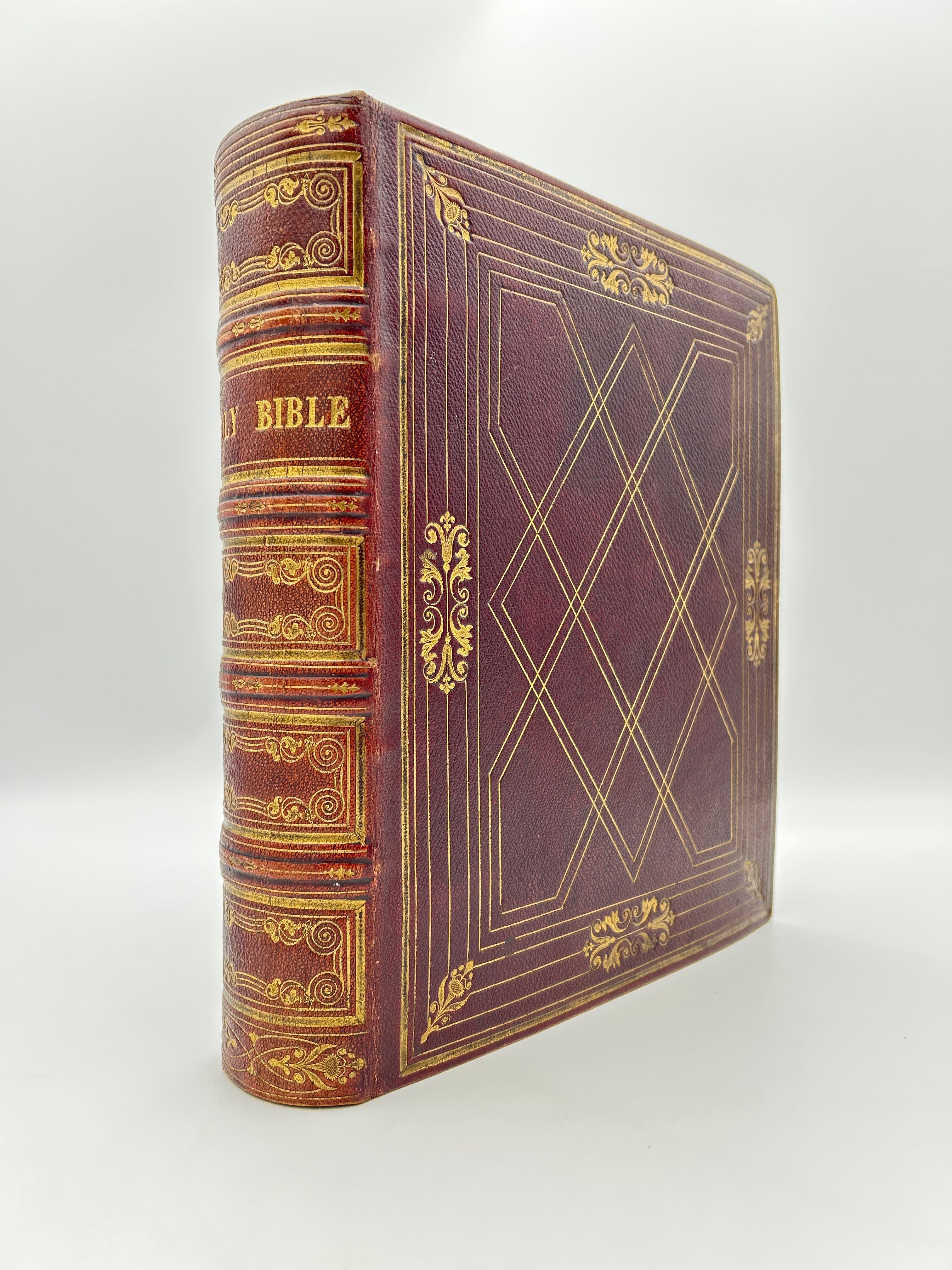 Large leather burgundy/gold tooled bible,  four raised bands with gold embossing between each band, ownership leather inset to Miss Margt Priestman on her marriage to Daniel Wheeler ESO, three edge gold, intact, very fine condition.