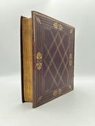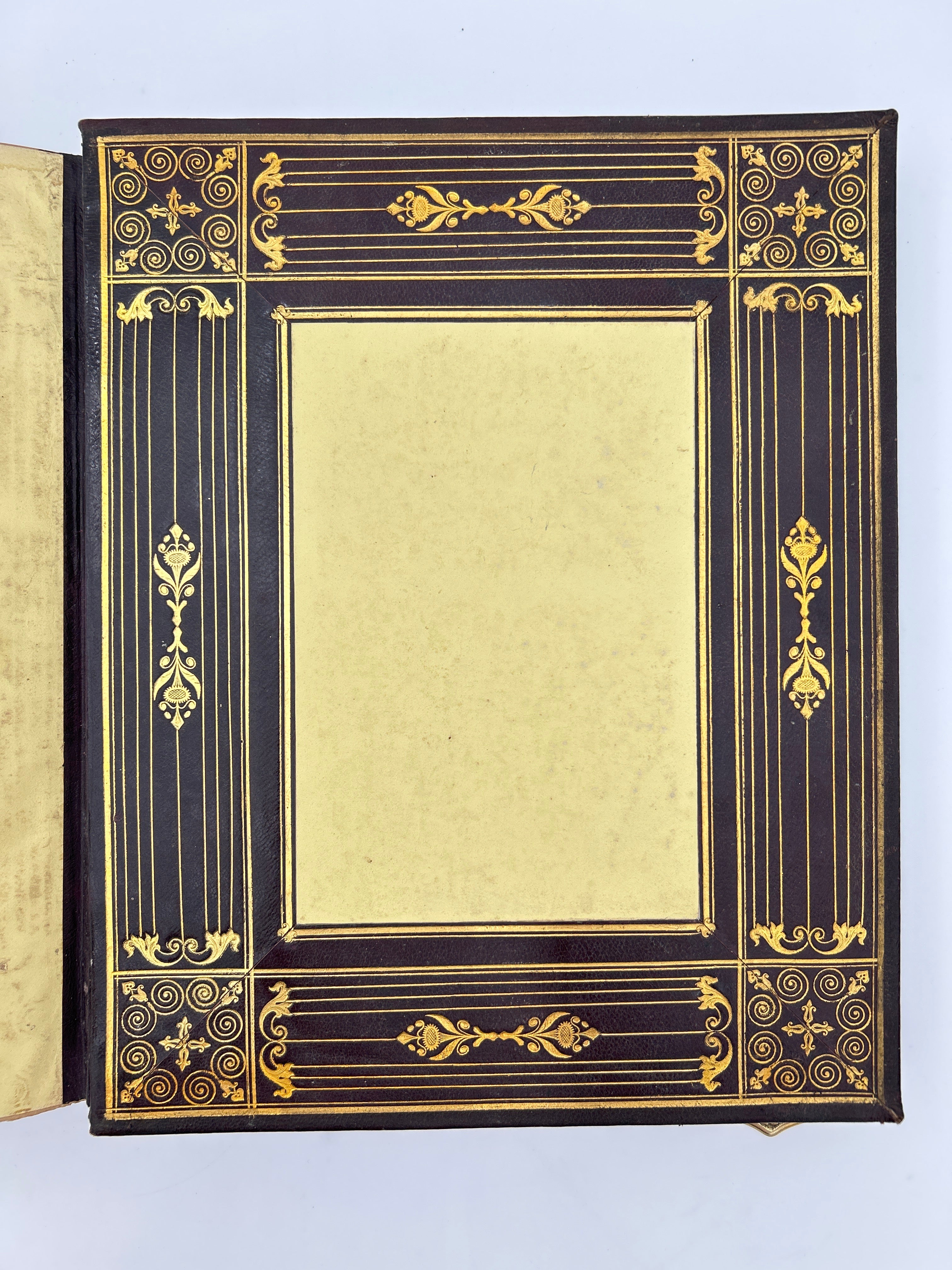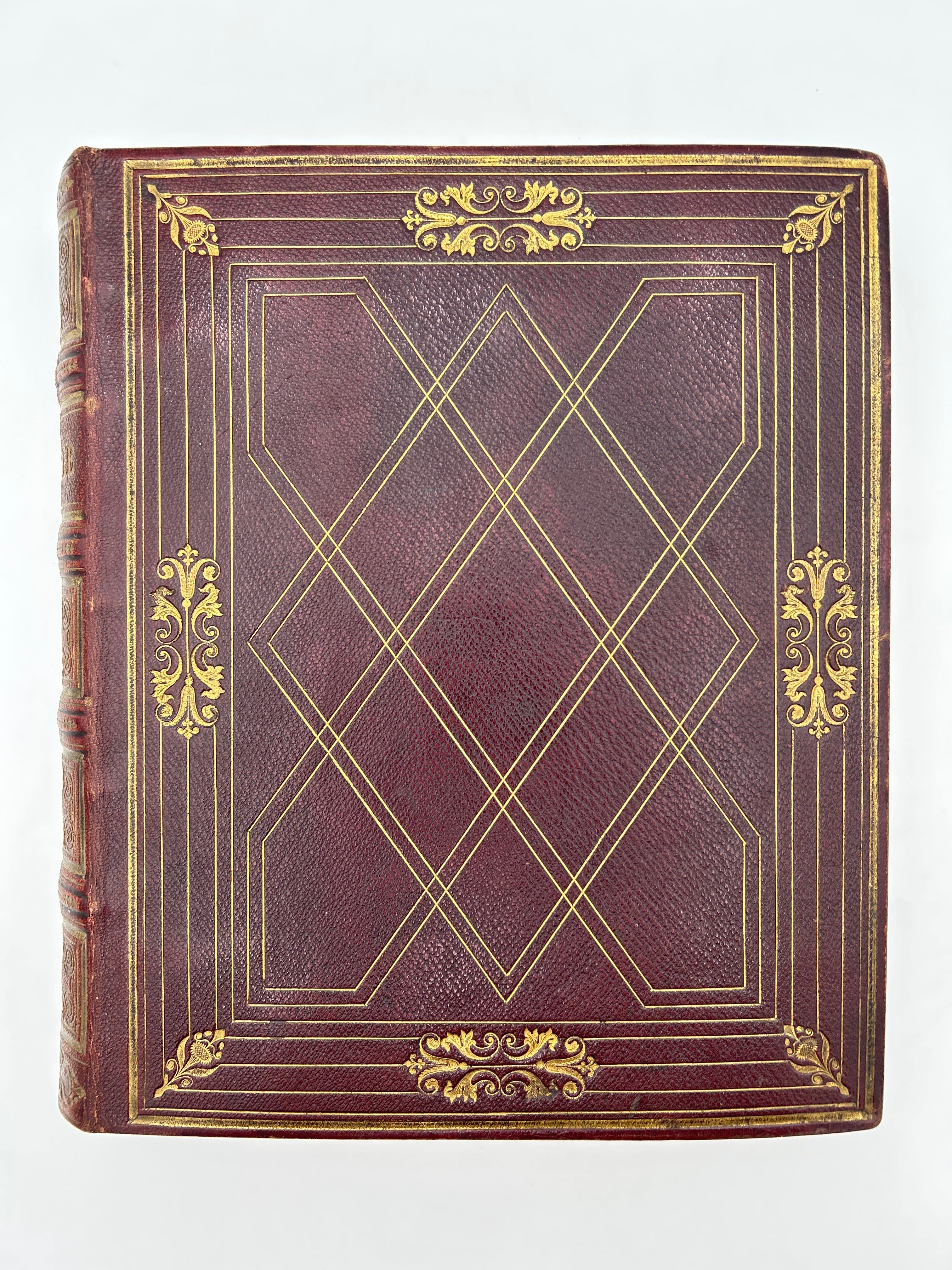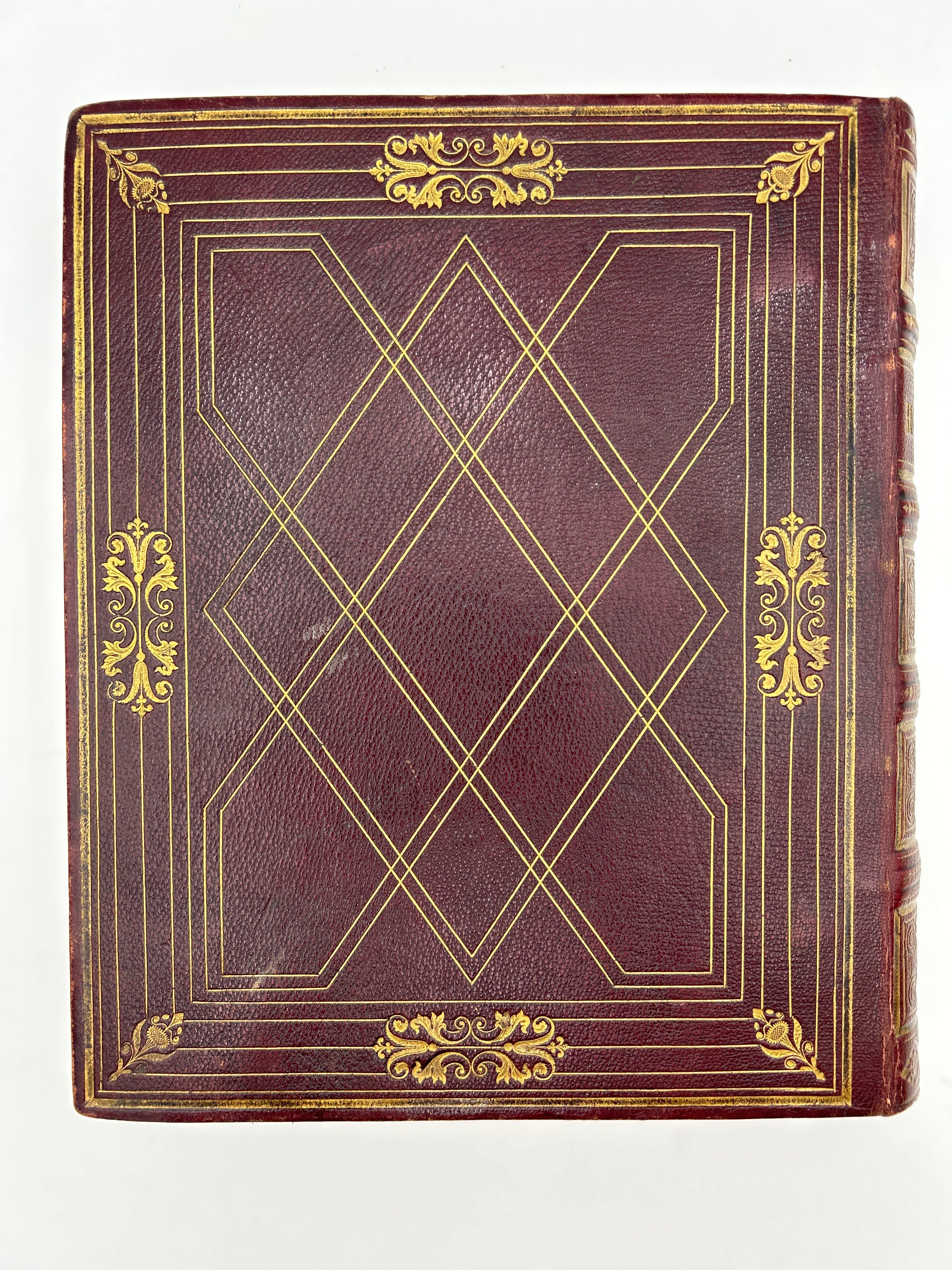 Large leather burgundy/gold tooled bible,  four raised bands with gold embossing between each band, ownership leather inset to Miss Margt Priestman on her marriage to Daniel Wheeler ESO, three edge gold, intact, very fine condition.