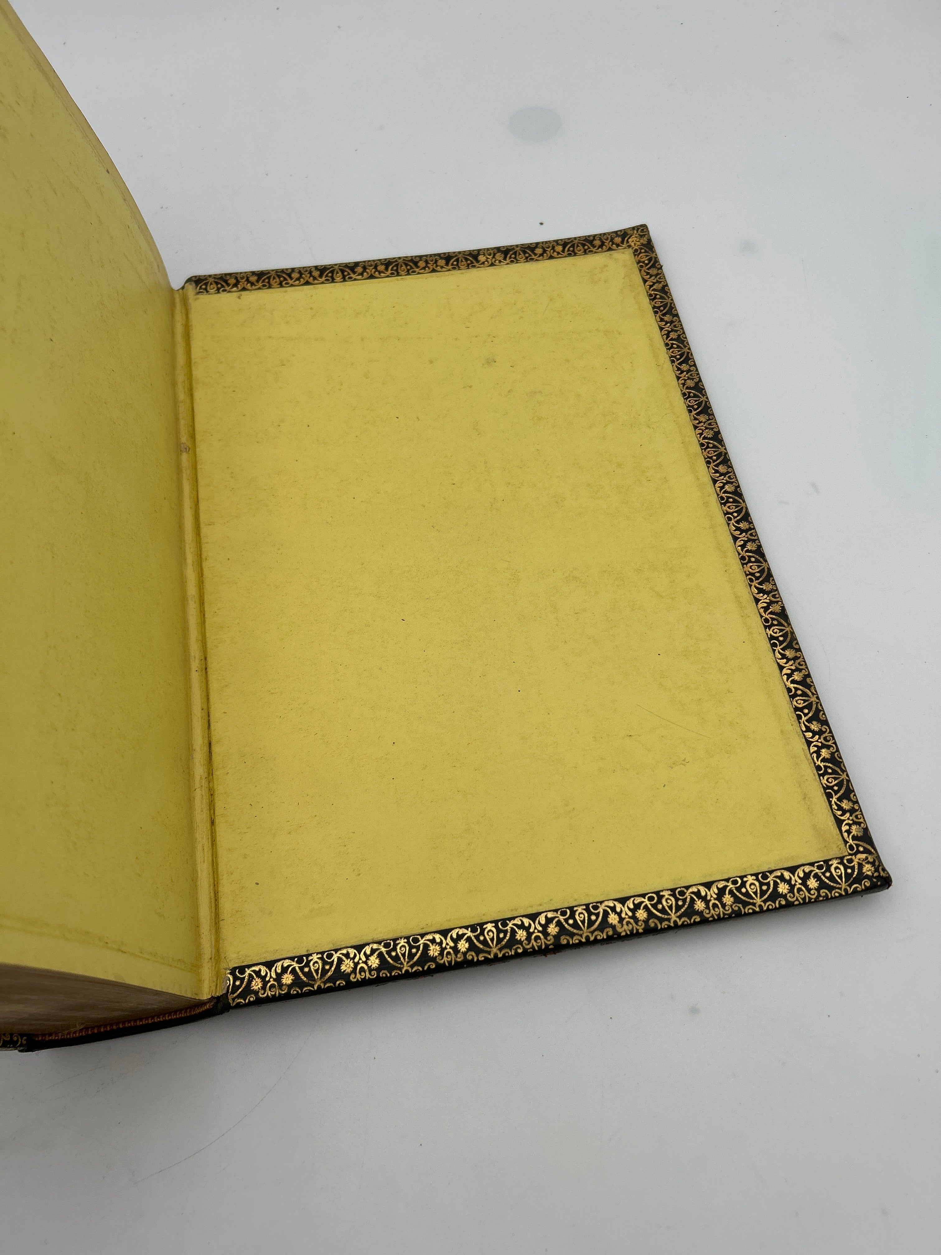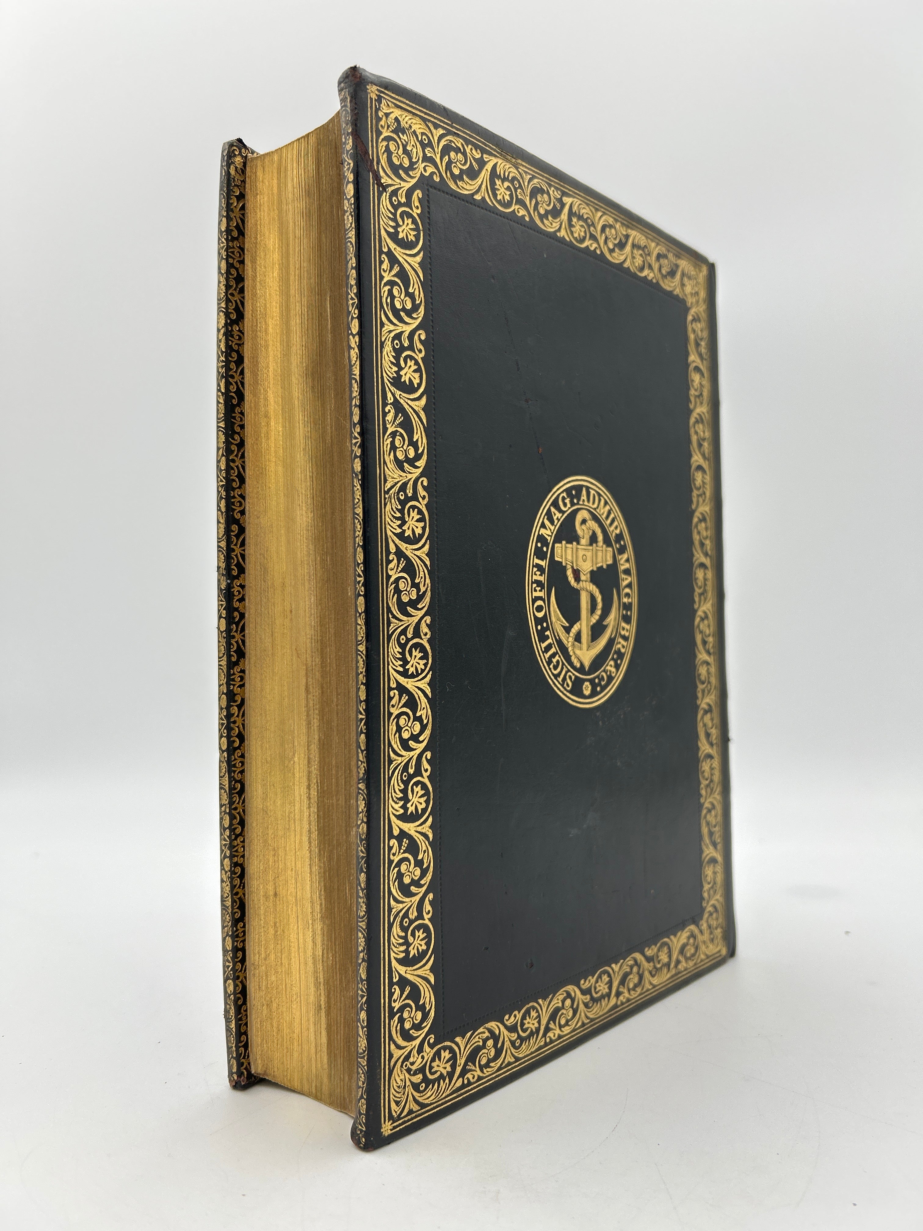 Black calf binding with gilt tooled border and in the center of the upper cover the Royal Arms and on the lower cover the seal fo the Lord High Admiral of Great Britain (the abbreviated words in Latin are around the edge of the seal - Sigil OffI Mag Admir Mag Br. Most holders of this post are members of the Royal Faimly or connected with the court. The presence of the Royal Arms on this handsome binding suggests a Royal connection.