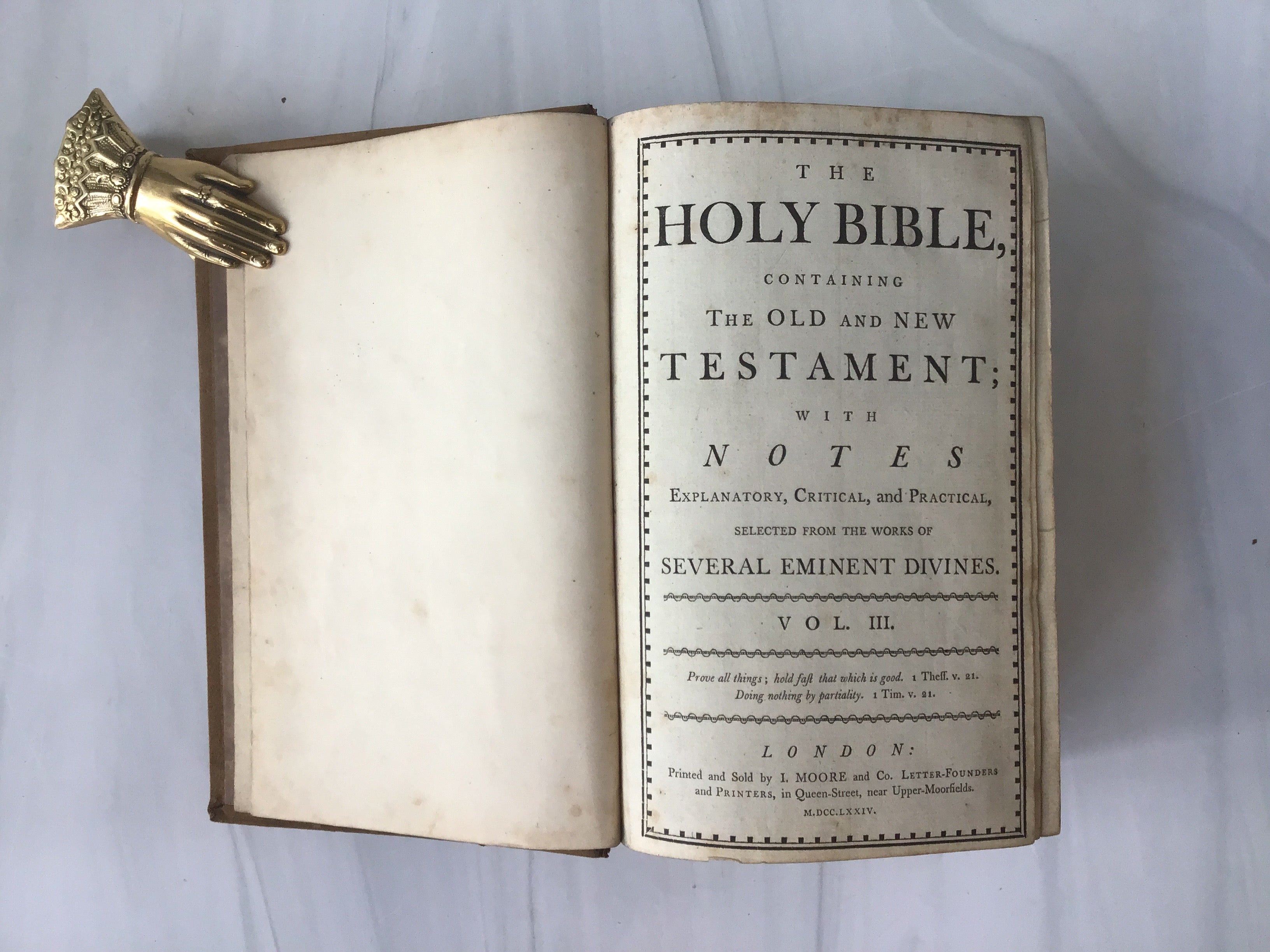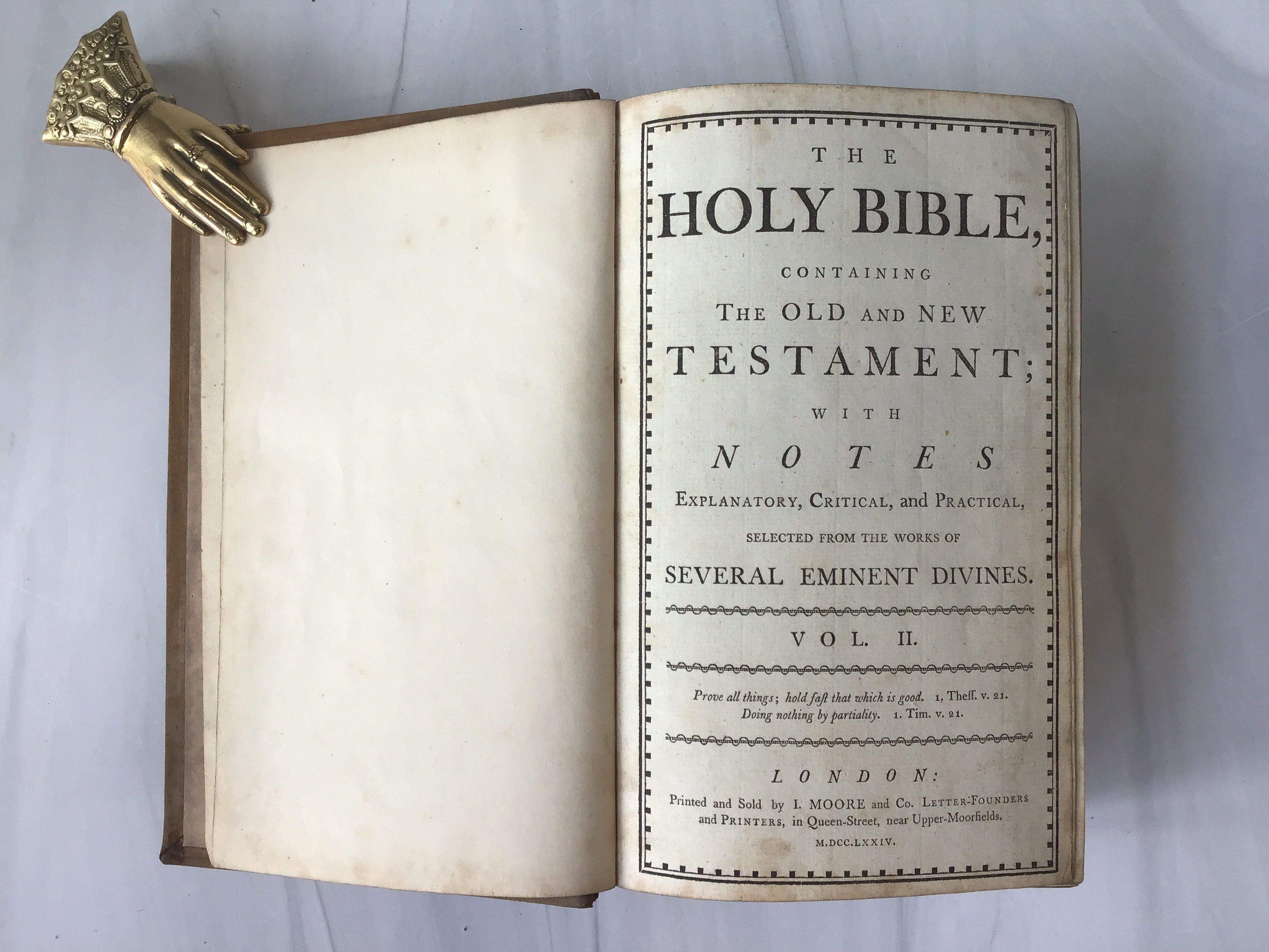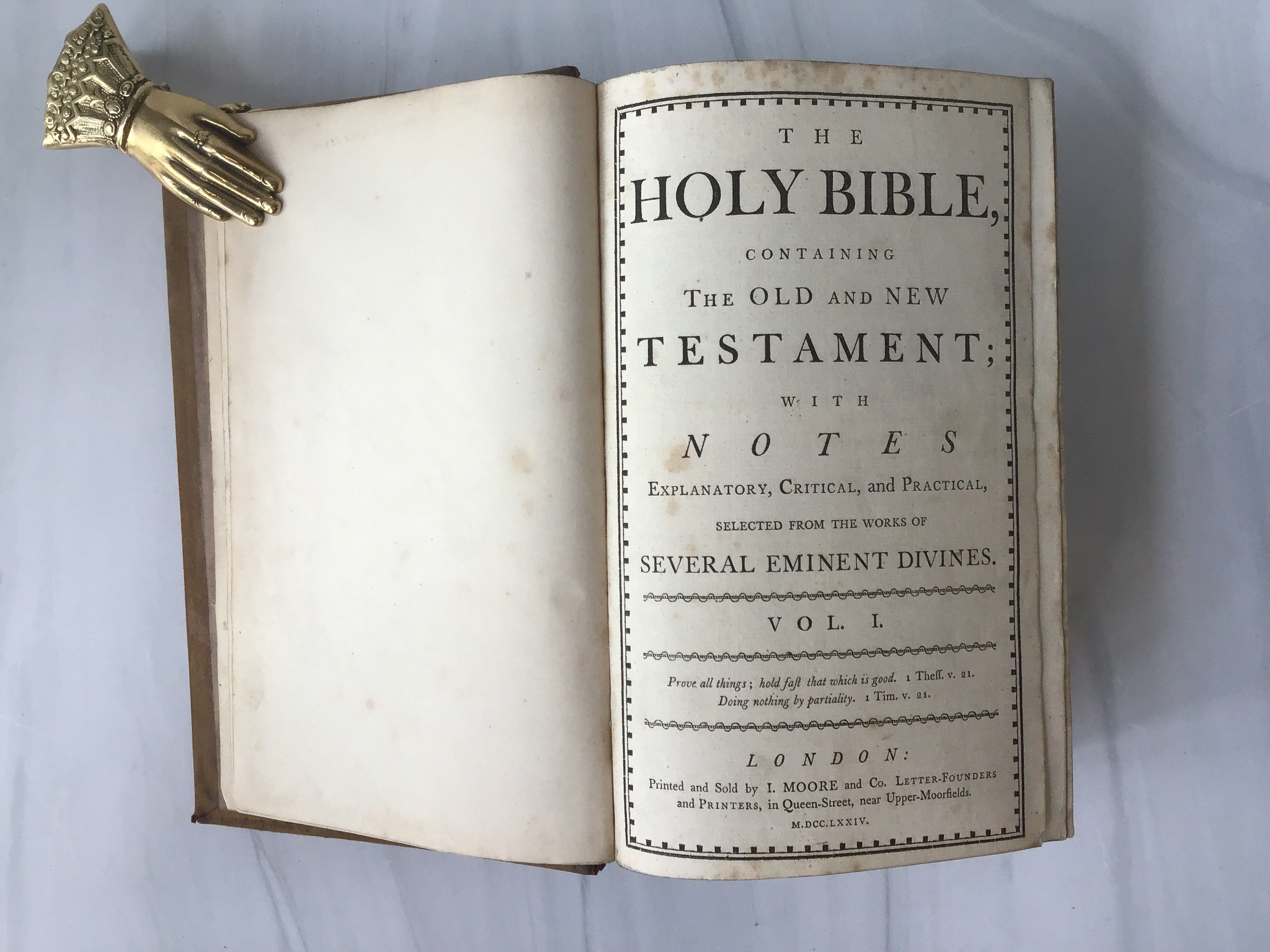The "Holy Bible 1774 Volumes 1-4" is a significant edition of the Christian scriptures, printed in the 18th century. This particular edition is notable for its historical and scholarly value, reflecting the language, religious interpretations, and cultural context of the time. Spanning four volumes, it includes both the Old and New Testaments, meticulously translated and annotated to aid in theological study and personal devotion. Collectors and historians highly regard this edition for its craftsmanship and its role in the dissemination of biblical literature during that period.