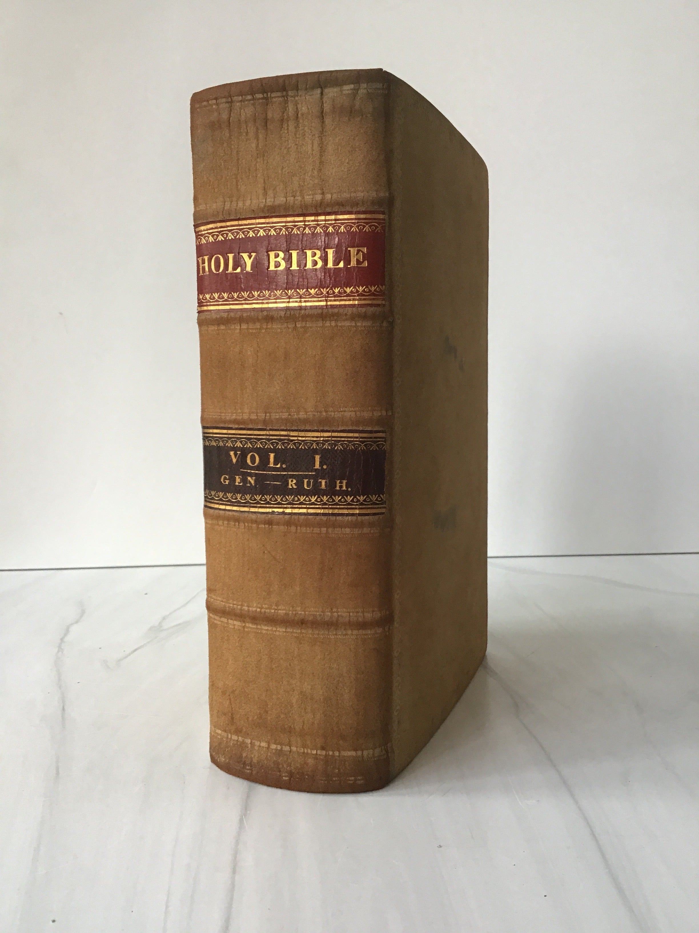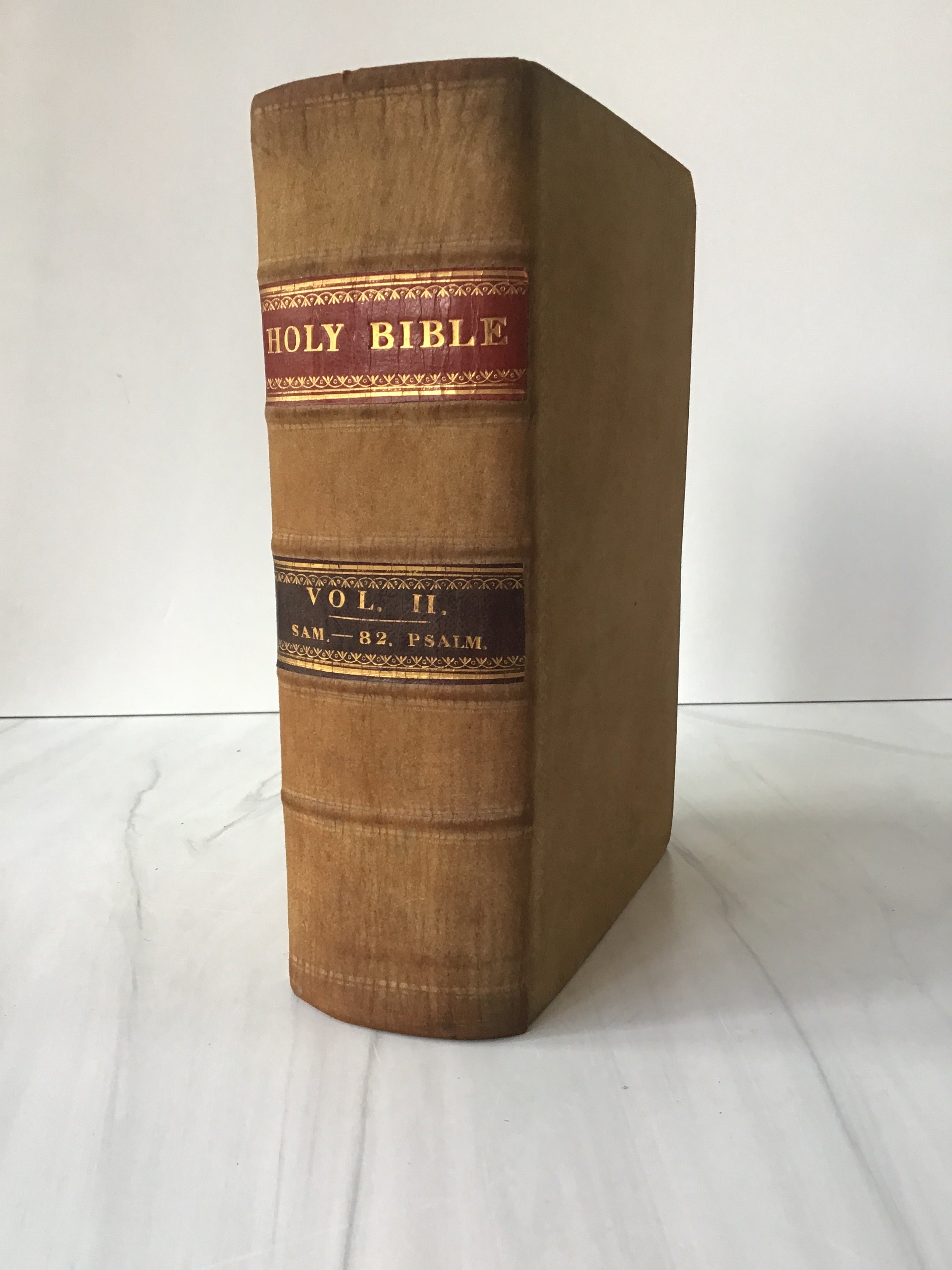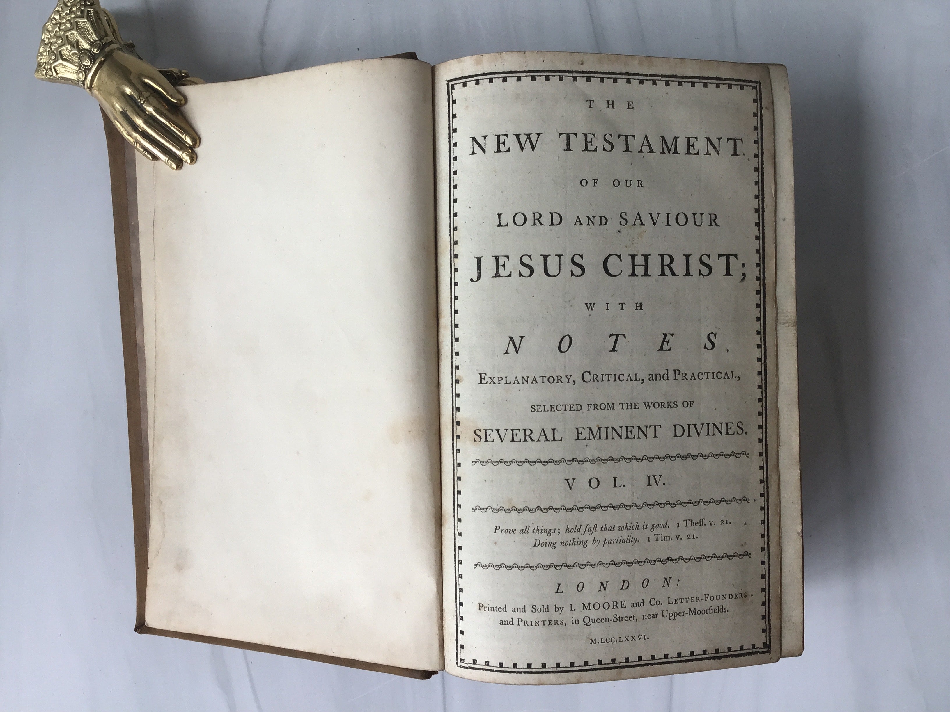 The "Holy Bible 1774 Volumes 1-4" is a significant edition of the Christian scriptures, printed in the 18th century. This particular edition is notable for its historical and scholarly value, reflecting the language, religious interpretations, and cultural context of the time. Spanning four volumes, it includes both the Old and New Testaments, meticulously translated and annotated to aid in theological study and personal devotion. Collectors and historians highly regard this edition for its craftsmanship and its role in the dissemination of biblical literature during that period.