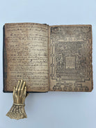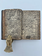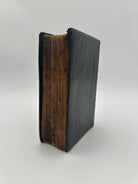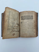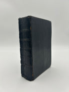 Black leather binding, rebound in the 1800's, slight cracking on front inside edge, five raised bands on spine, front edge marbling, rare illustrated genealogies in front, intact, overall very good condition.