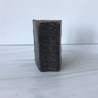 Brown leather binding, four raised bands on spin, tooling on entire binding, pocket size, brackets missing, right corner of title page torn, fully intact,