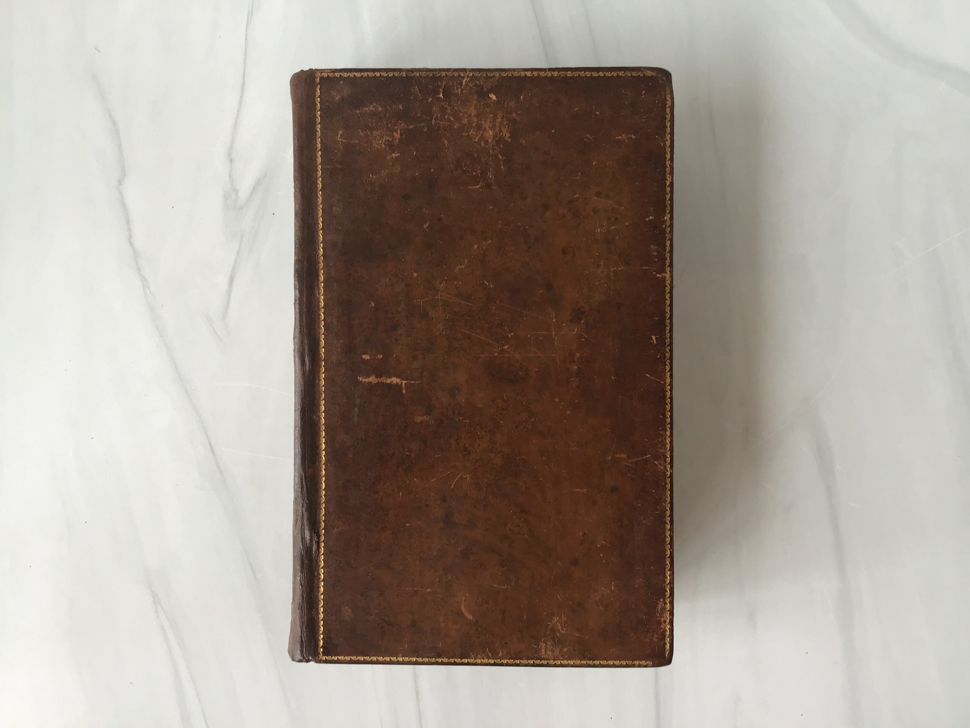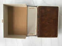 Brown leather with gold tooling around edge, beautiful spine with gold tooling design and bible label, three edge marbling, intact, clam shell encasing lovely bible, very good condition