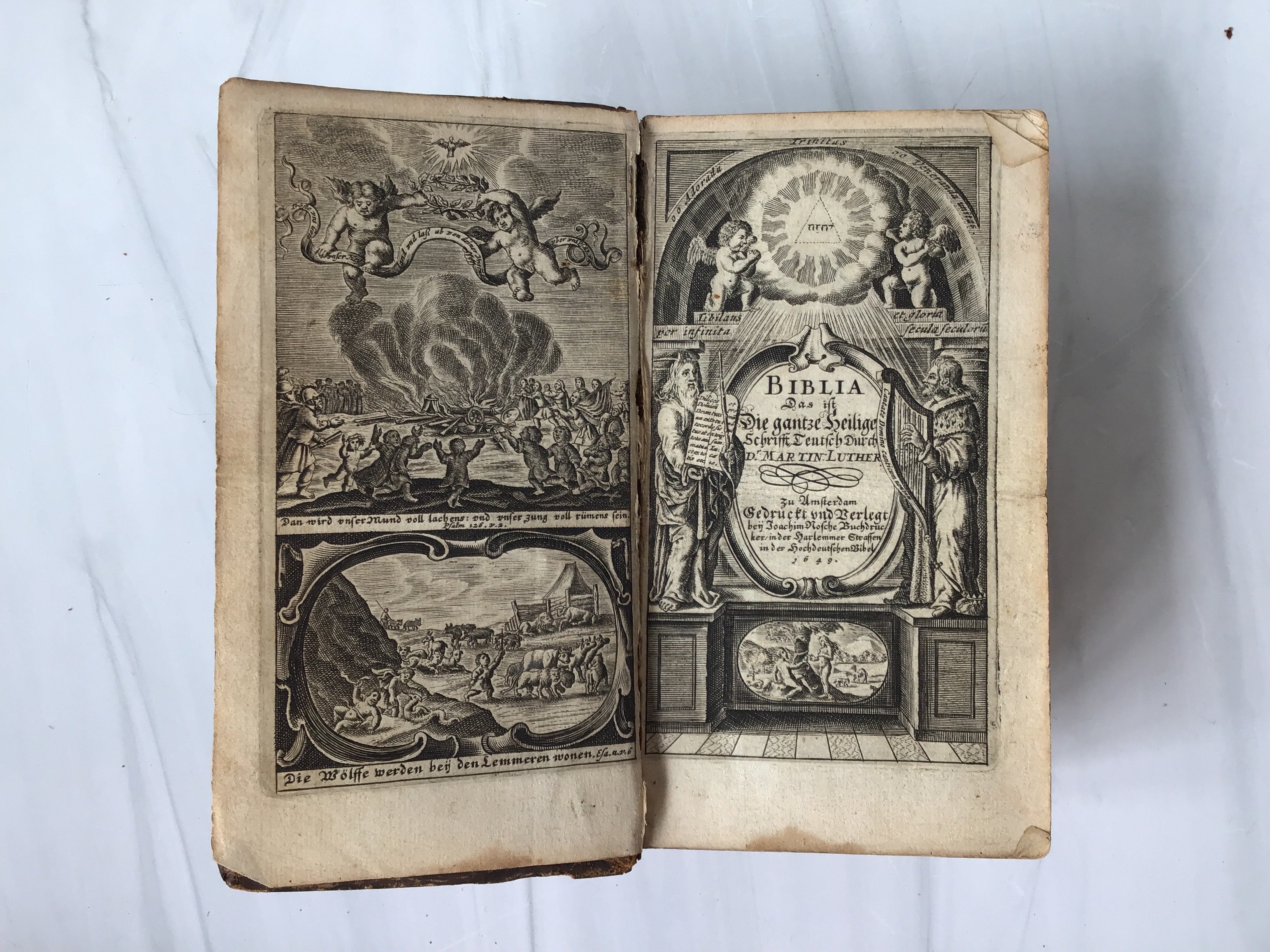 Brown leather, engraved half-title and frontispiece, only Luther Bible printed in Amsterdam, some cracking to joints, all edges gild with gaufering to top and bottom edges at spine, four raised bands, good/fair condition