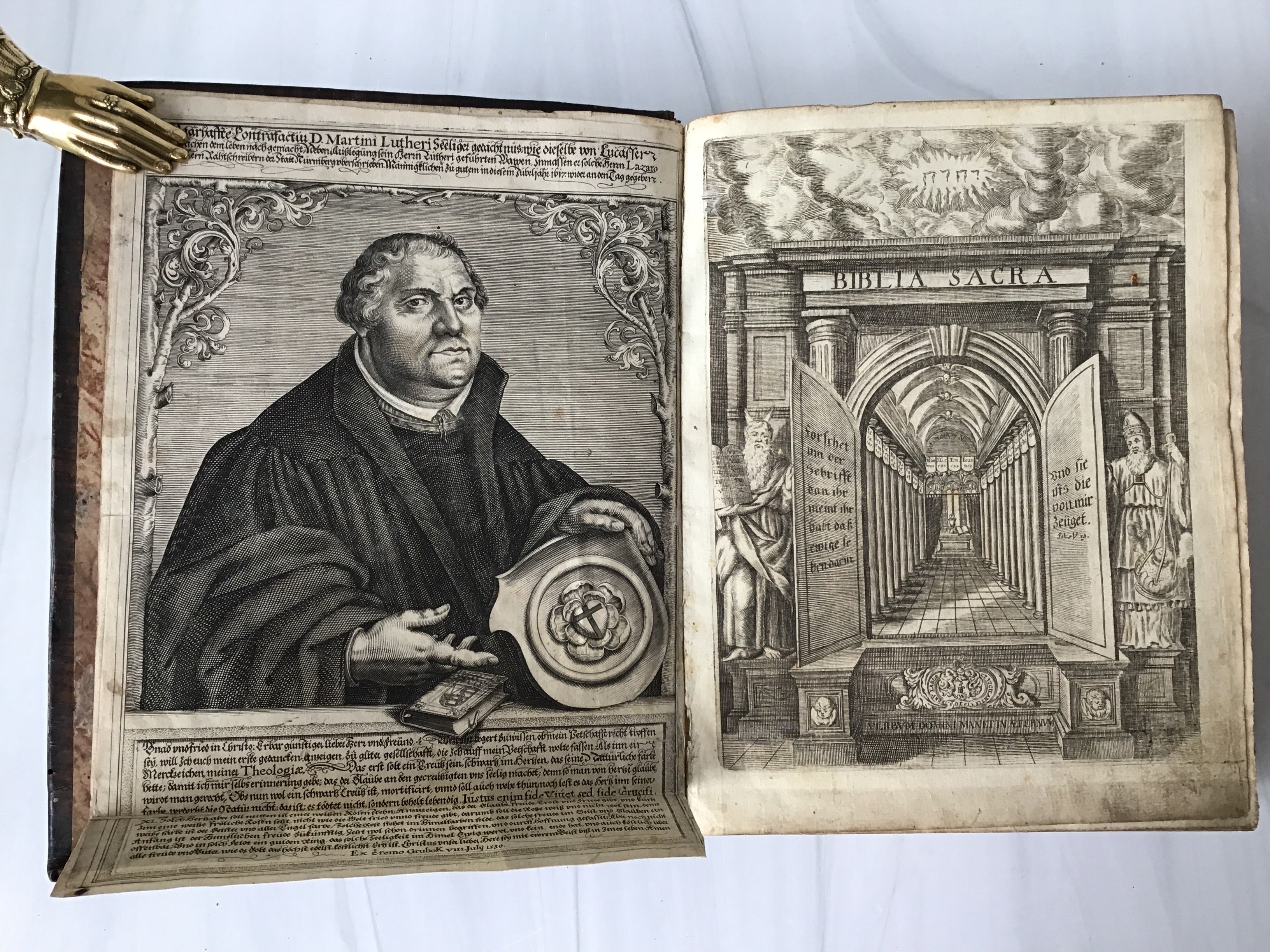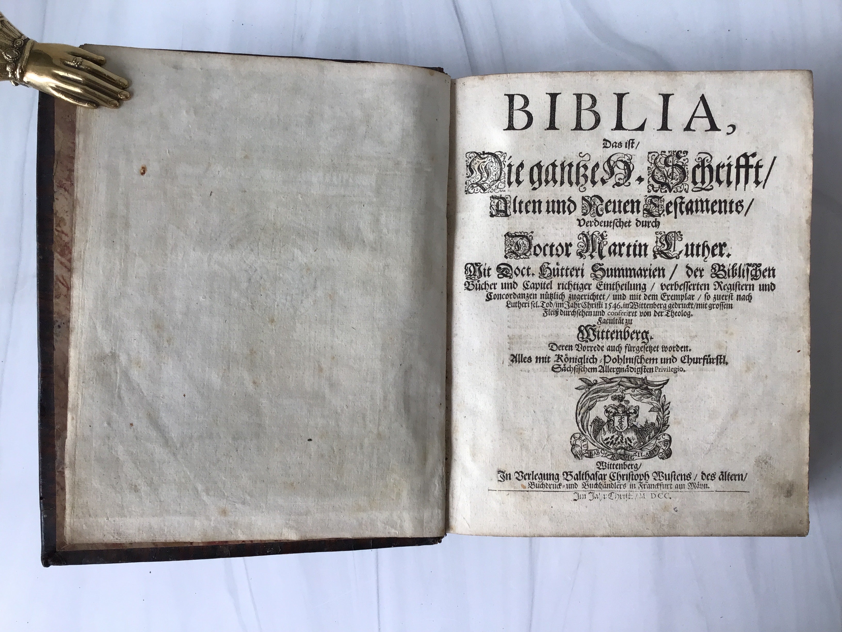 Notes: This exquisite Martin Luther German Bible, printed in 1700, is a remarkable piece of religious and historical significance. Featuring Martin Luther's translation of the Bible into German, this edition showcases the linguistic and typographic standards of early 18th-century Germany. This Bible played a crucial role in making the scriptures accessible to the German-speaking public and in shaping the modern German language.