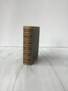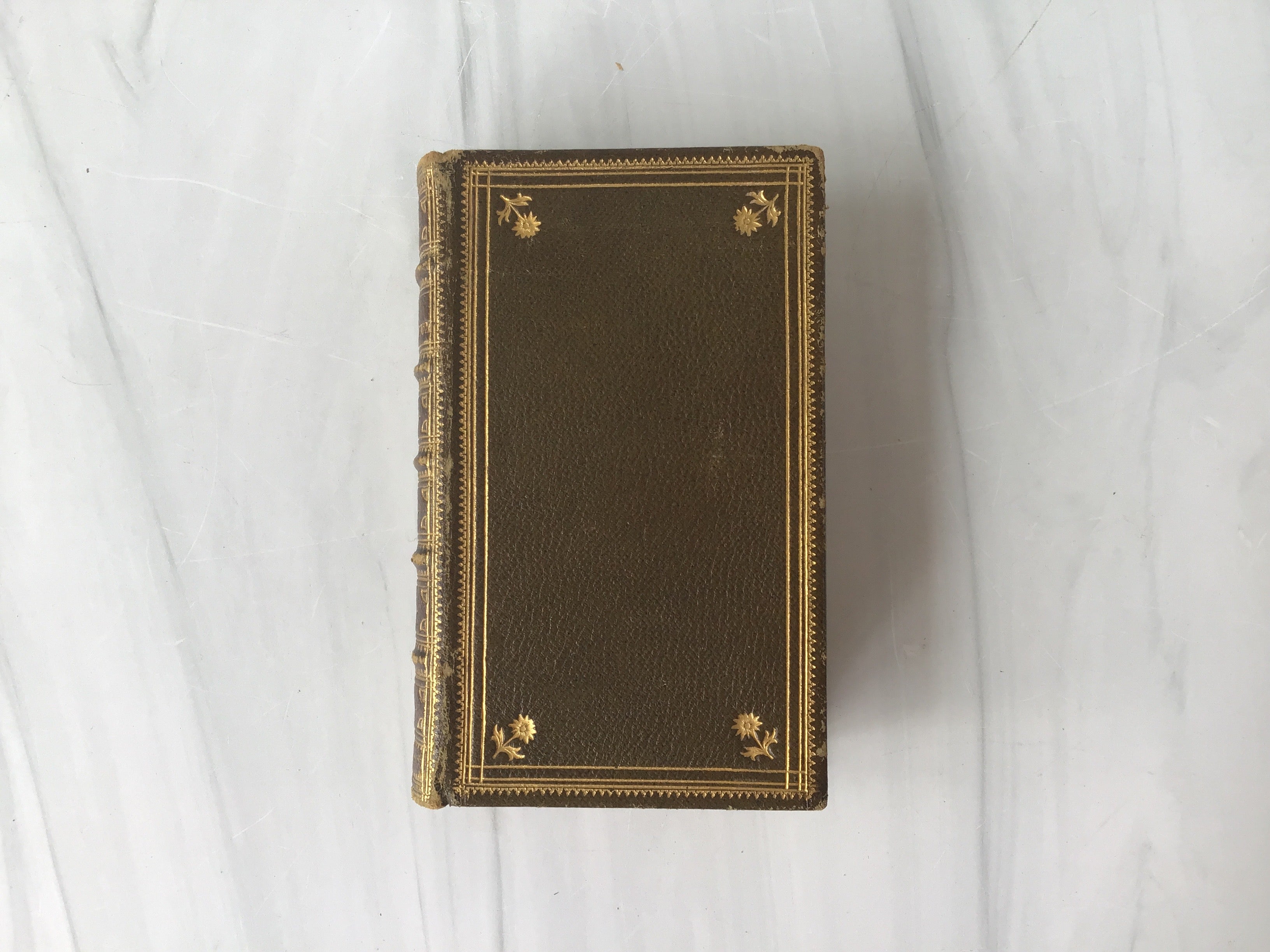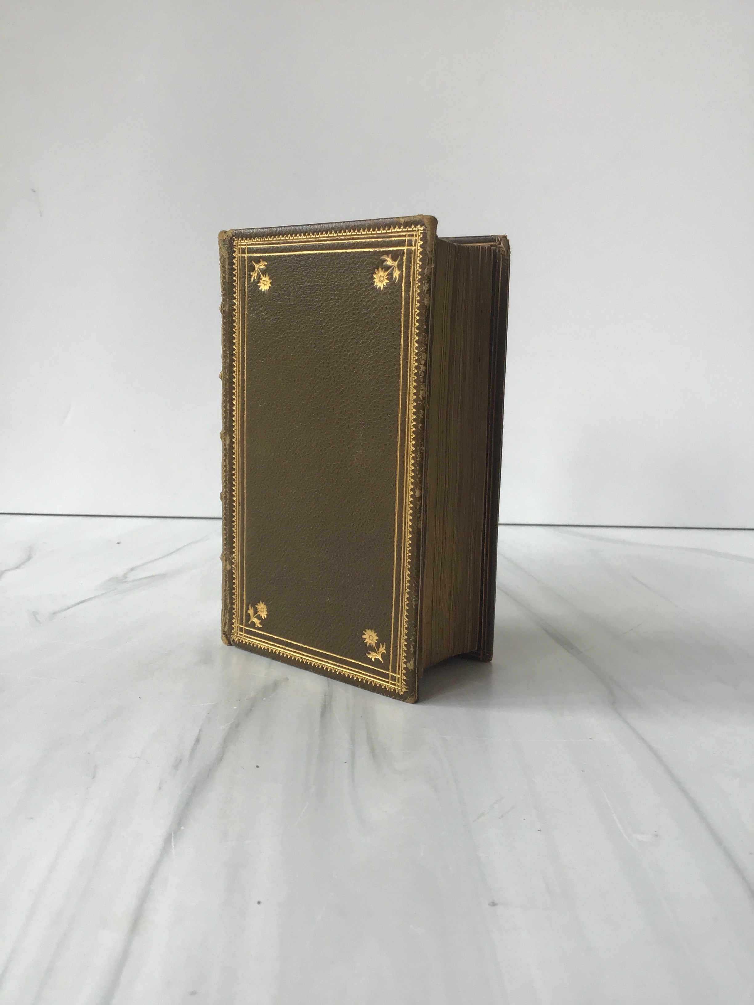 Beautiful olive green leather pocket edition, five raised bands on spine, gold tooling on front, back and spine, three edge gilt, each page neatly ruled in red with wood cut illustrations, very good condition.