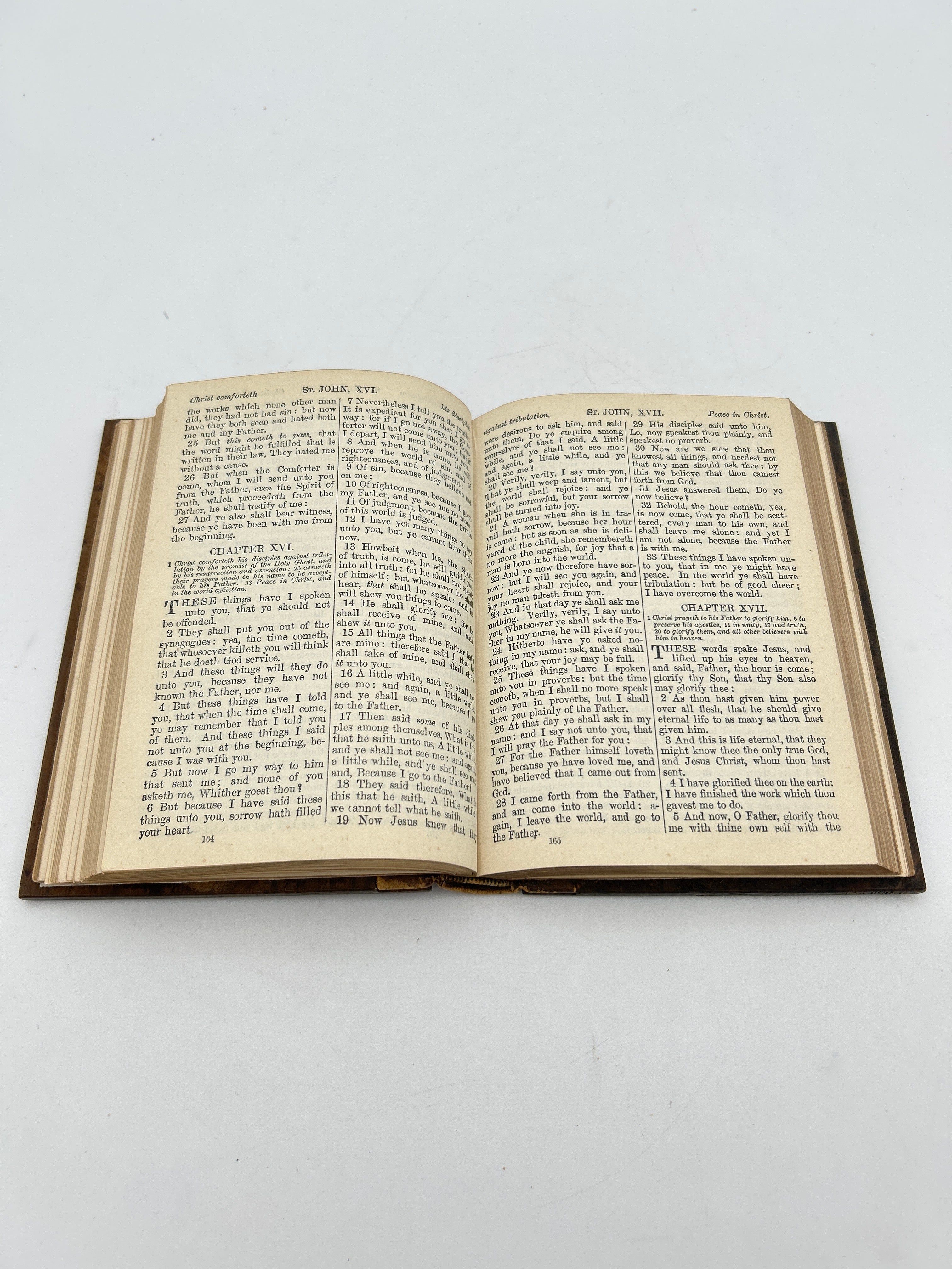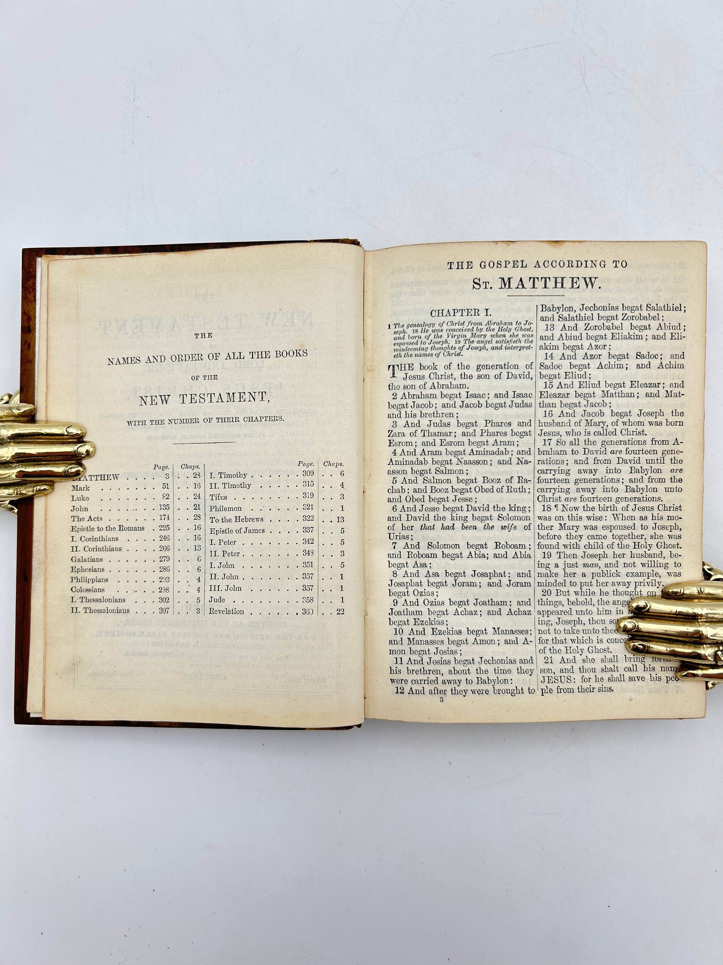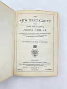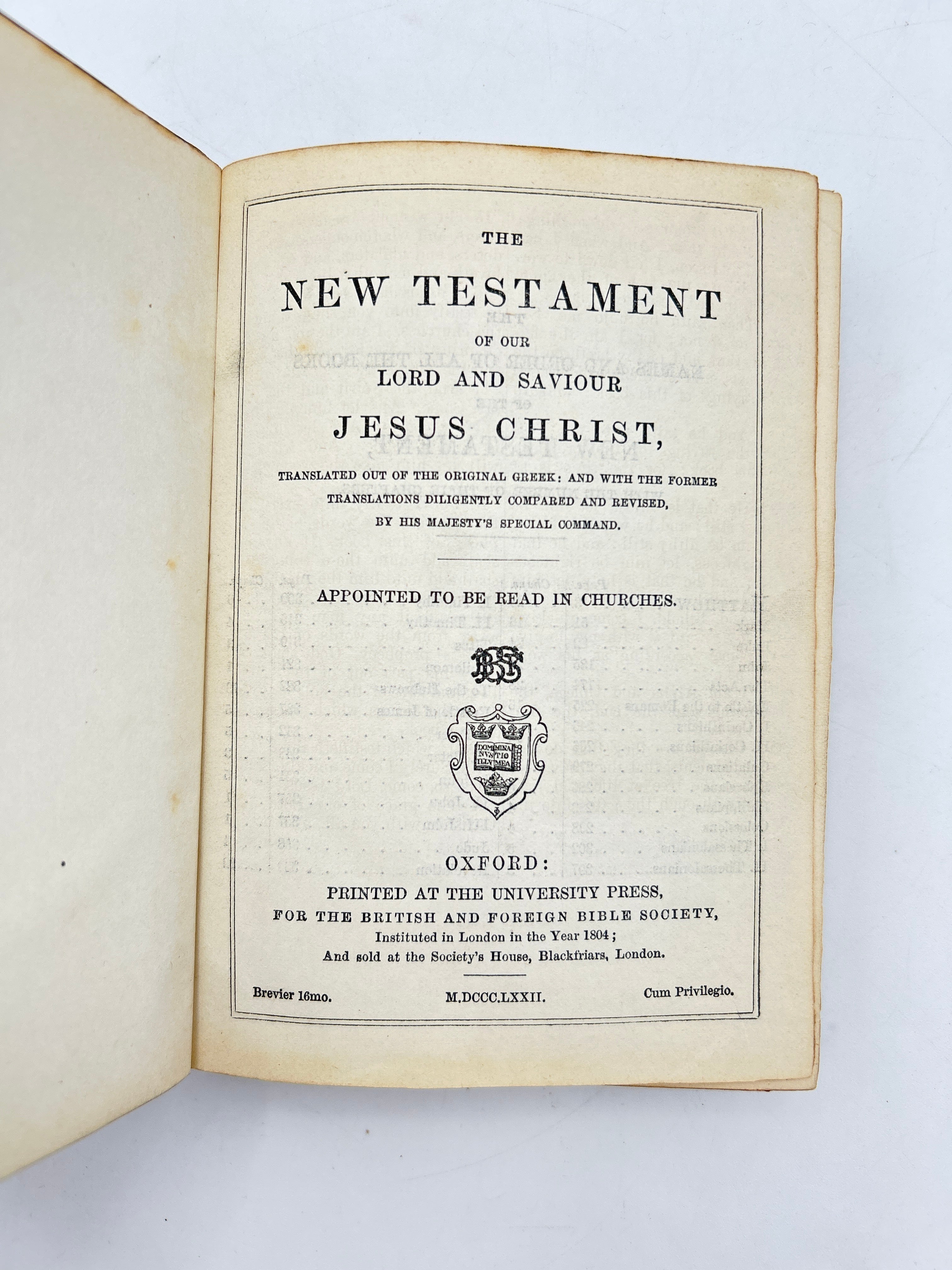 The New Testament printed at Oxford in 1872 is most likely an English edition of the King James Version, published by the esteemed Oxford University Press. Known for its high-quality printing and scholarly accuracy, this edition would typically feature a classic double-column layout, traditional serif typeface, and possibly marginal notes or cross-references. Depending on the binding—ranging from plain cloth to ornate leather with gilt edges—its value today can vary, though it holds more historical than monetary worth unless it's in pristine condition or part of a rare edition. Such a volume reflects the enduring legacy of 19th-century religious publishing in England.