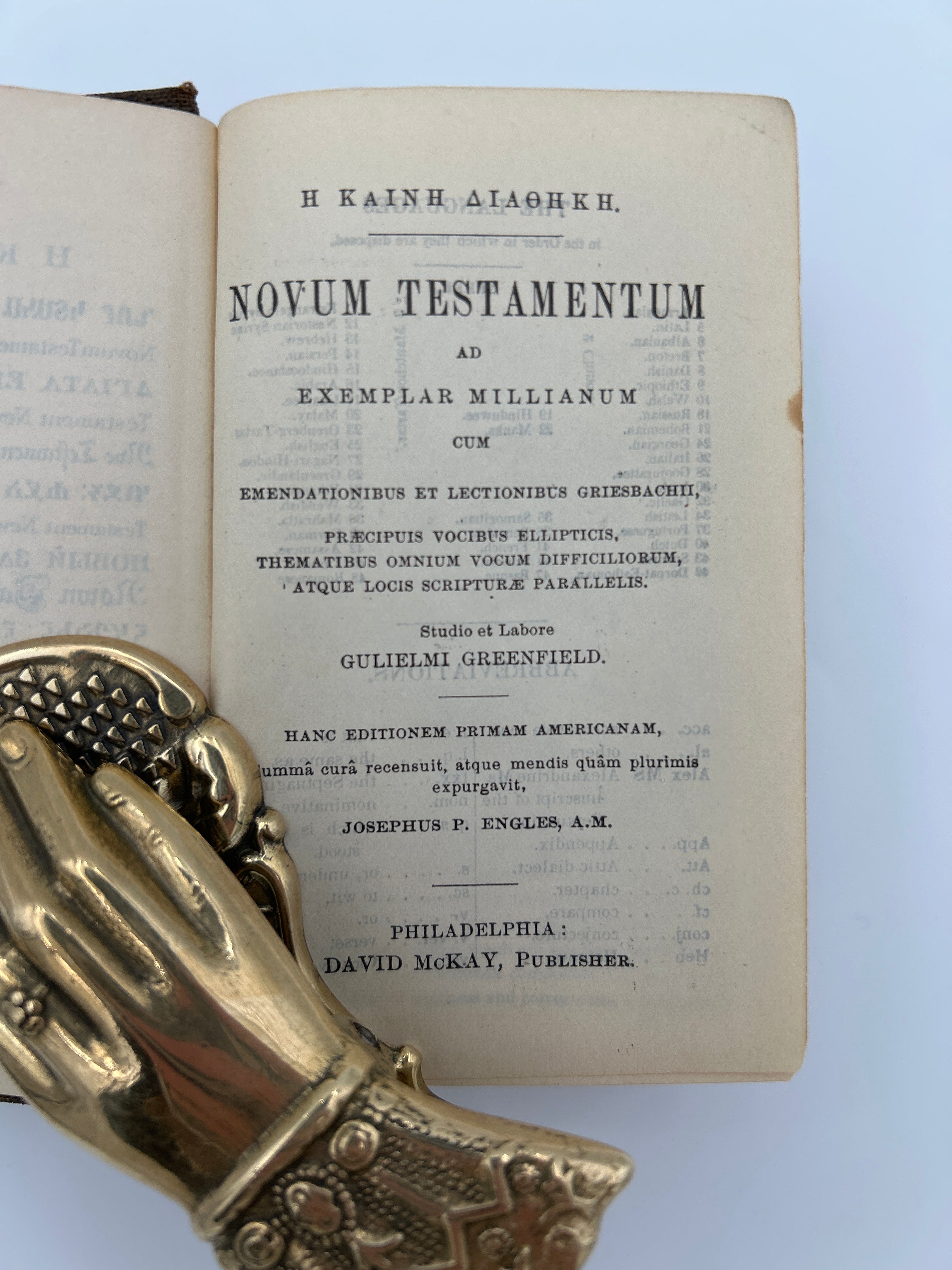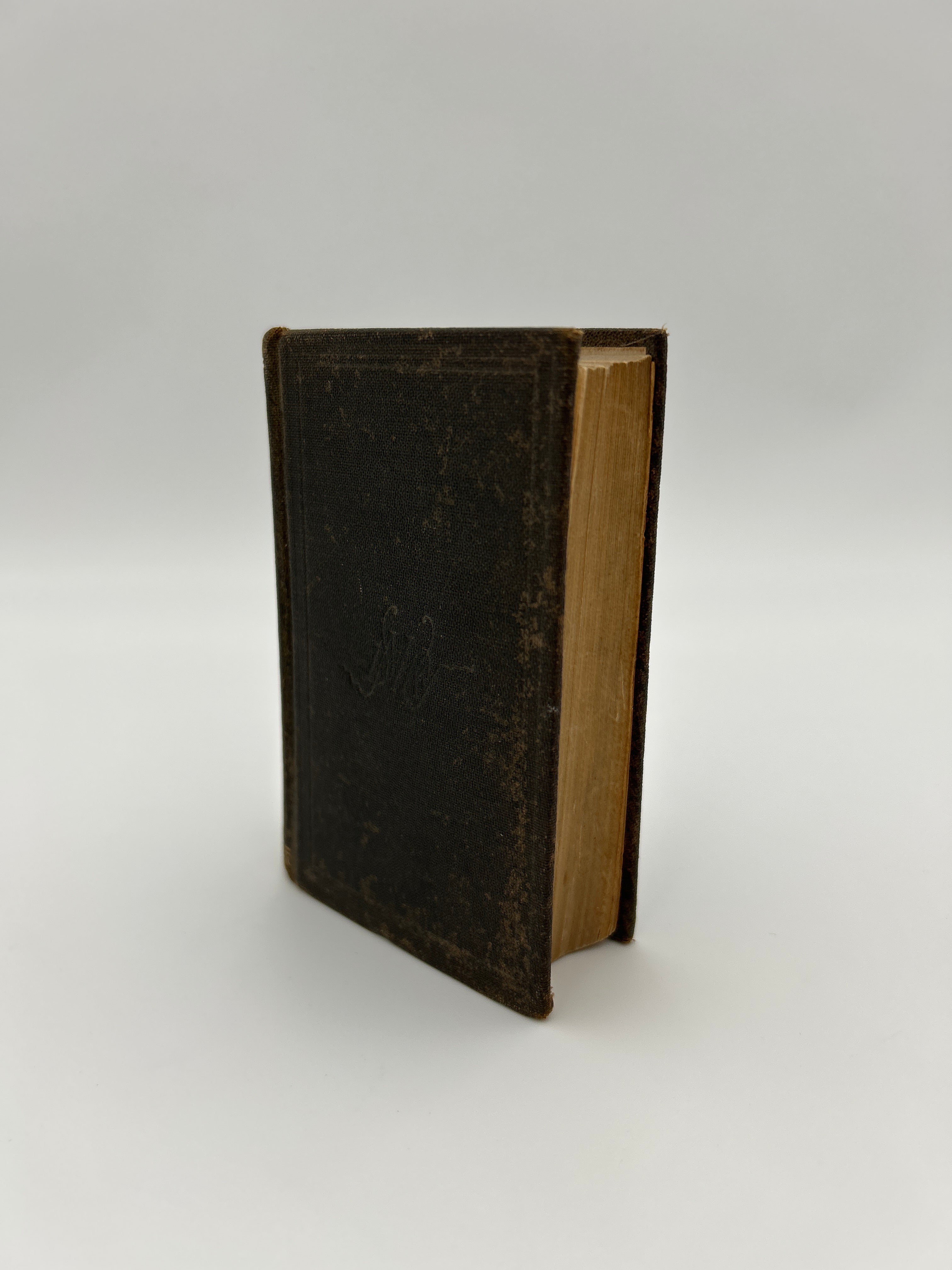 Brown cloth, pocket size book with gold lettering on spine, some splitting on inside cover, overall good condition.